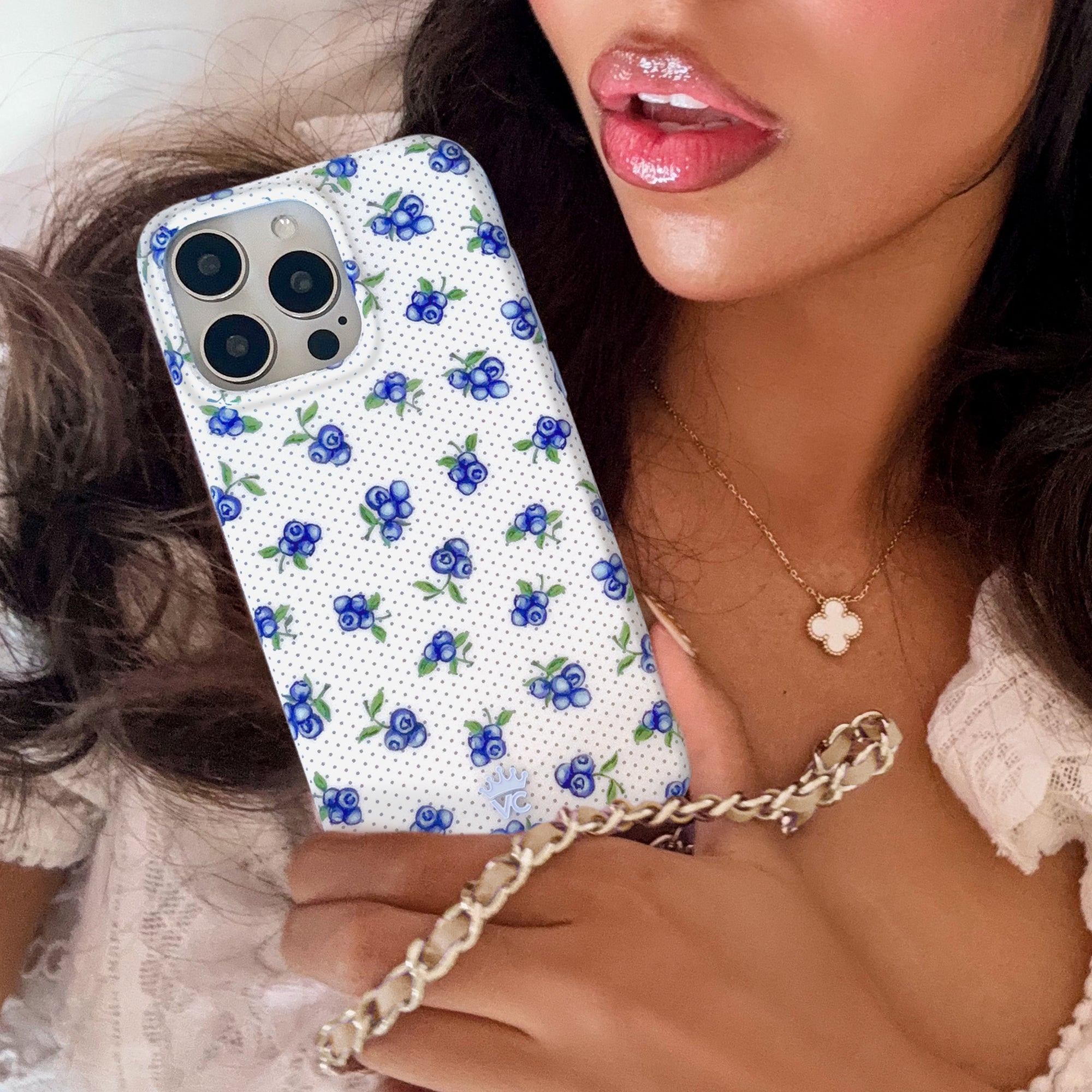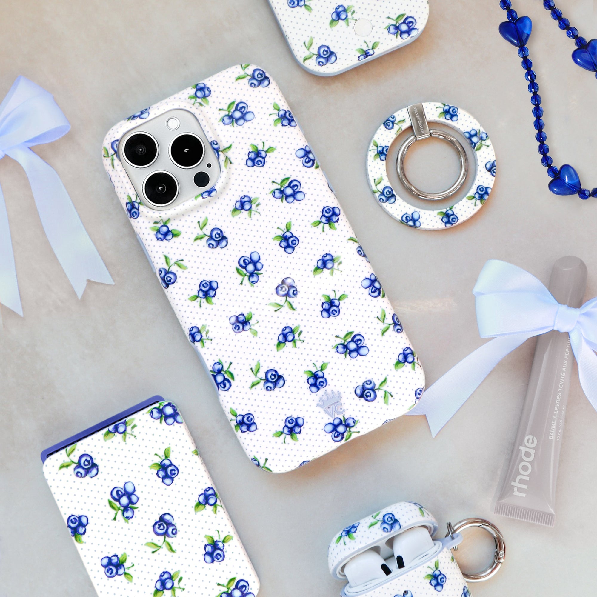 So berry cute! This Limited Edition MagSafe case features an array of watercolor blueberries on a glossy white base with small polka dots throughout and a light blue bumper.