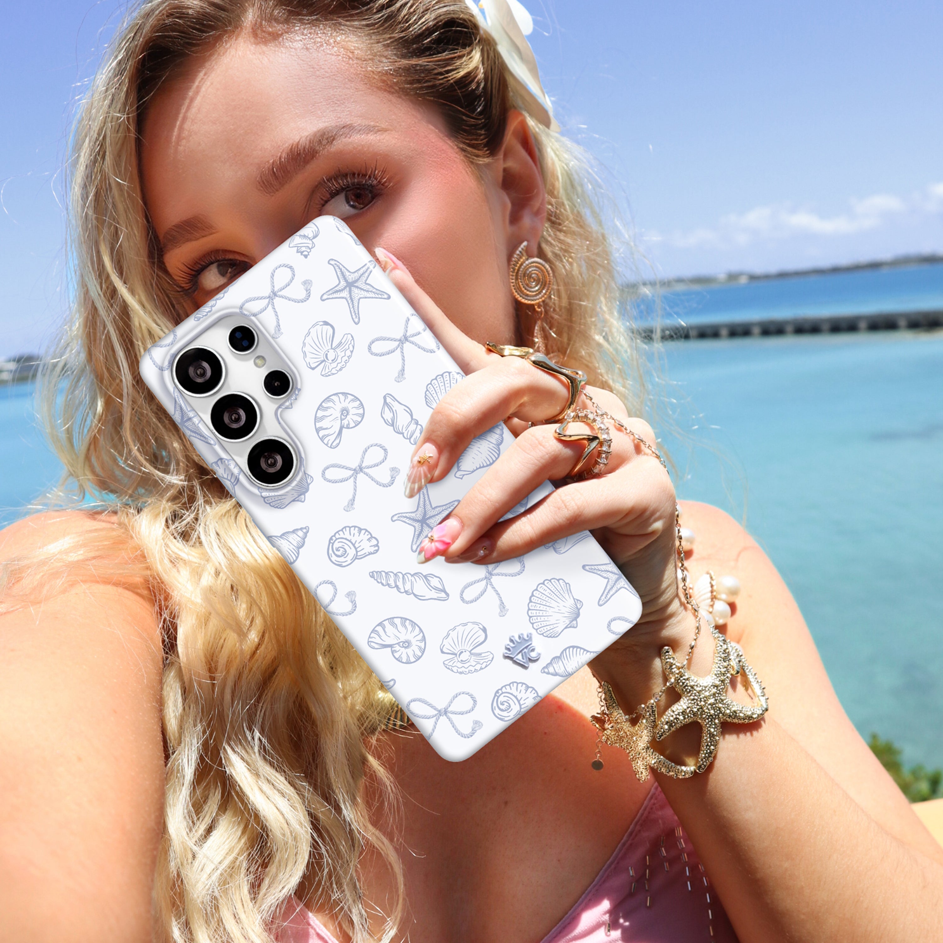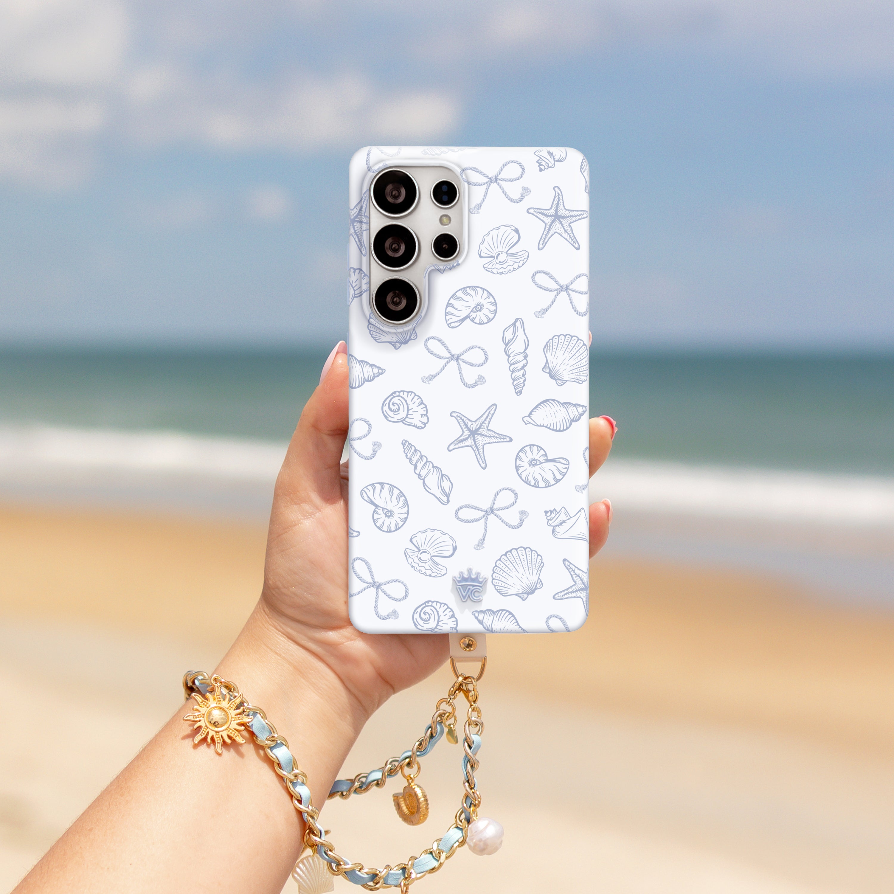 Ocean Air and Coastal Vibes! This protective phone case features nautical blue shells, bows, and starfish all on a glossy off white base.