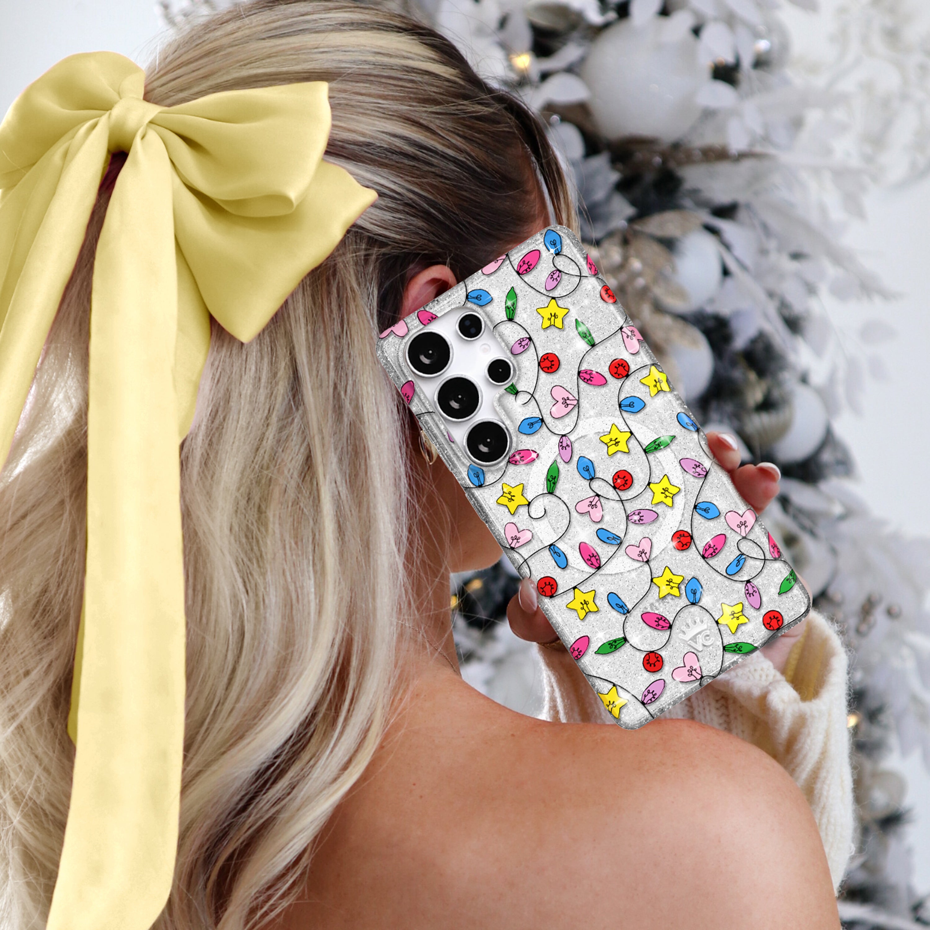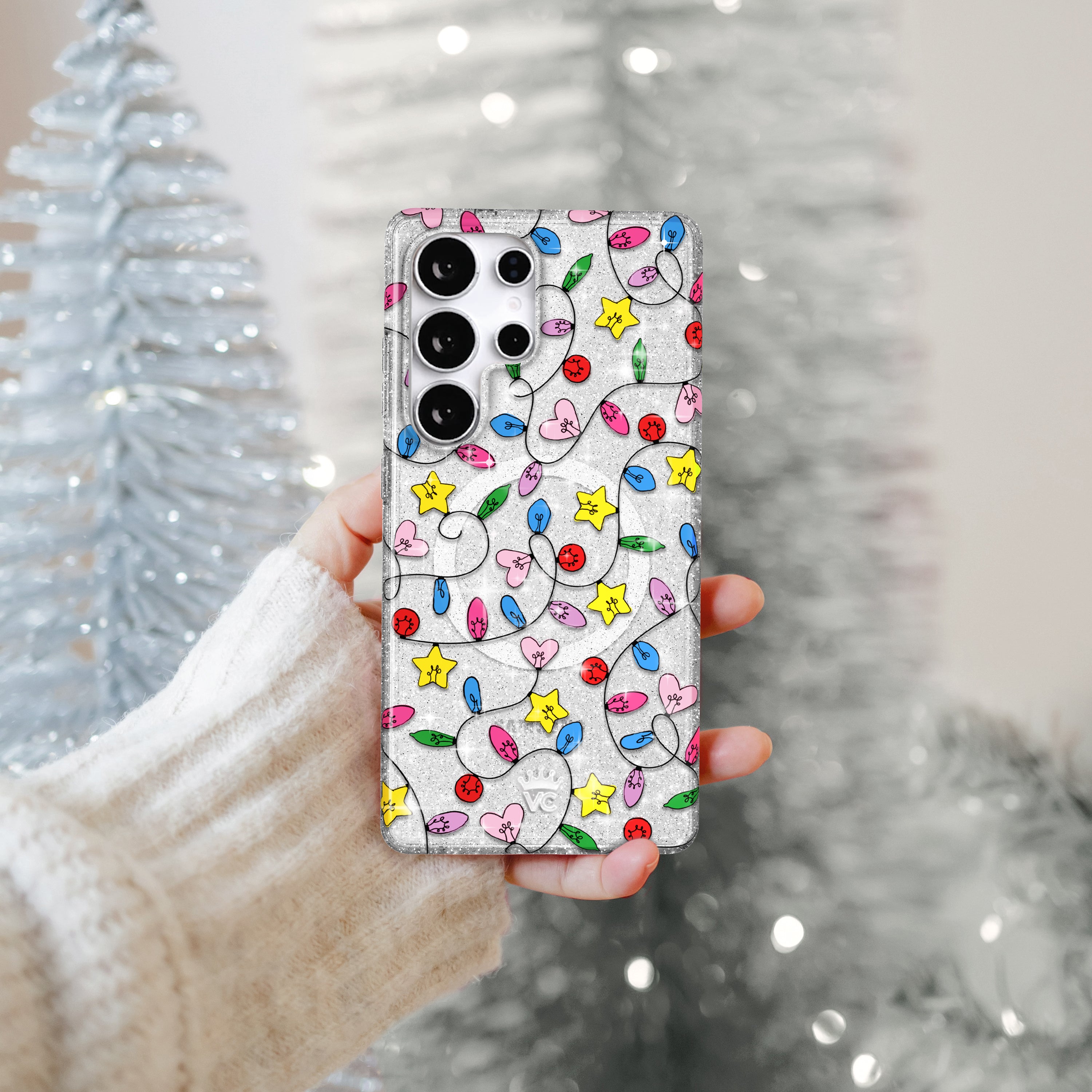 Happy Holidays! This protective case features vintage holiday string lights on a clear case with silver glitter sprinkled throughout the base and bumper. This case is part of our Limited Edition Holiday Dreams collection celebrating Christmas and Hanukkah.