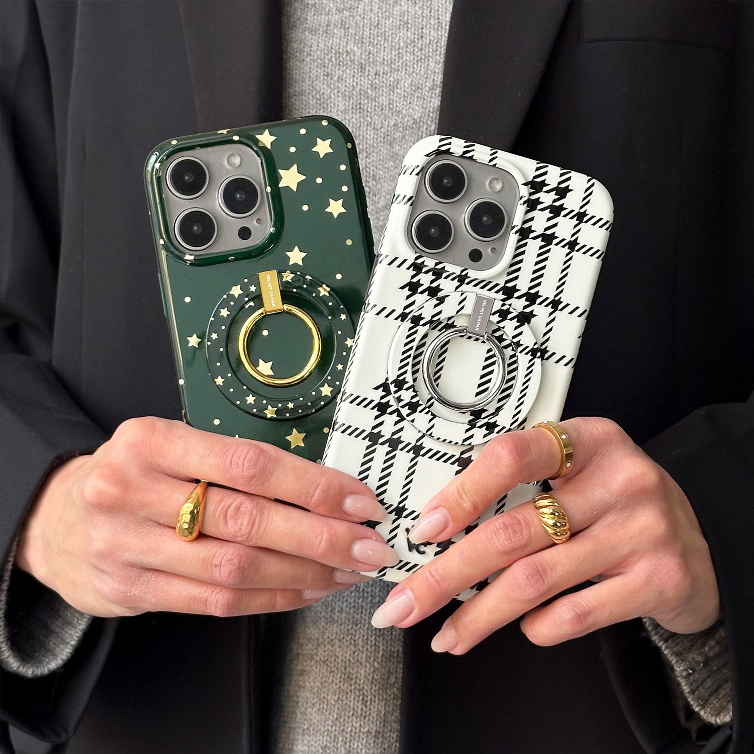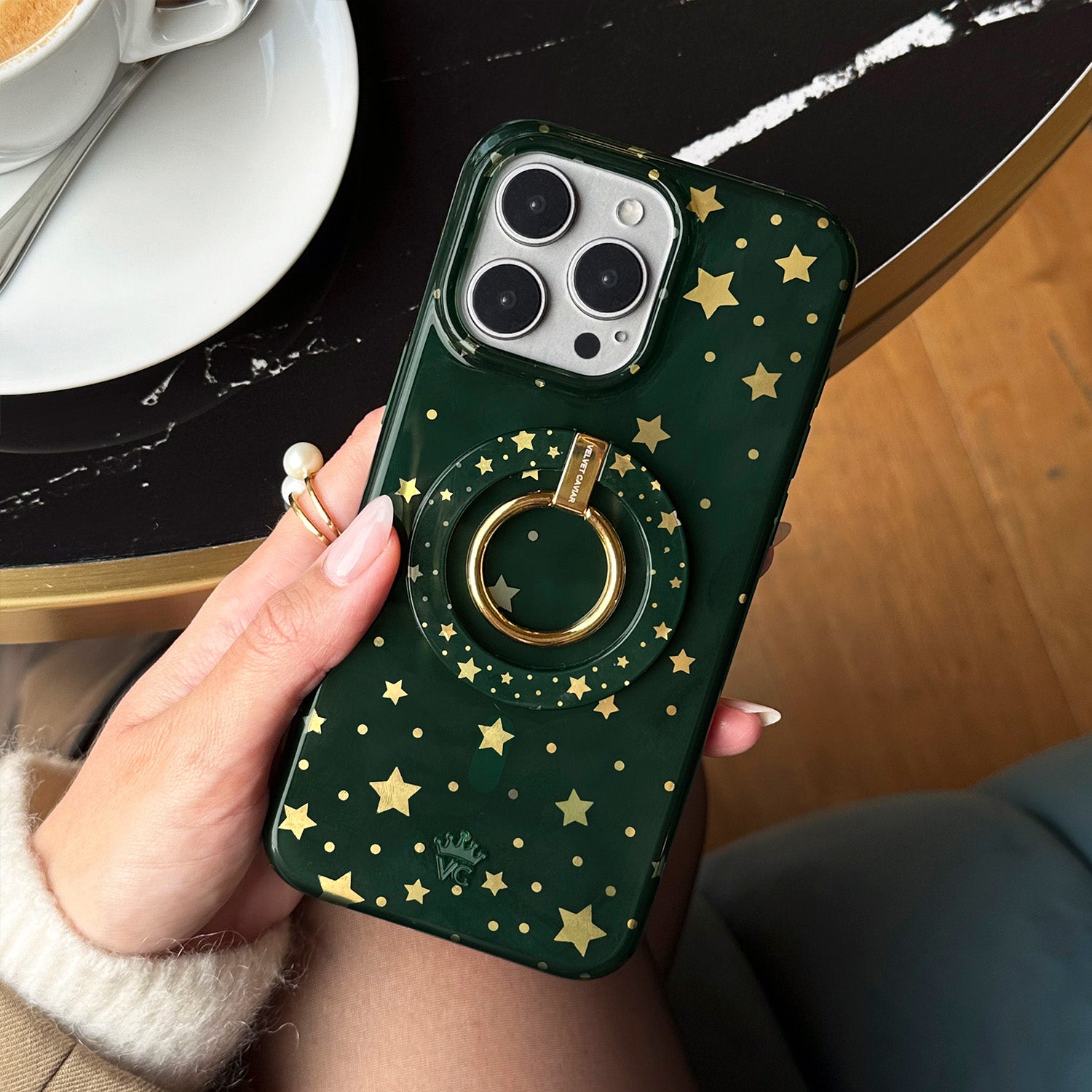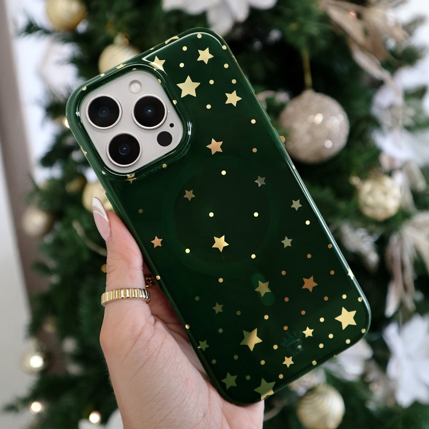 Happy Holidays! This MagSafe case features gold chrome stars on a transparent emerald green case. This case is part of our Limited Edition Christmasand Hanukkah Collection.