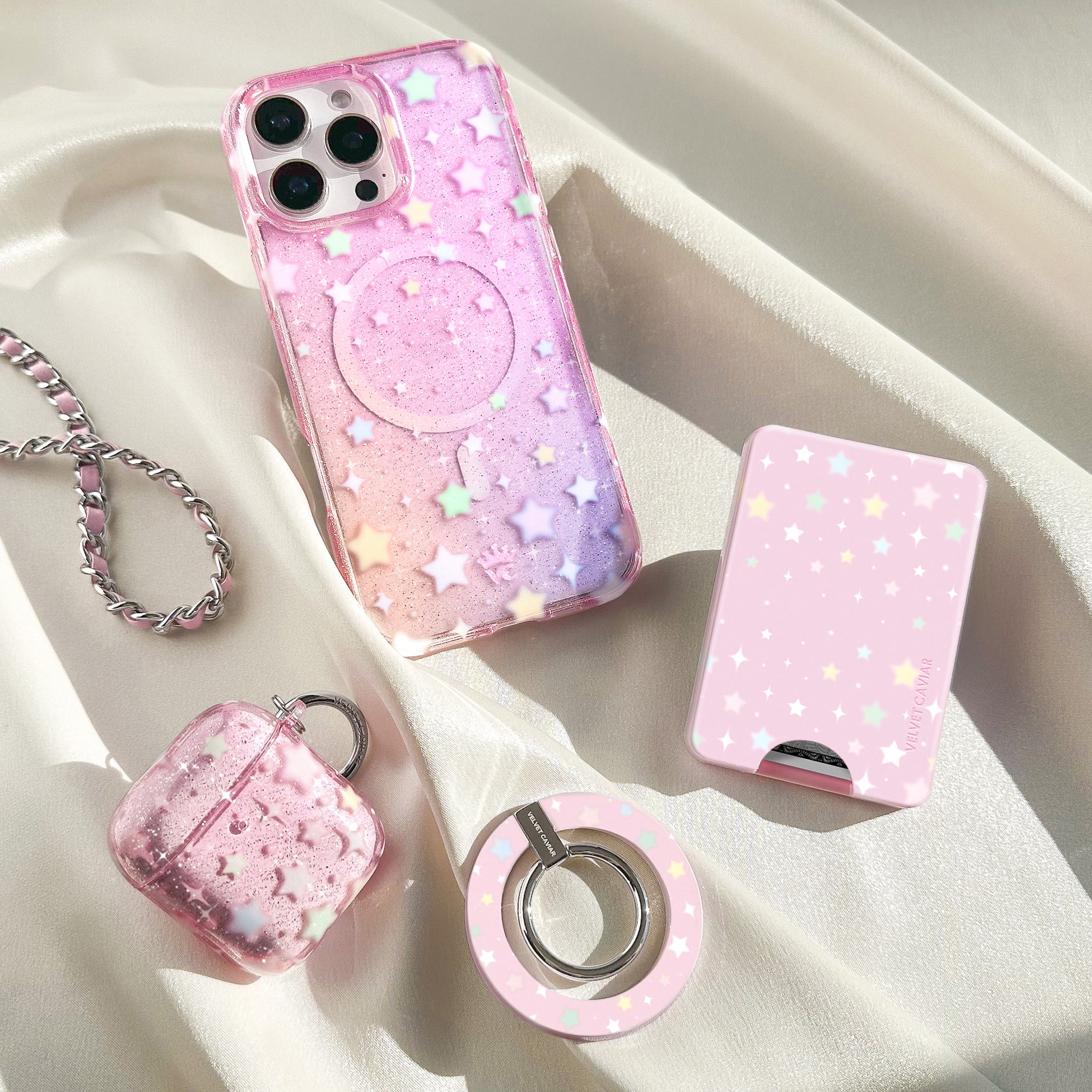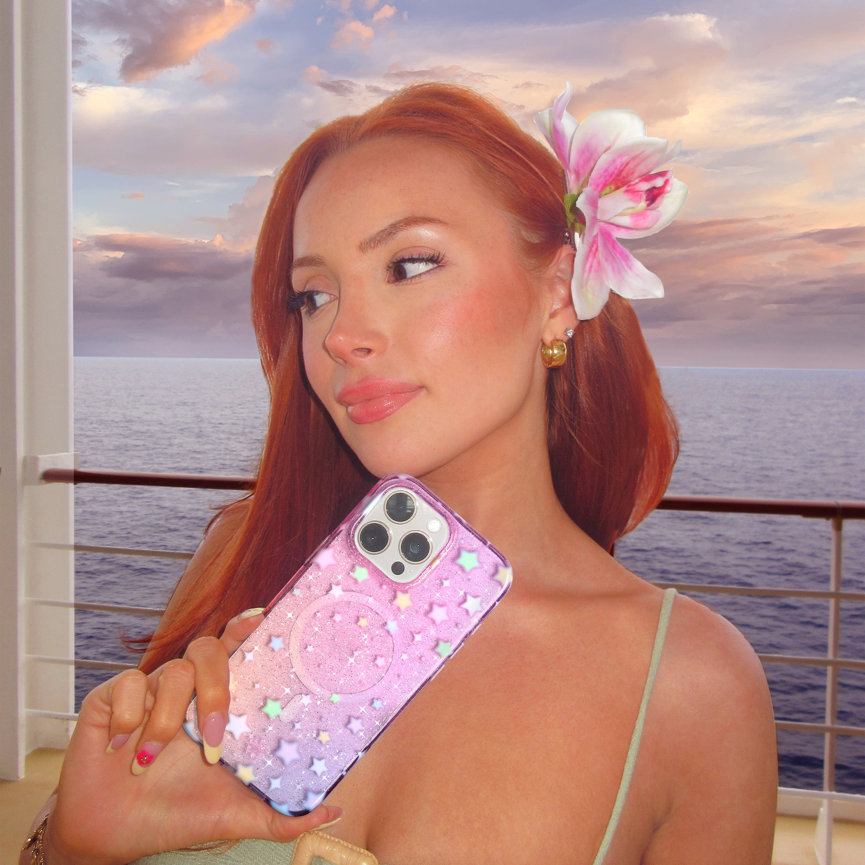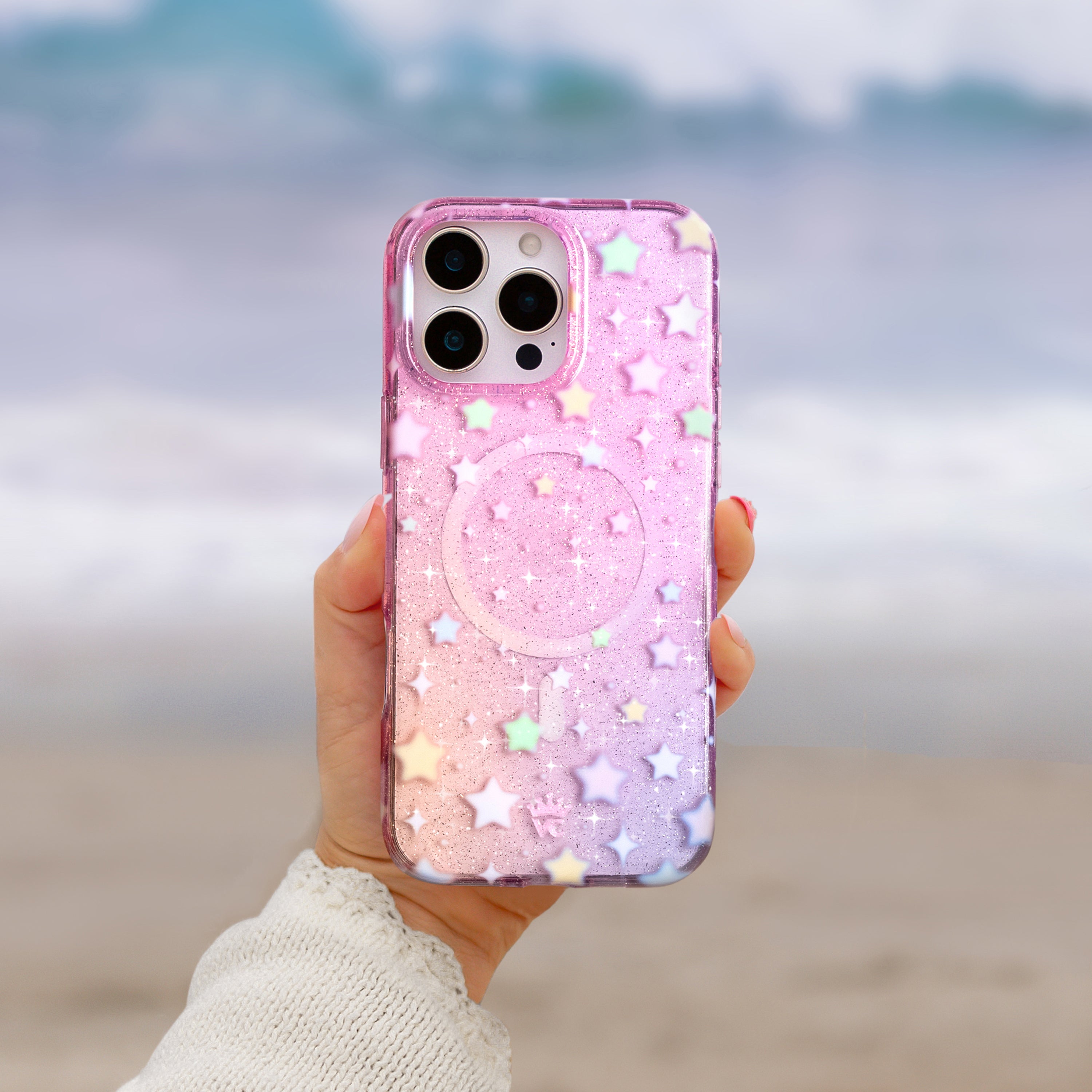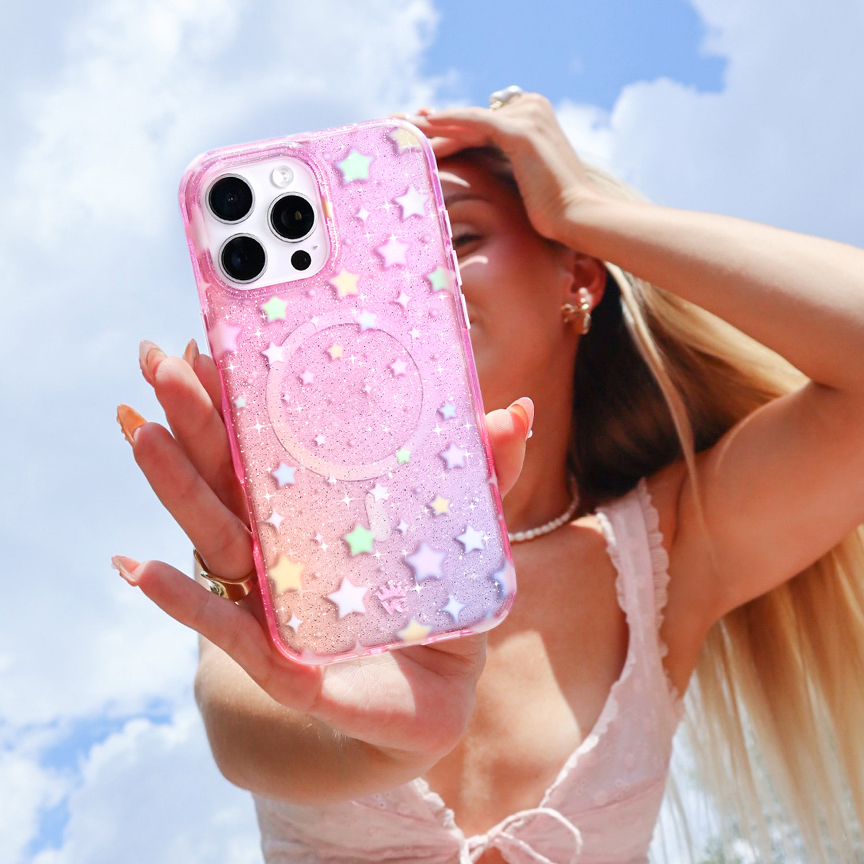 You're a star! This MagSafe case features stunning pastel stars scattered on a clear ombre sunset base with silver stardust glitter sprinkled throughout the base and bumper.