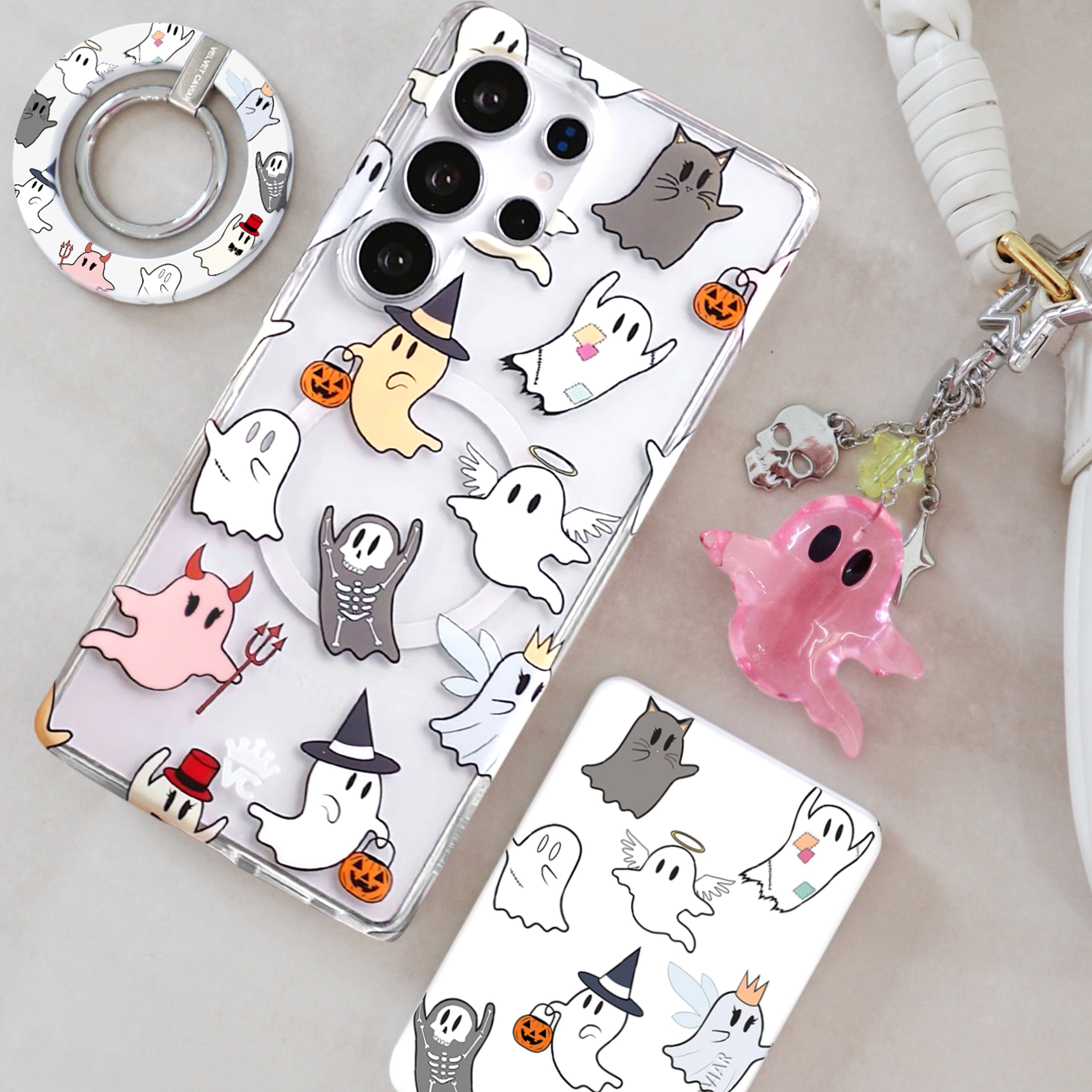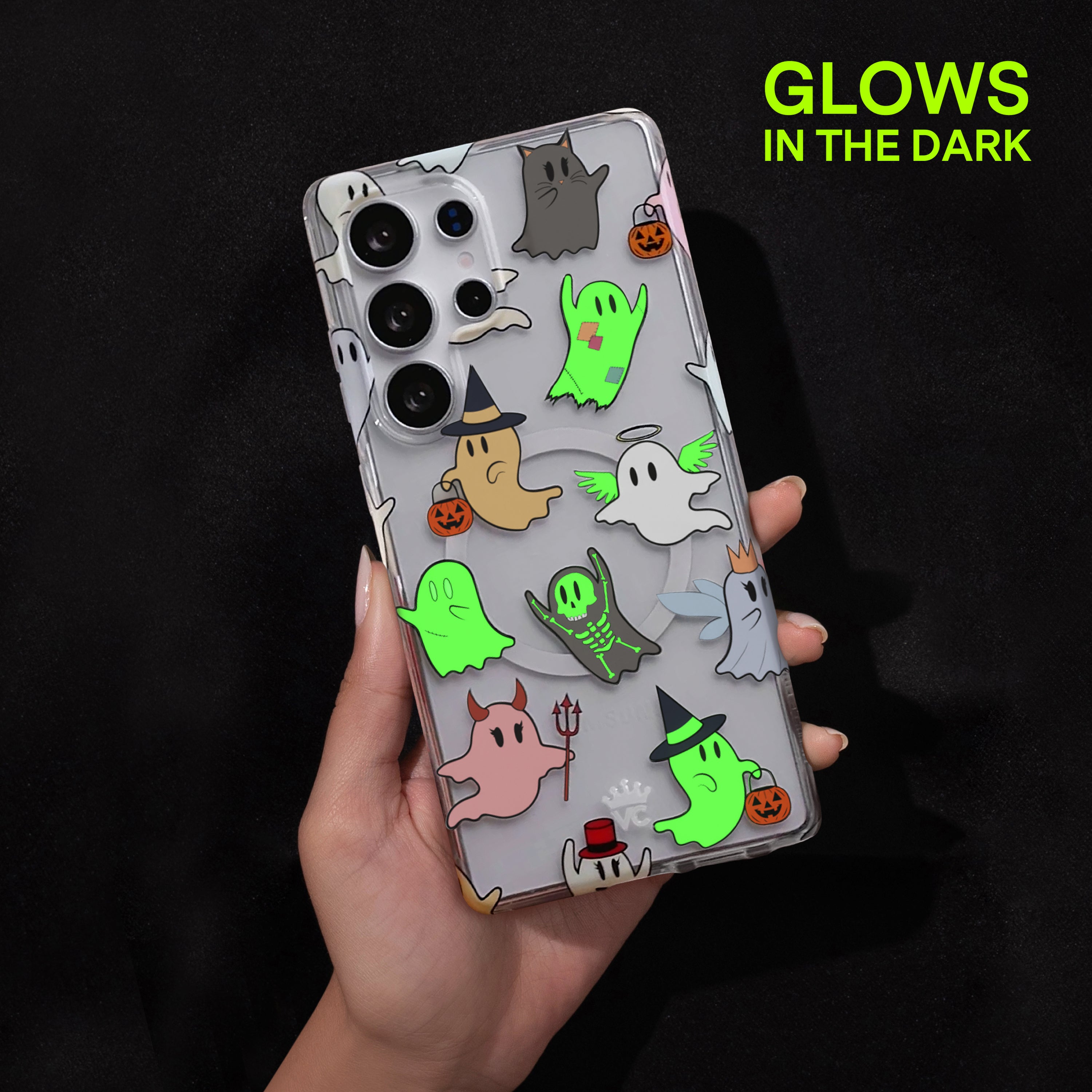 Happy Halloween! This glow in the dark protective case features our iconic friendly ghosts now in cute classic halloween costumes.