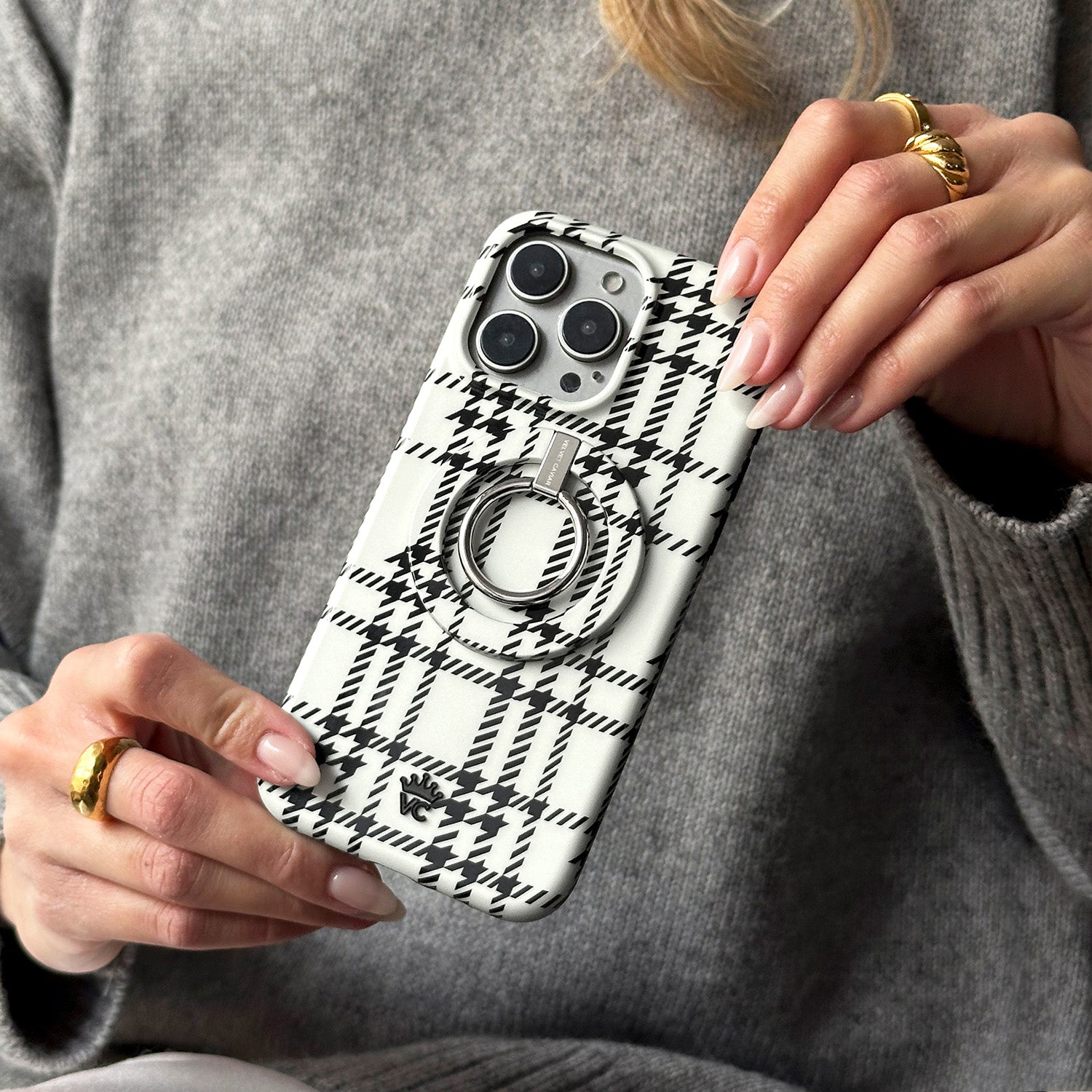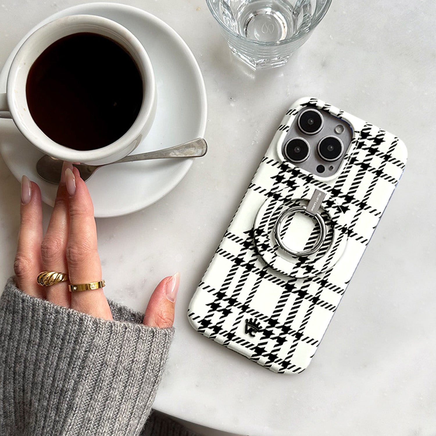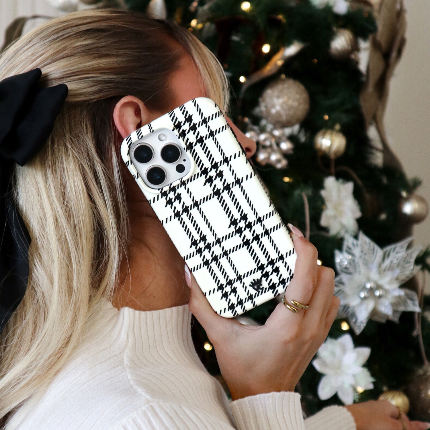 Happy Holidays! This MagSafe case features a classic black and white houndstooth print with a contrasting black bumper. This case is part of our Limited Edition Christmasand Hanukkah Collection.