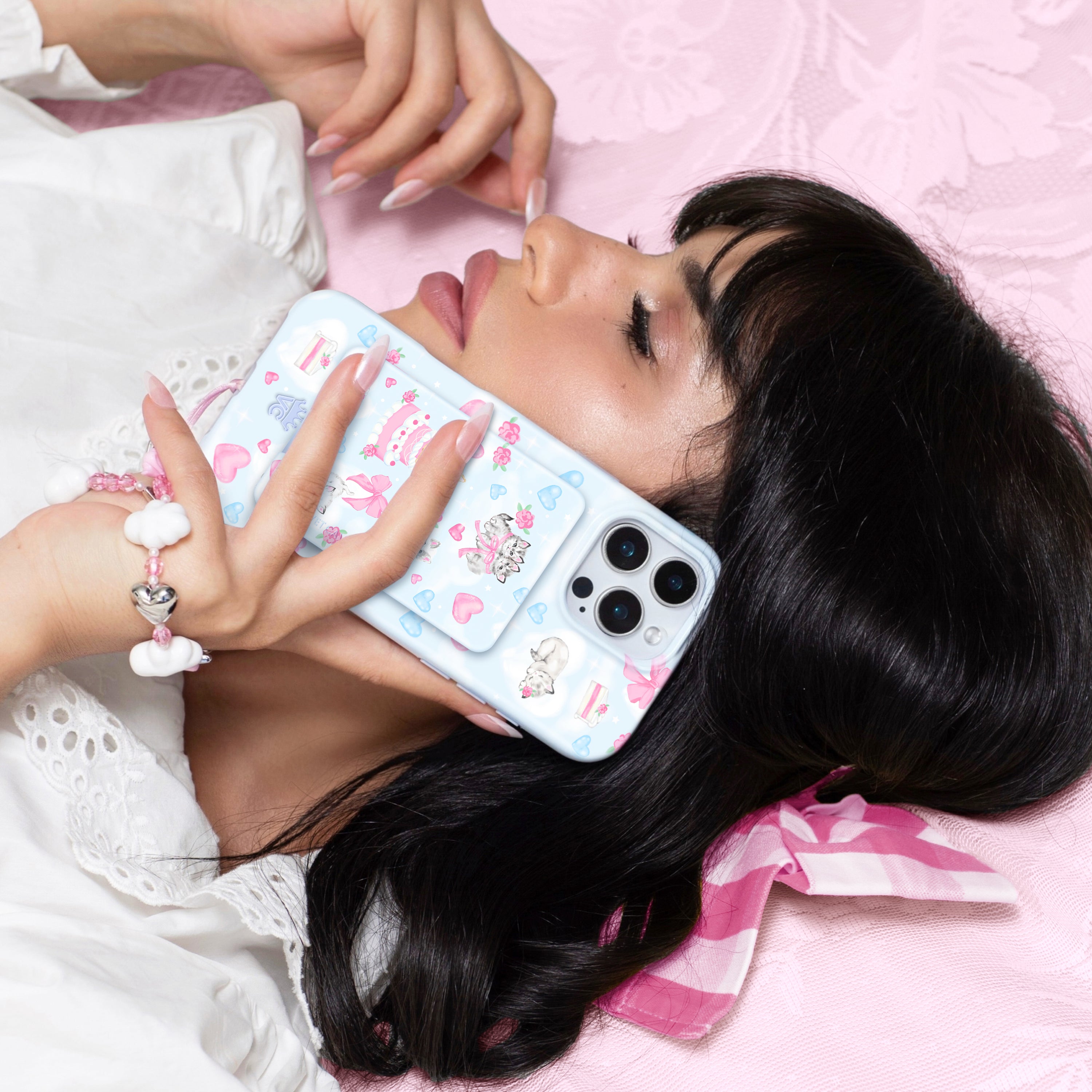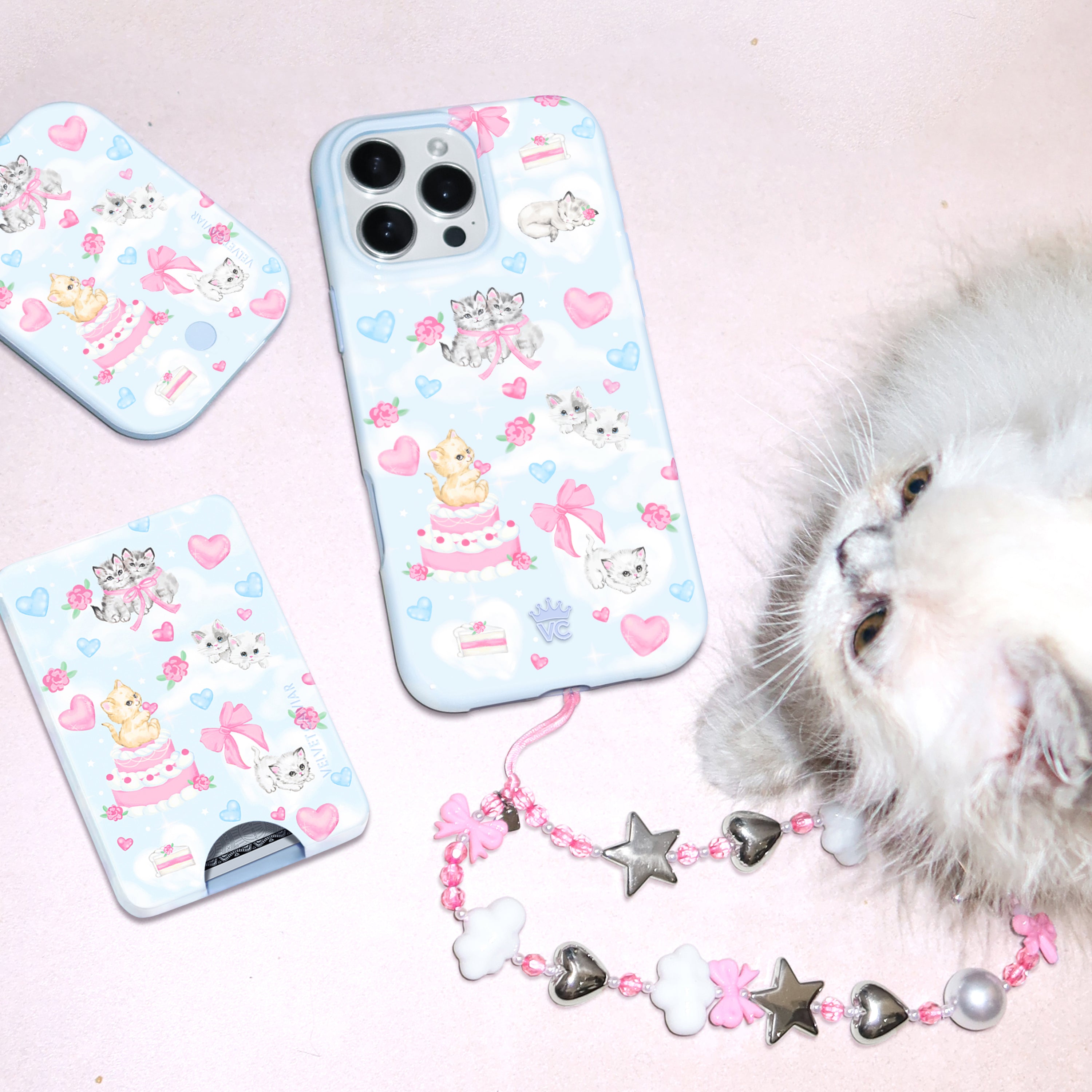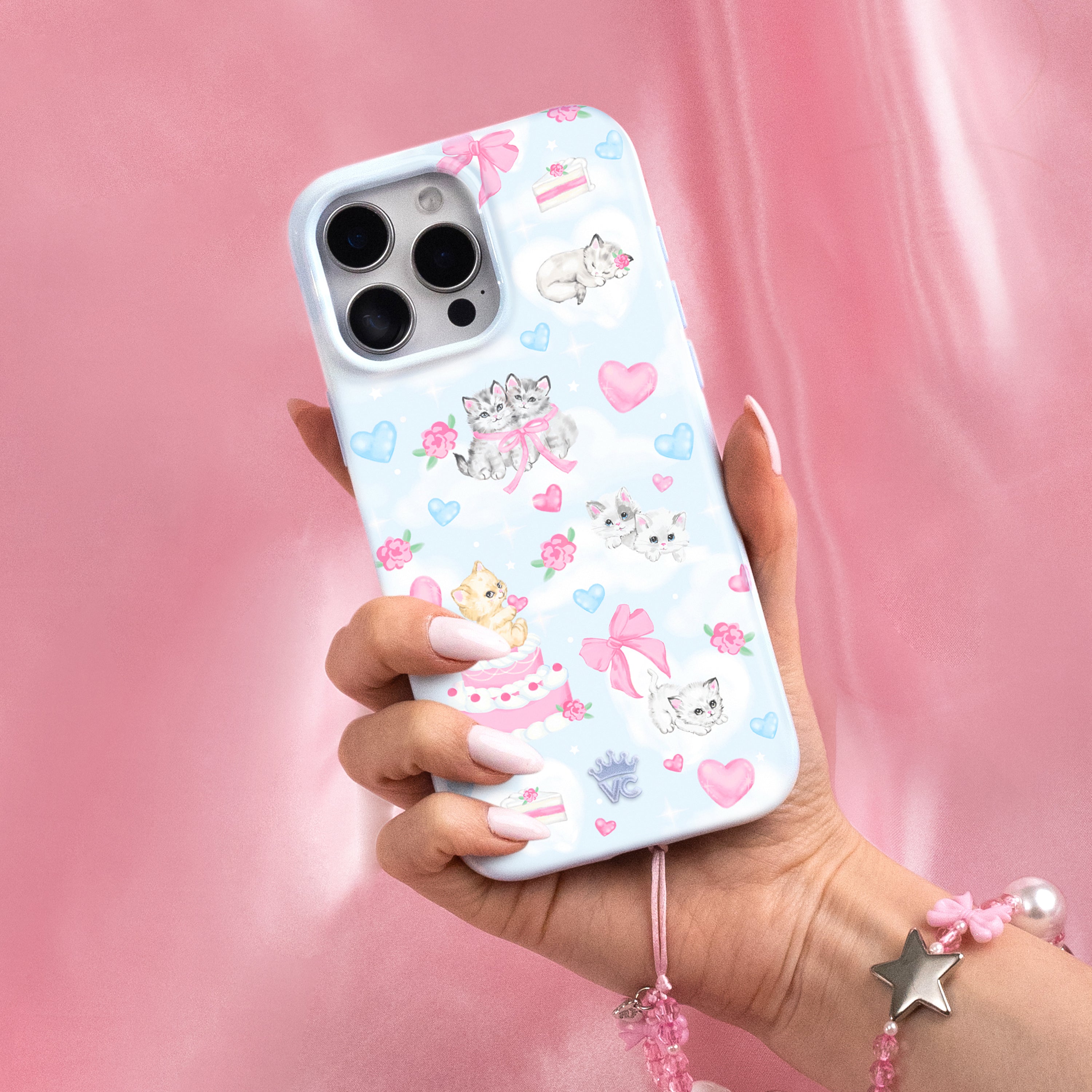 Pawsitively Purrfect! This MagSafe phone case is for cat lovers featuring hand drawn kittens and cake resting on dreamy white clouds on a glossy baby blue base.