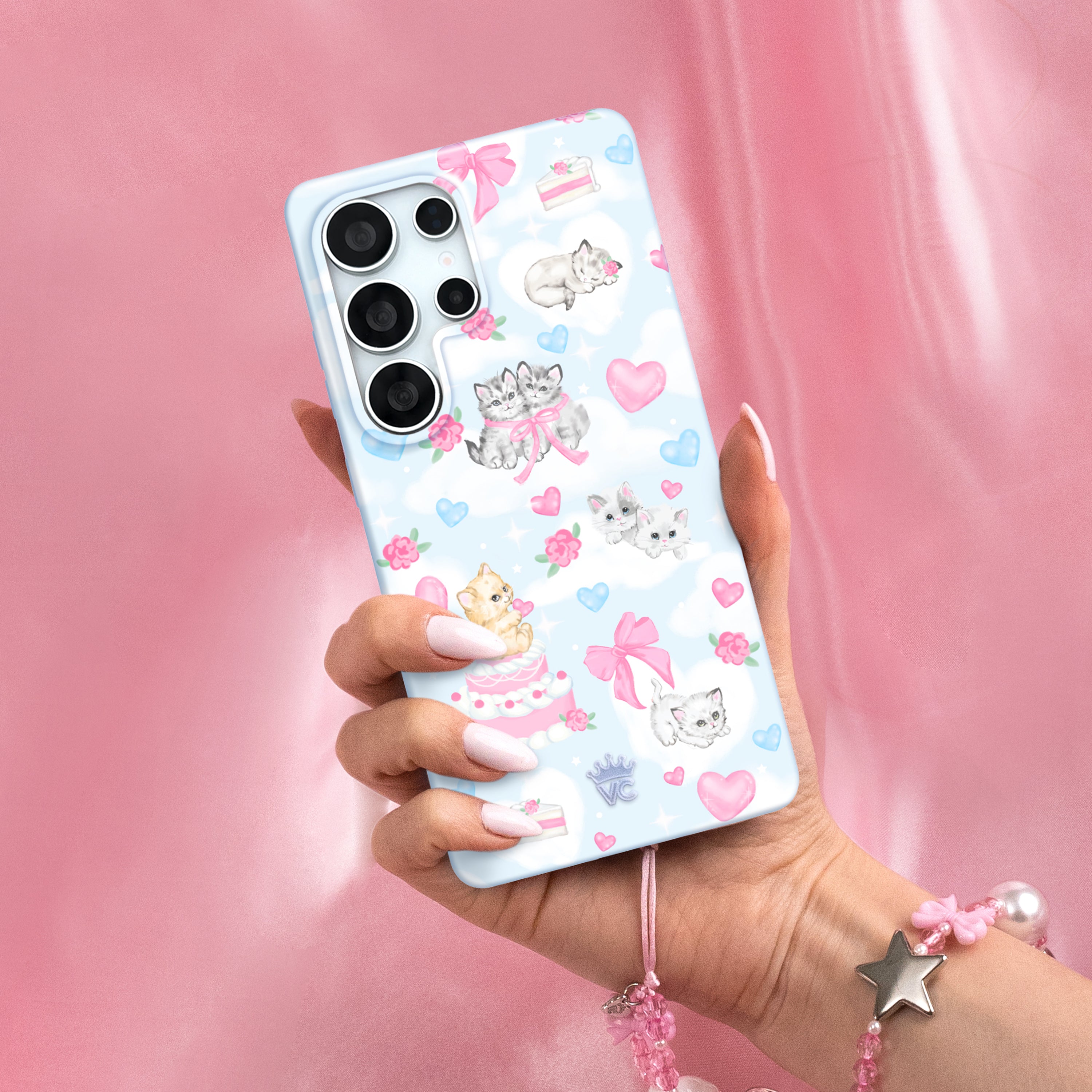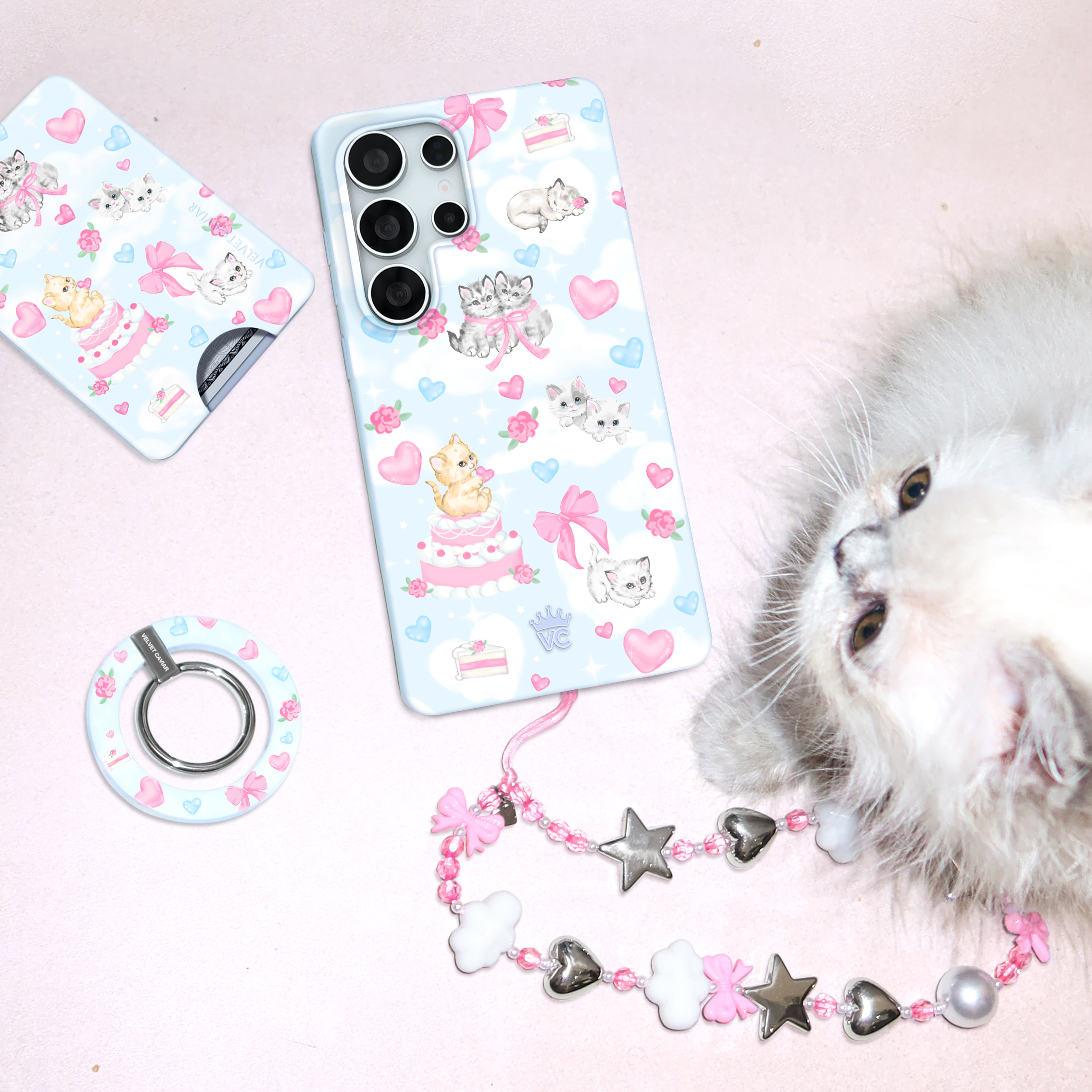 Pawsitively Purrfect! This protective phone case is for cat lovers featuring hand drawn kittens and cake resting on dreamy white clouds on a glossy baby blue base.