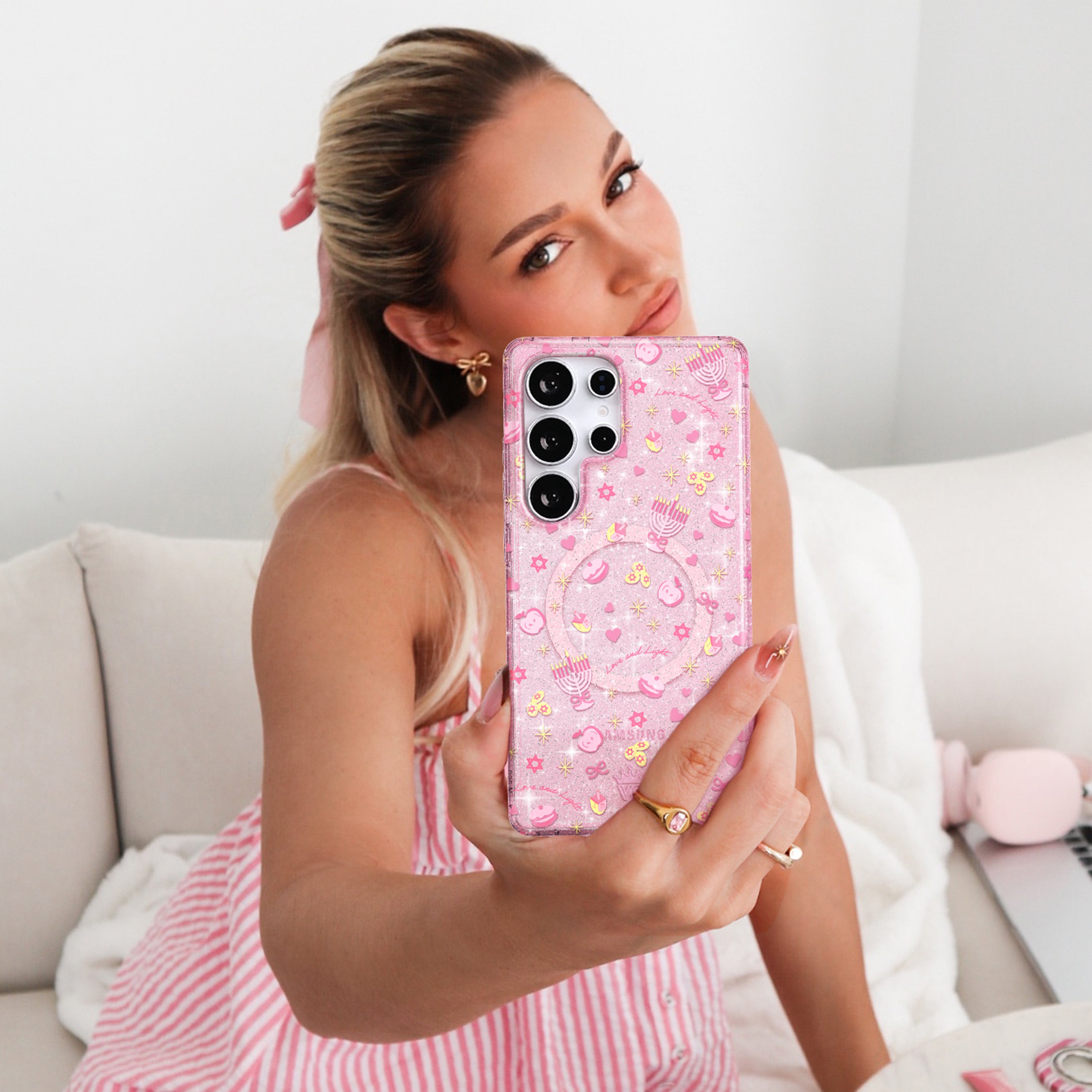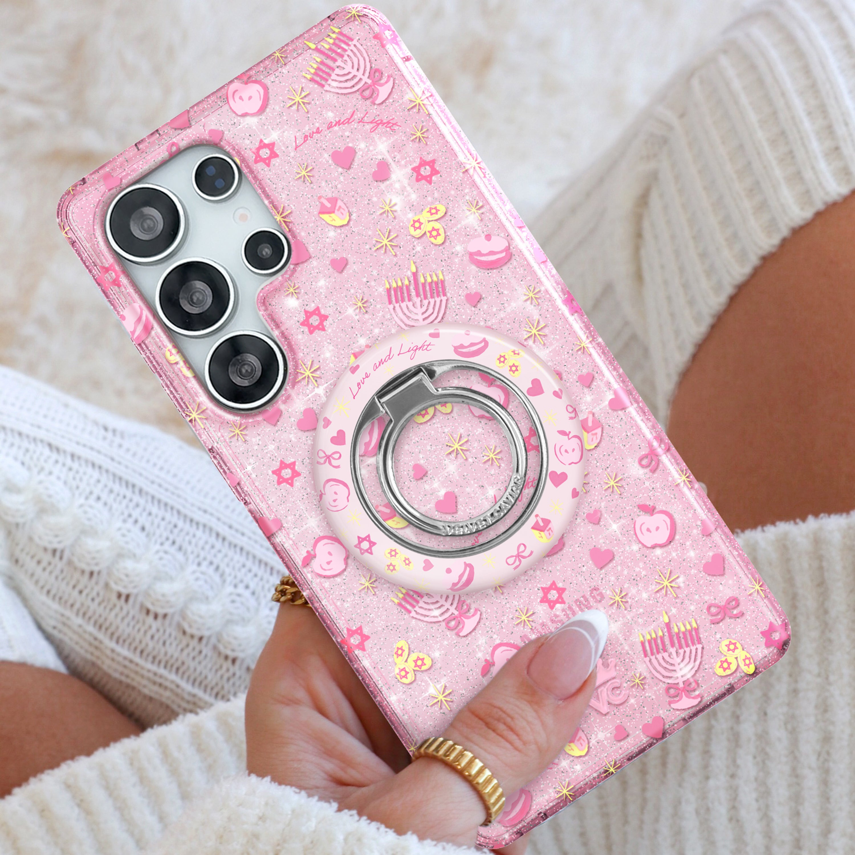 Happy Holidays! This transparent pink protective case has silver glitter sprinkled into the base and bumper and is covered in adorable Hanukkah motifs. This case is part of our Limited Edition Holiday Dreams collection celebrating Christmas and Hanukkah.