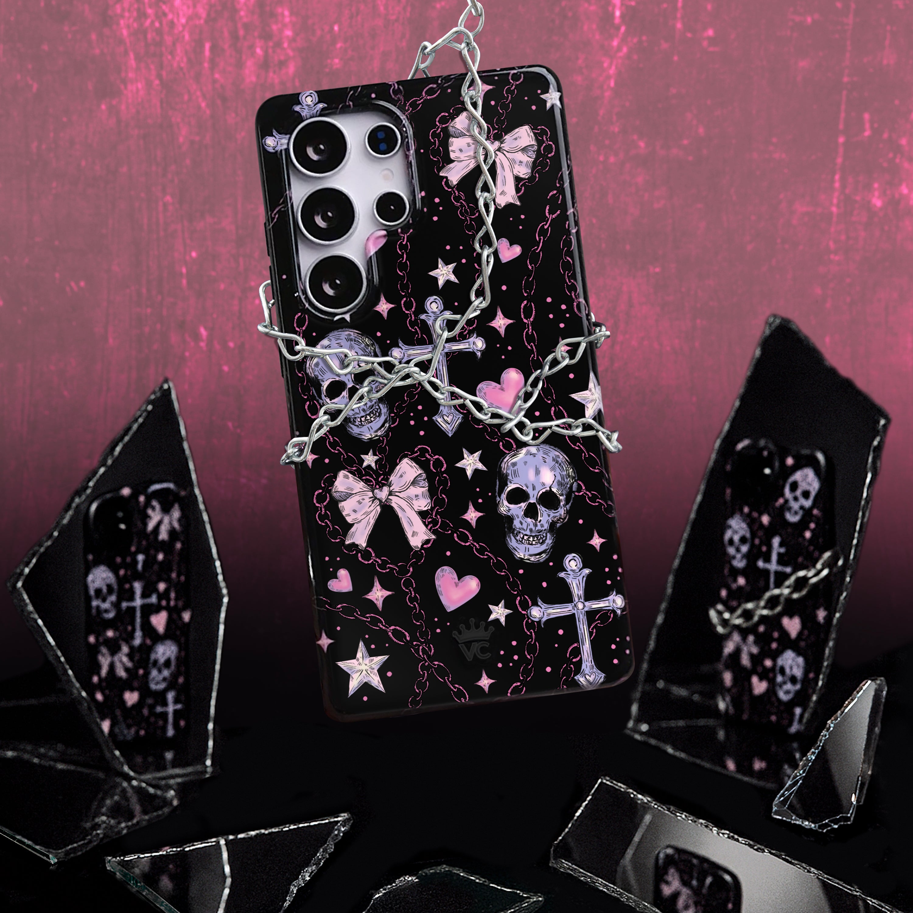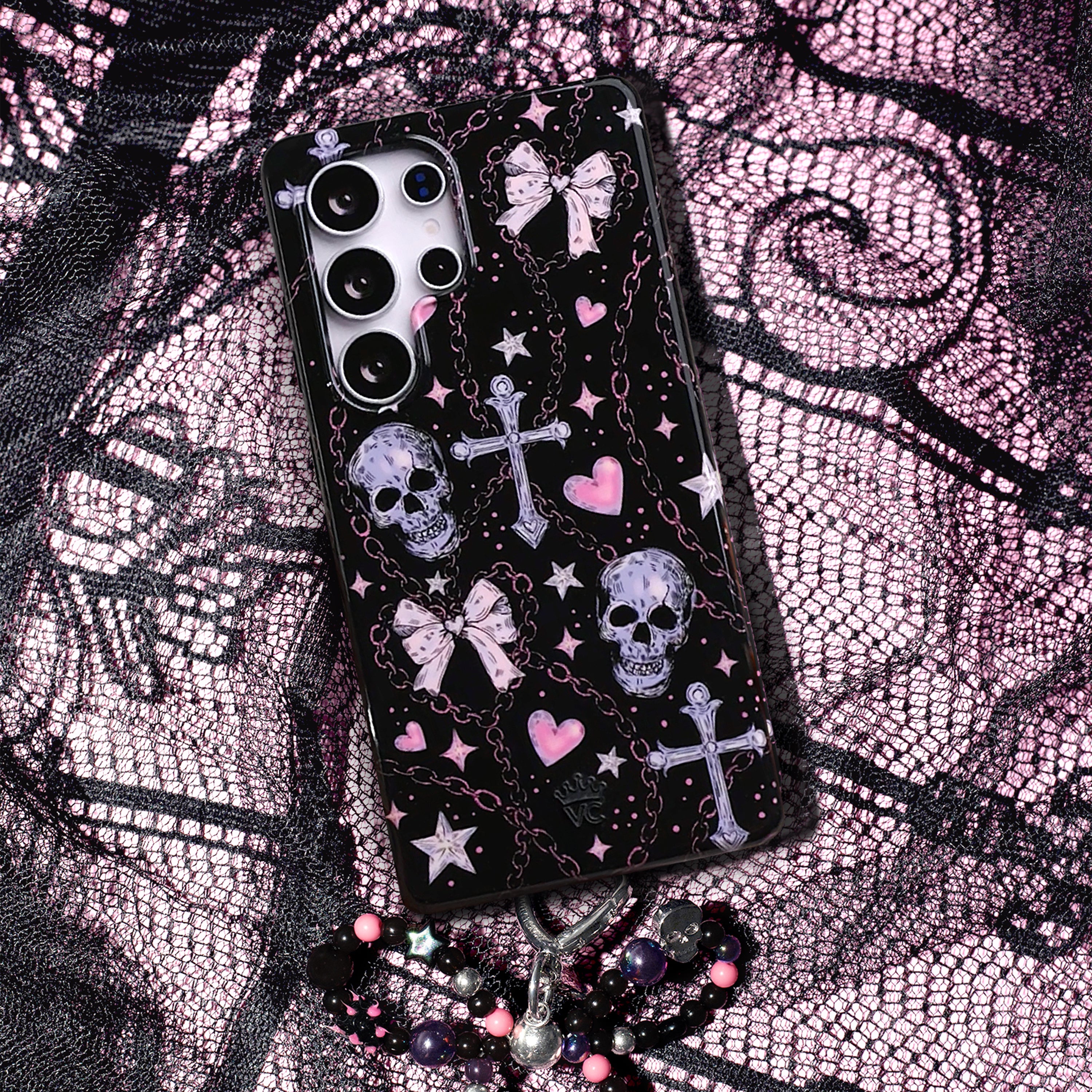 Happy Halloween! This spooky protective case features pink and lilac punk skulls, bows, chains, stars, and crosses on a glossy black base.