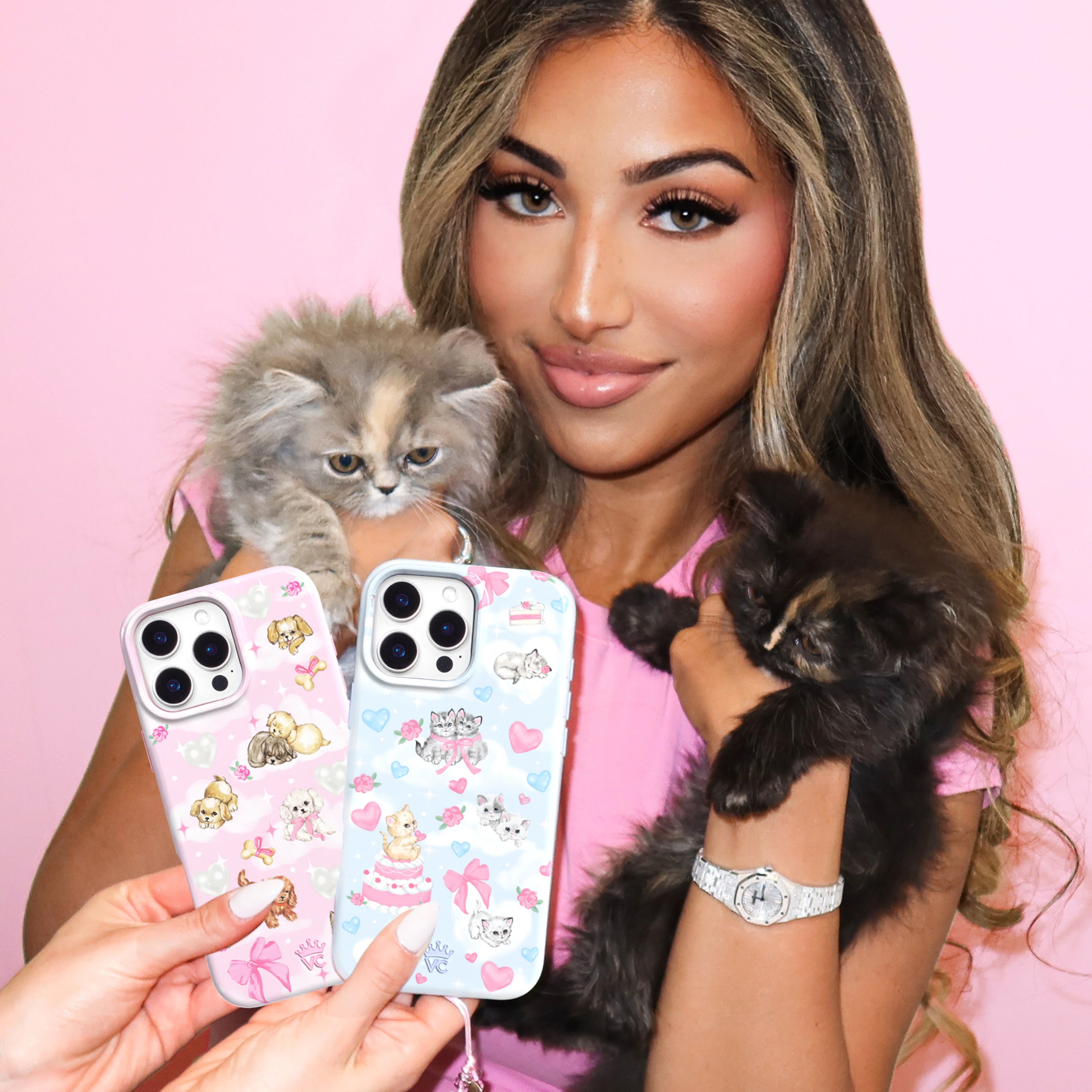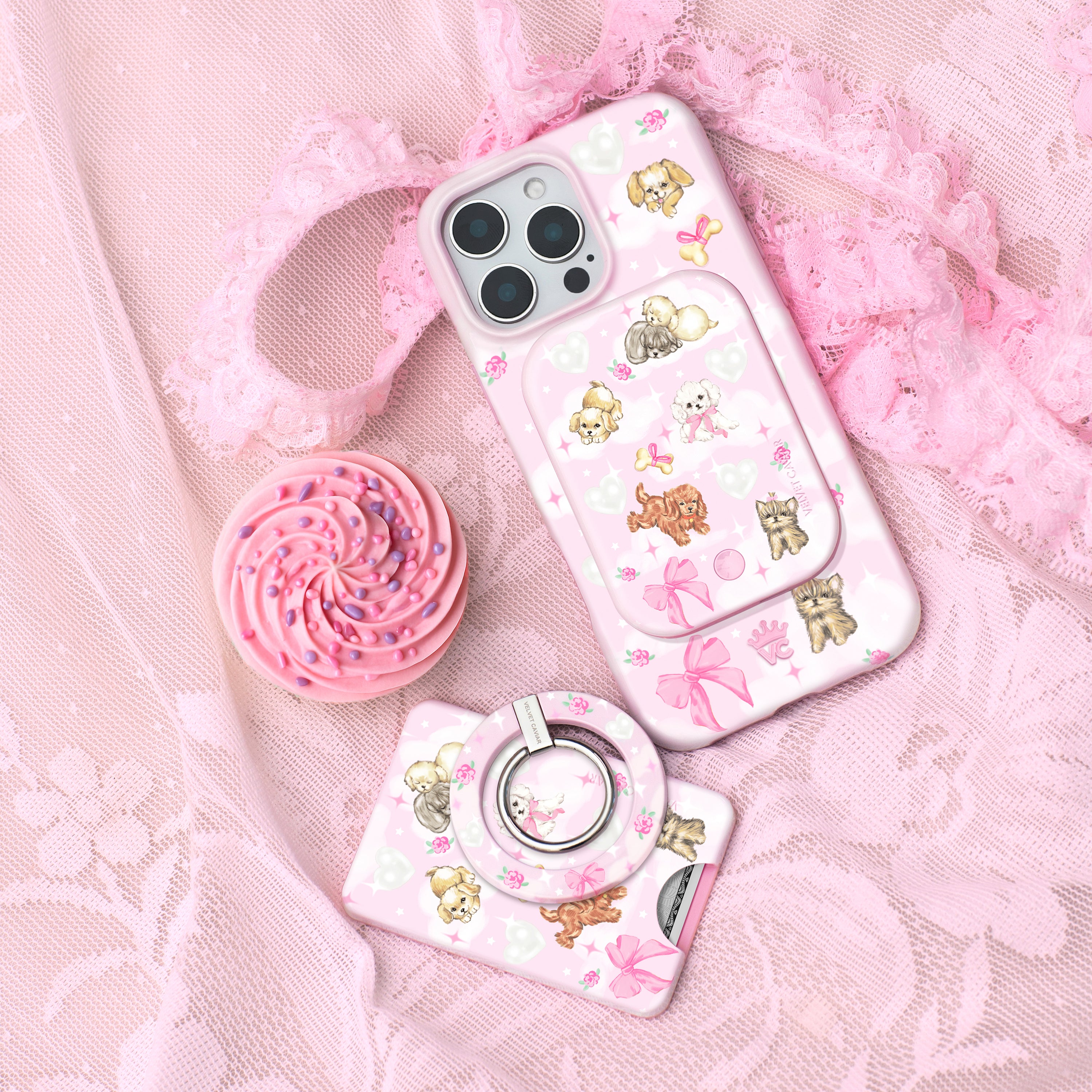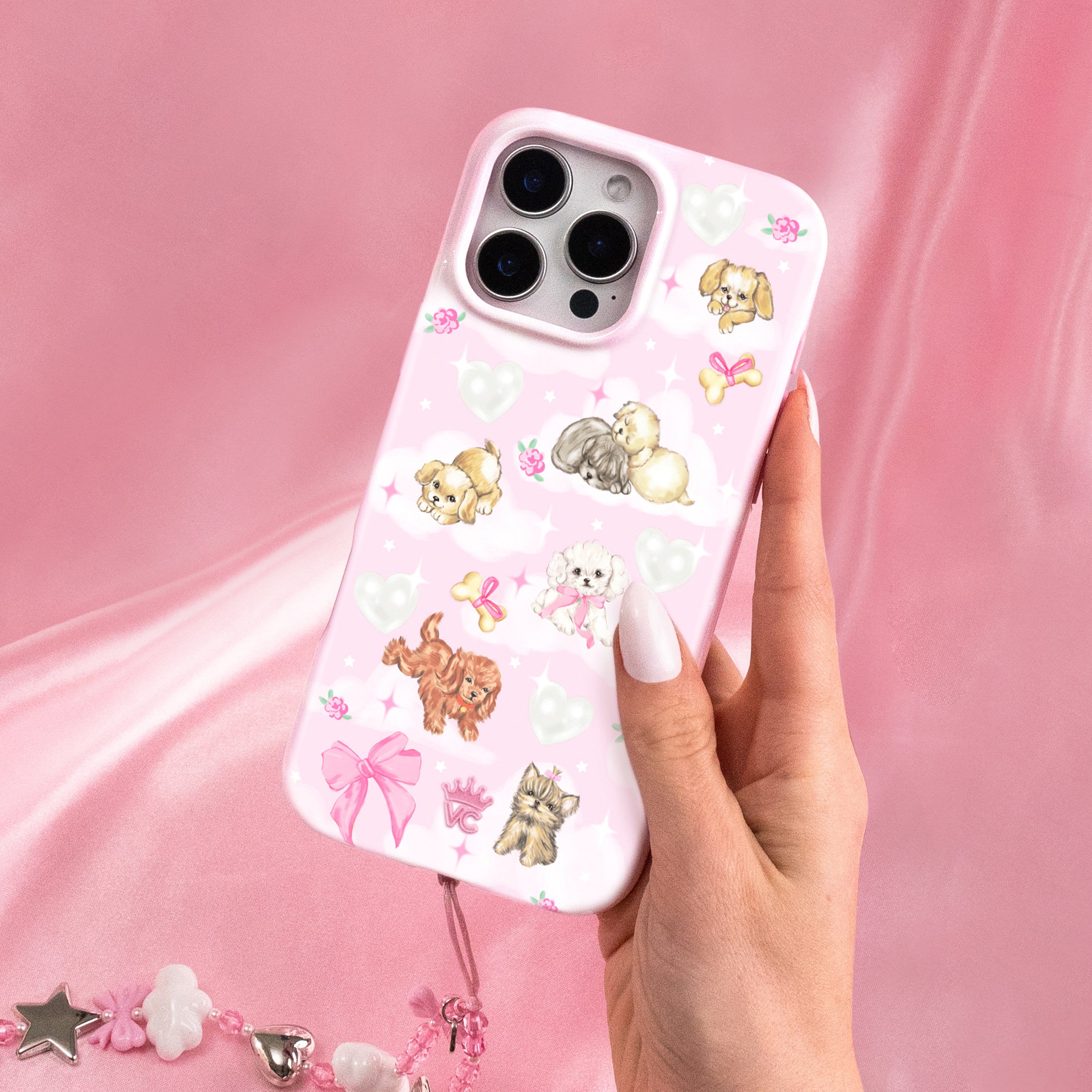 Pawsitively Purrfect! This MagSafe phone case features hand drawn puppy dogs resting on dreamy white clouds on a glossy baby pink base.