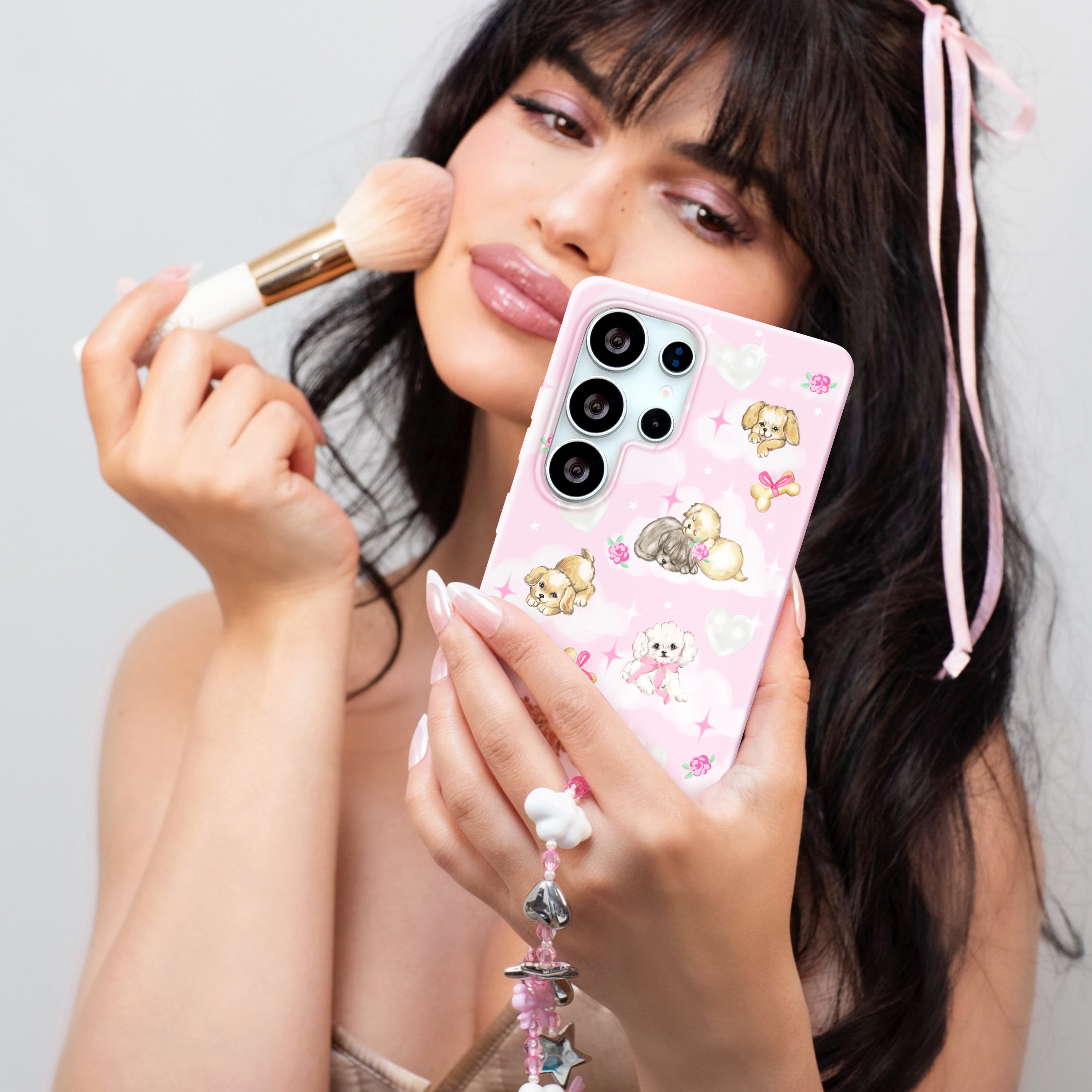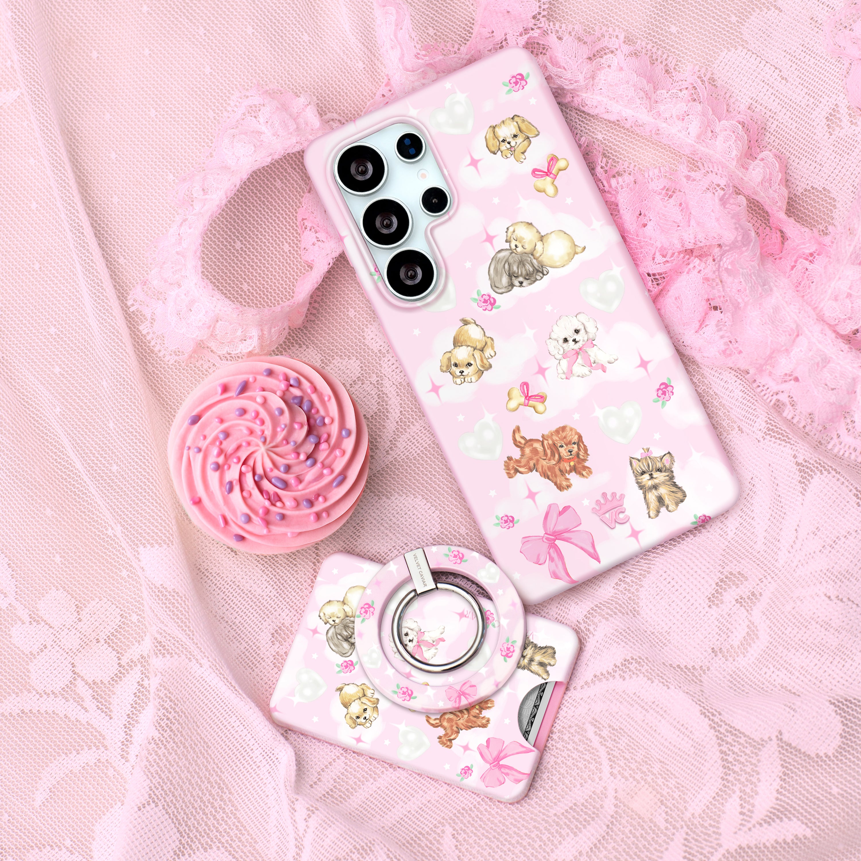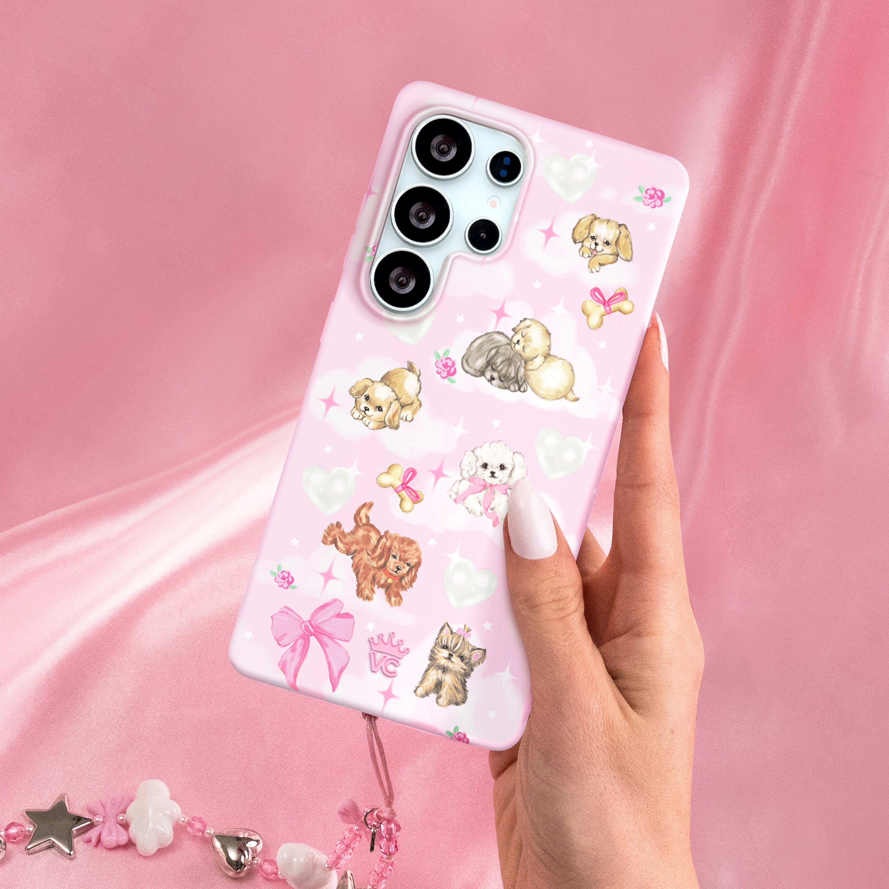 Pawsitively Purrfect! This protective phone case features hand drawn puppy dogs resting on dreamy white clouds on a glossy baby pink base.