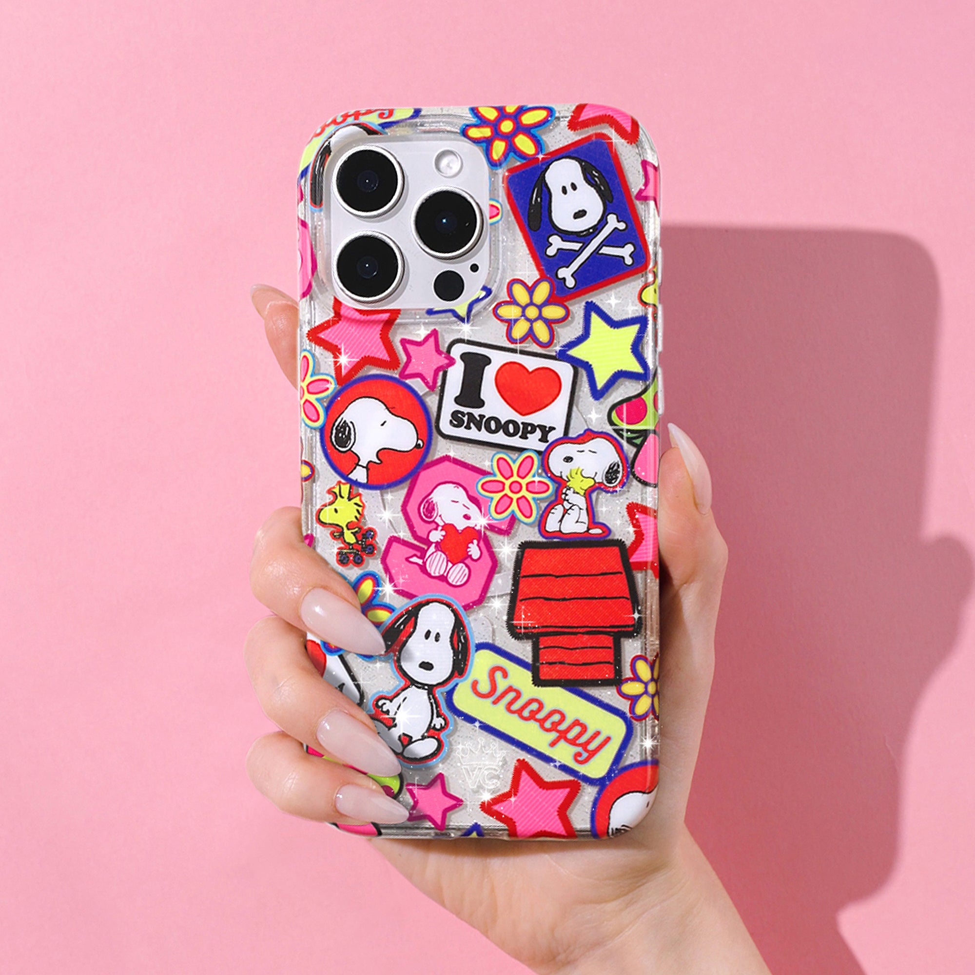 This protective case features Snoopy all over in a patchwork inspired design on a clear case with silver glitter sprinkled into the base and bumper. In collaboration with Peanuts™