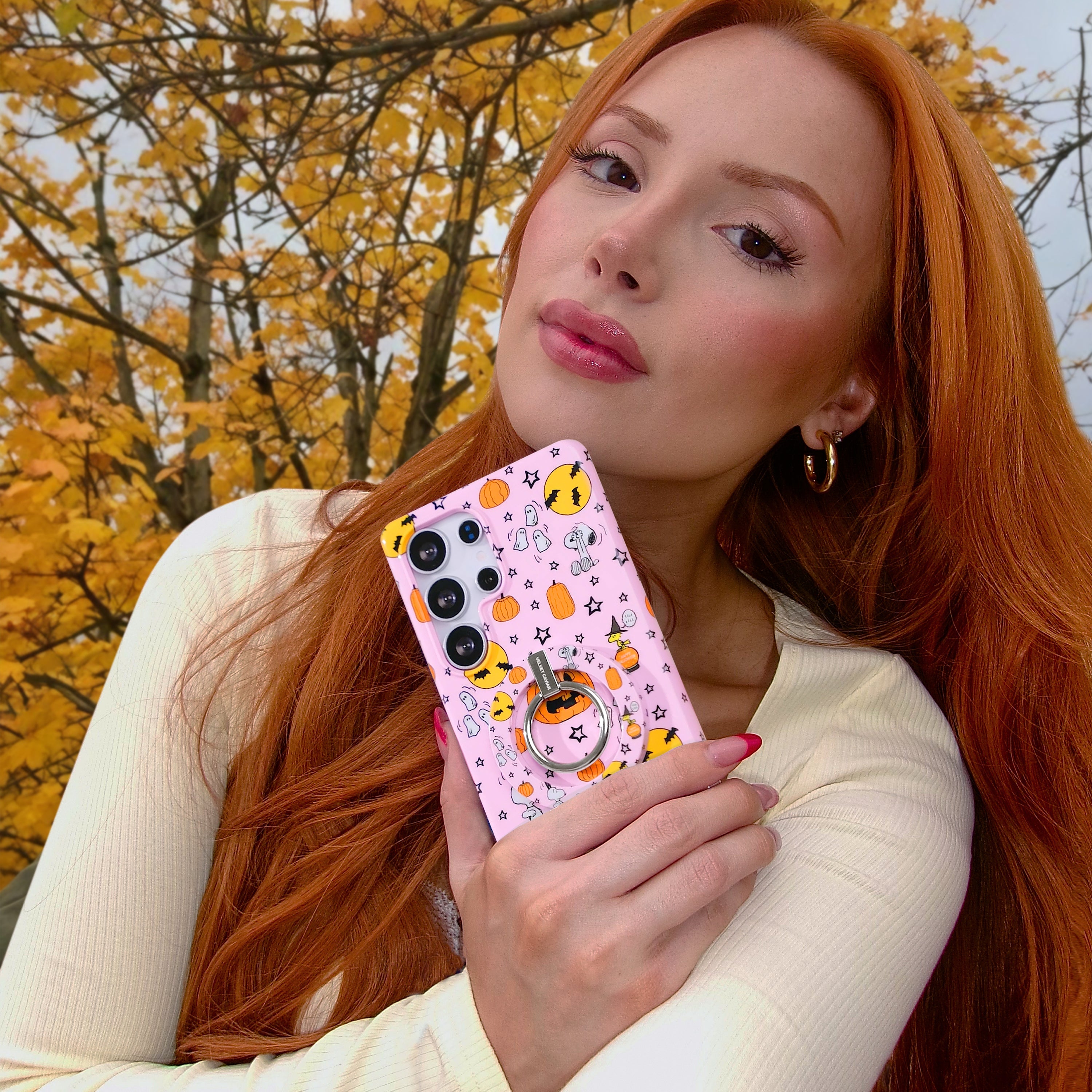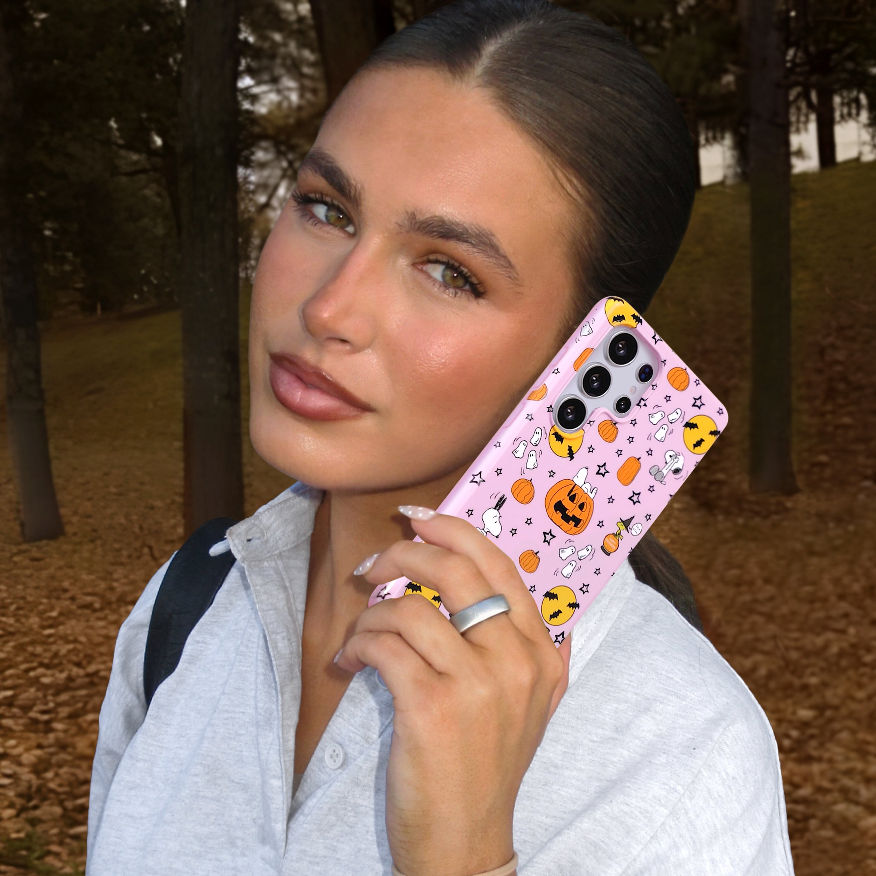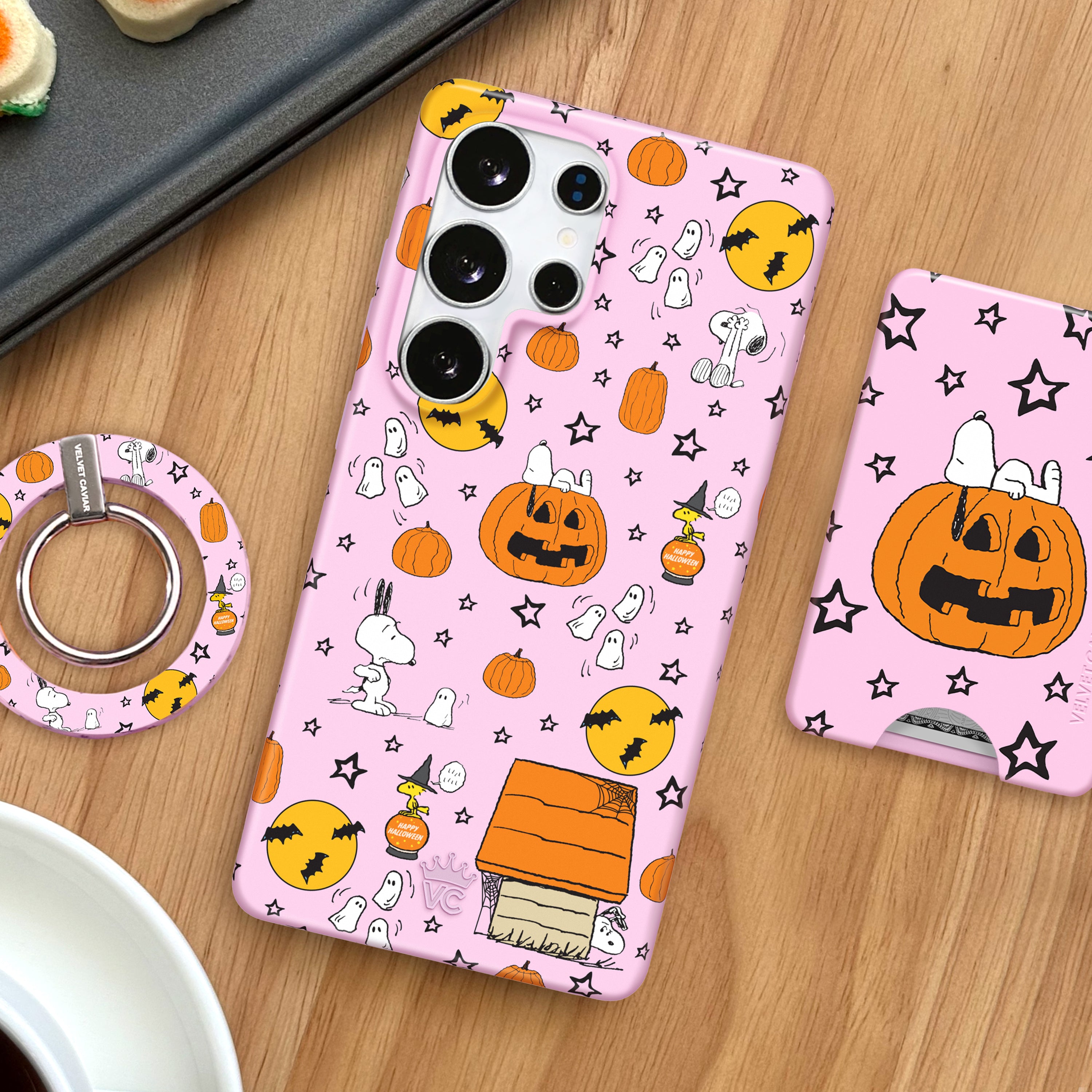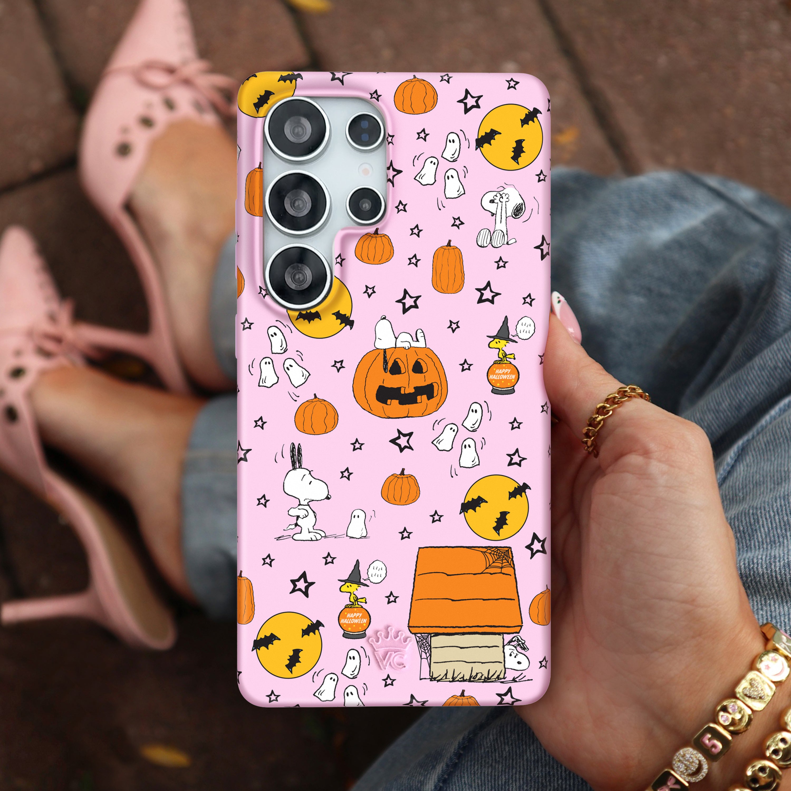VC loves Snoopy! This bubblegum pink protective case features Snoopy resting on a jack-o-lantern pumpkin, Woodstock in a witch's hat with bats, and ghosts throughout.