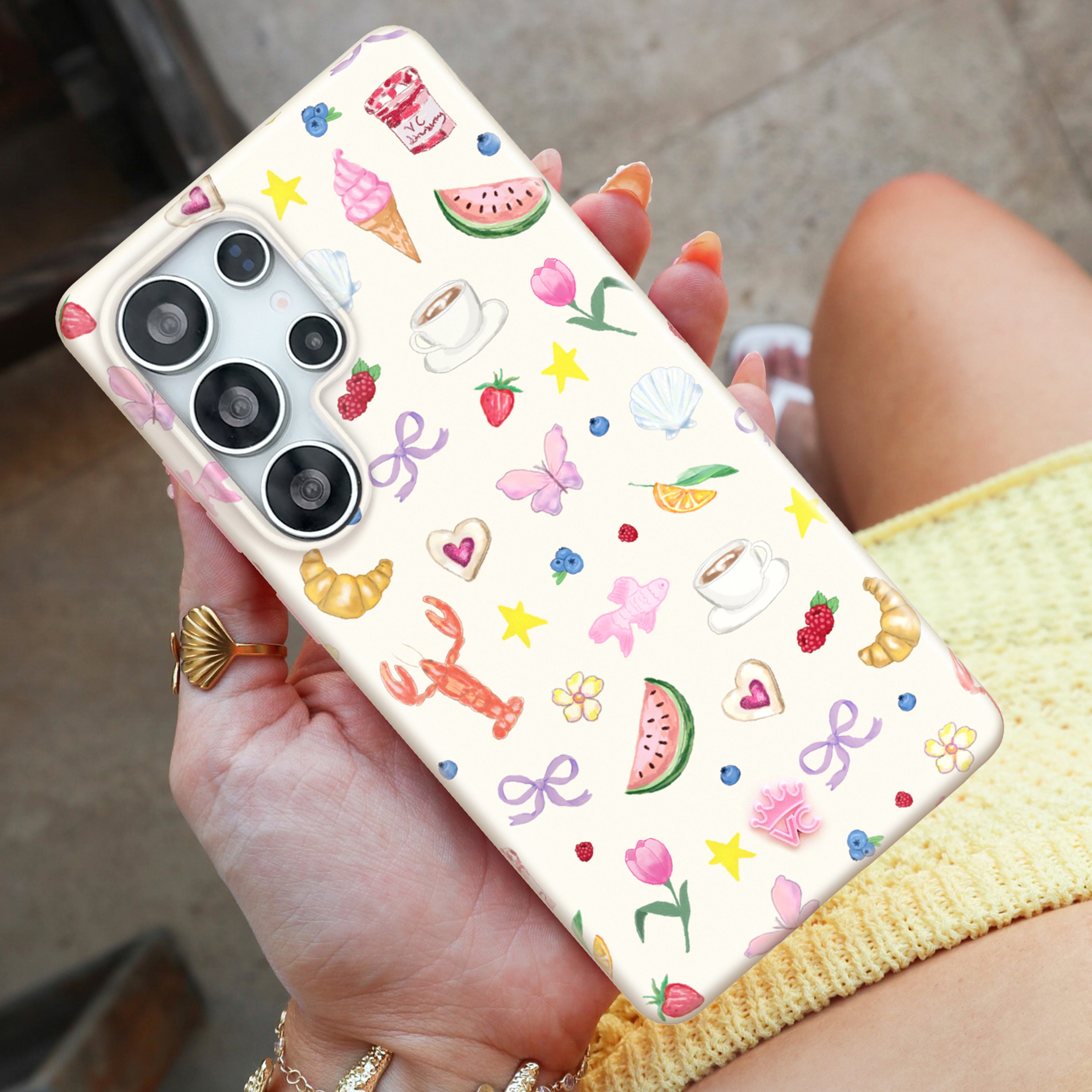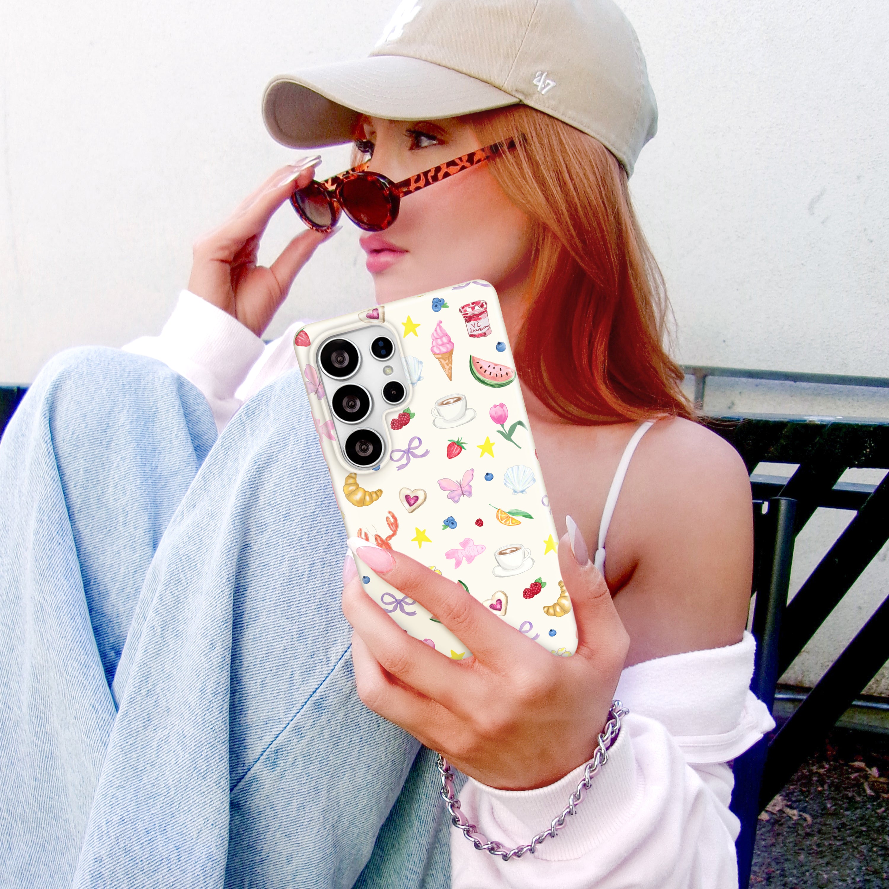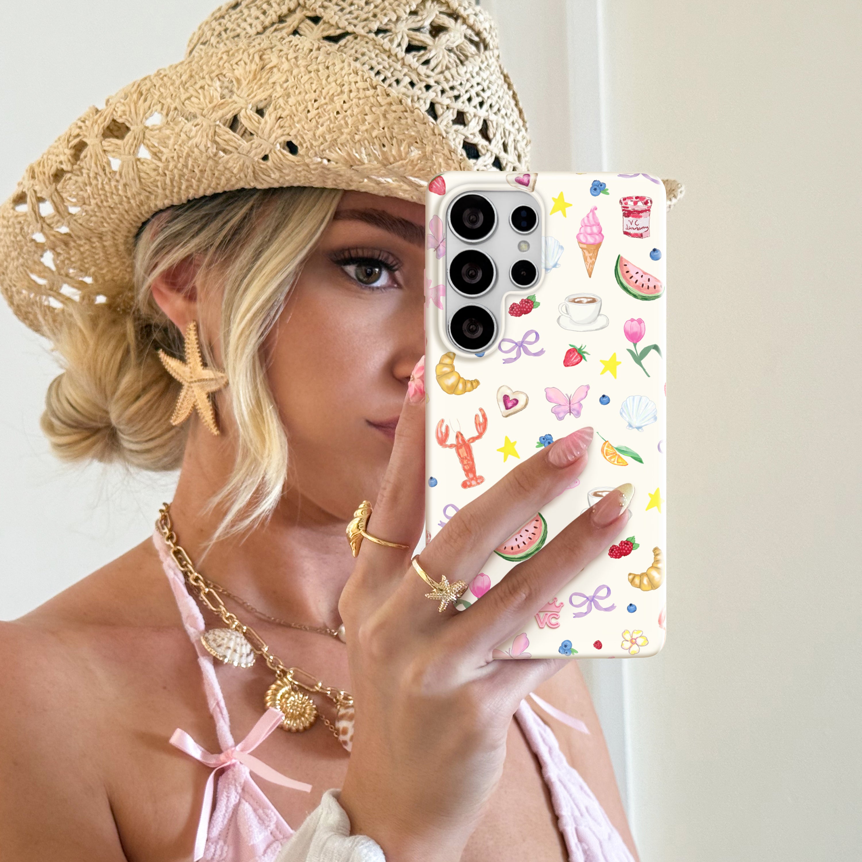 Girls just wanna have sun! This glossy protective phone case is inspired by the perfect summer from the beach to the boardwalk and back again with a neutral base and pink bumper!