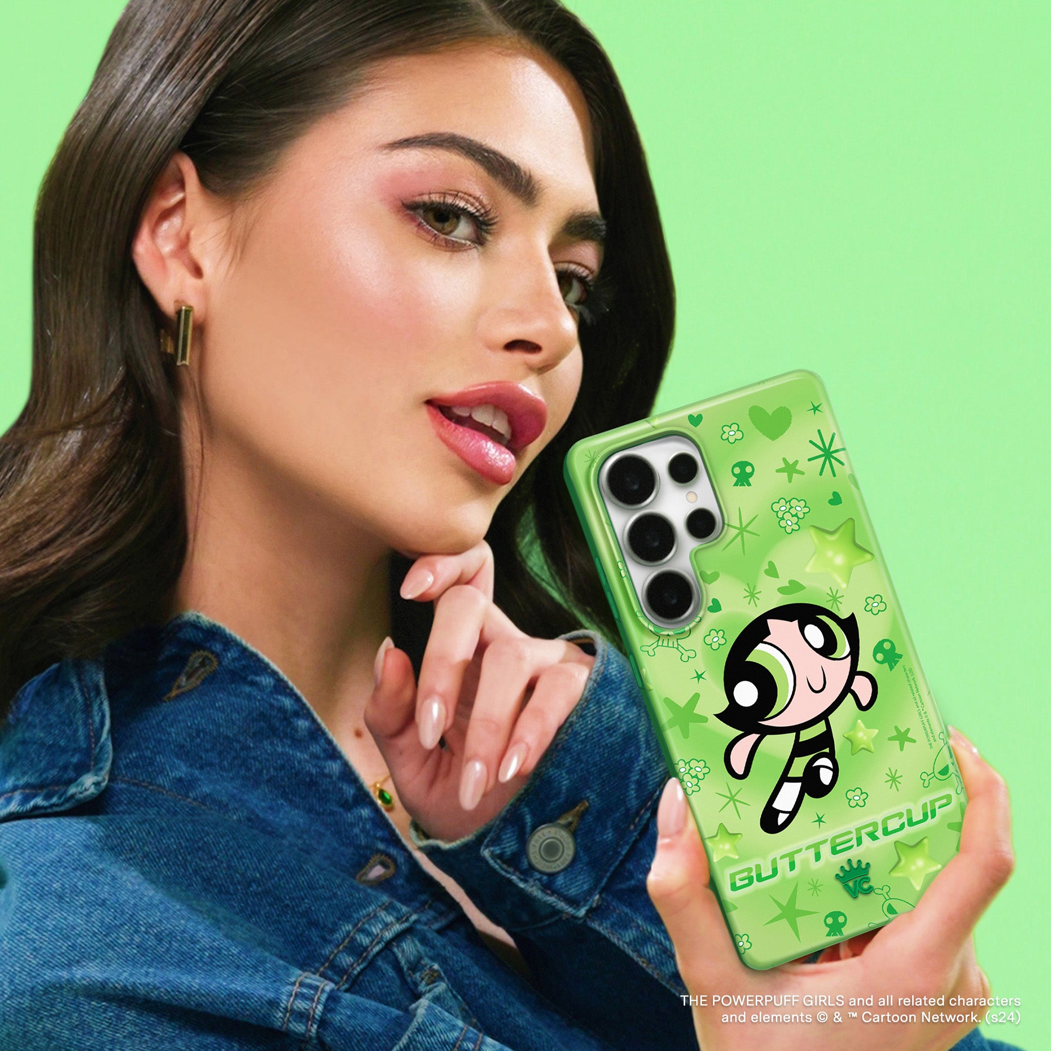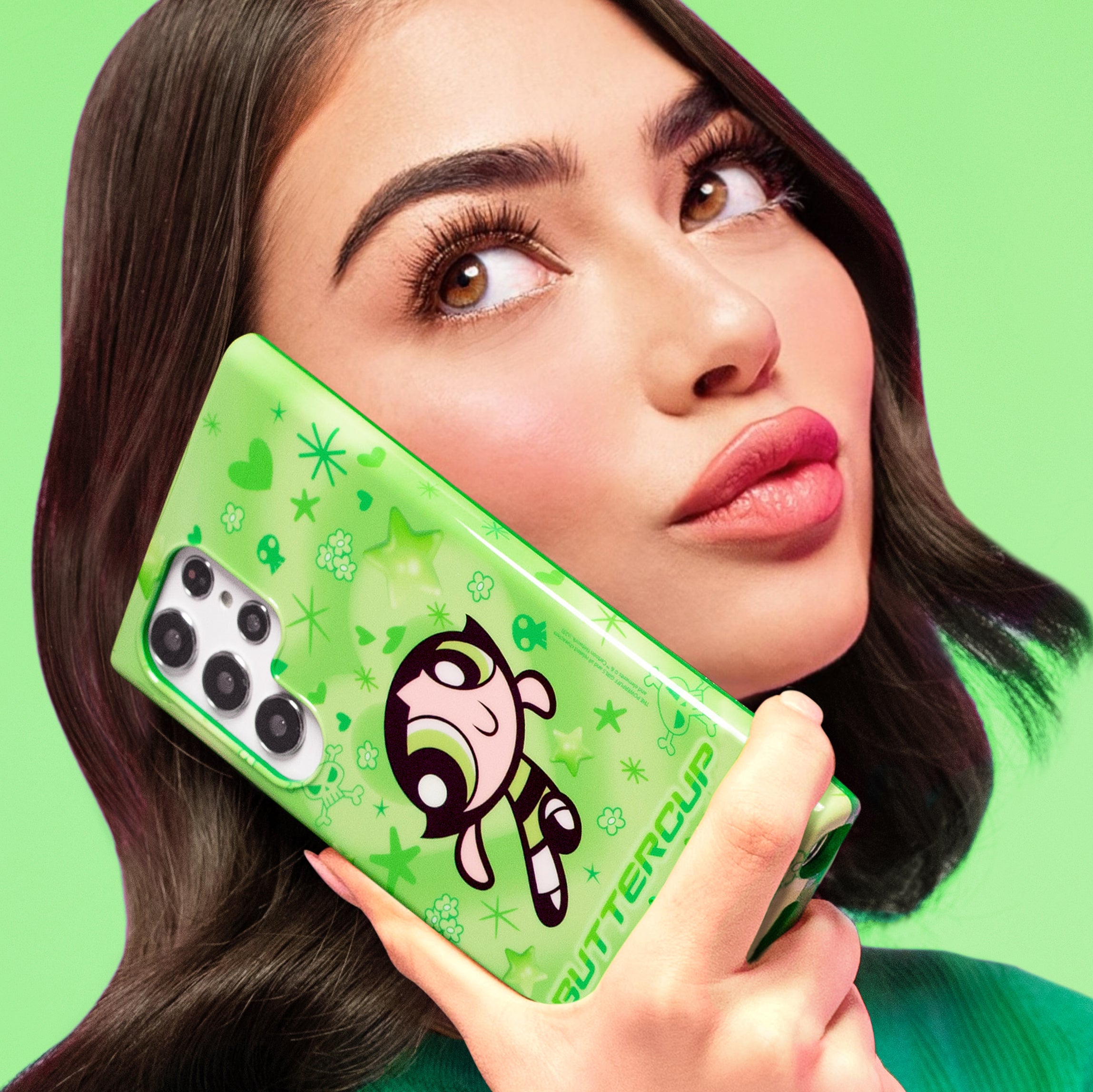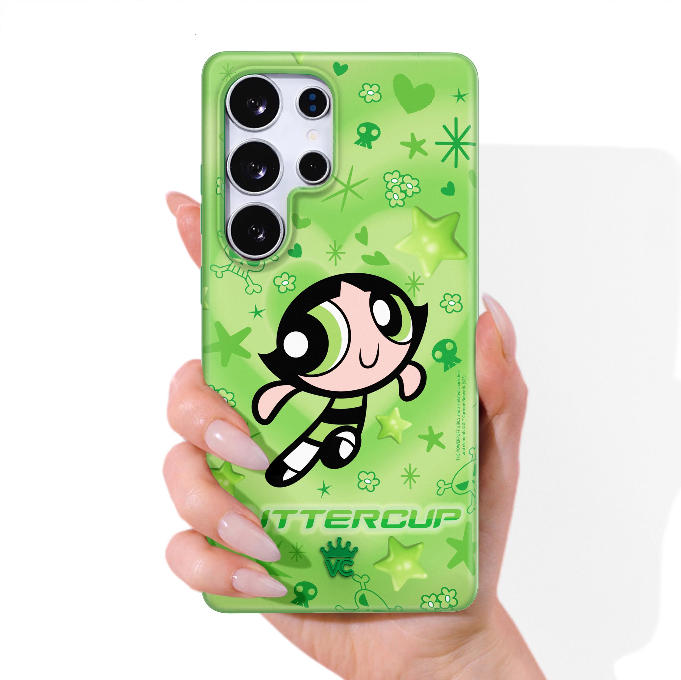 It's Buttercup! This glossy protective case features Buttercup front and center with stars, skulls, and hearts sprinkled throughout all on a radiating heart background in various shades of green.