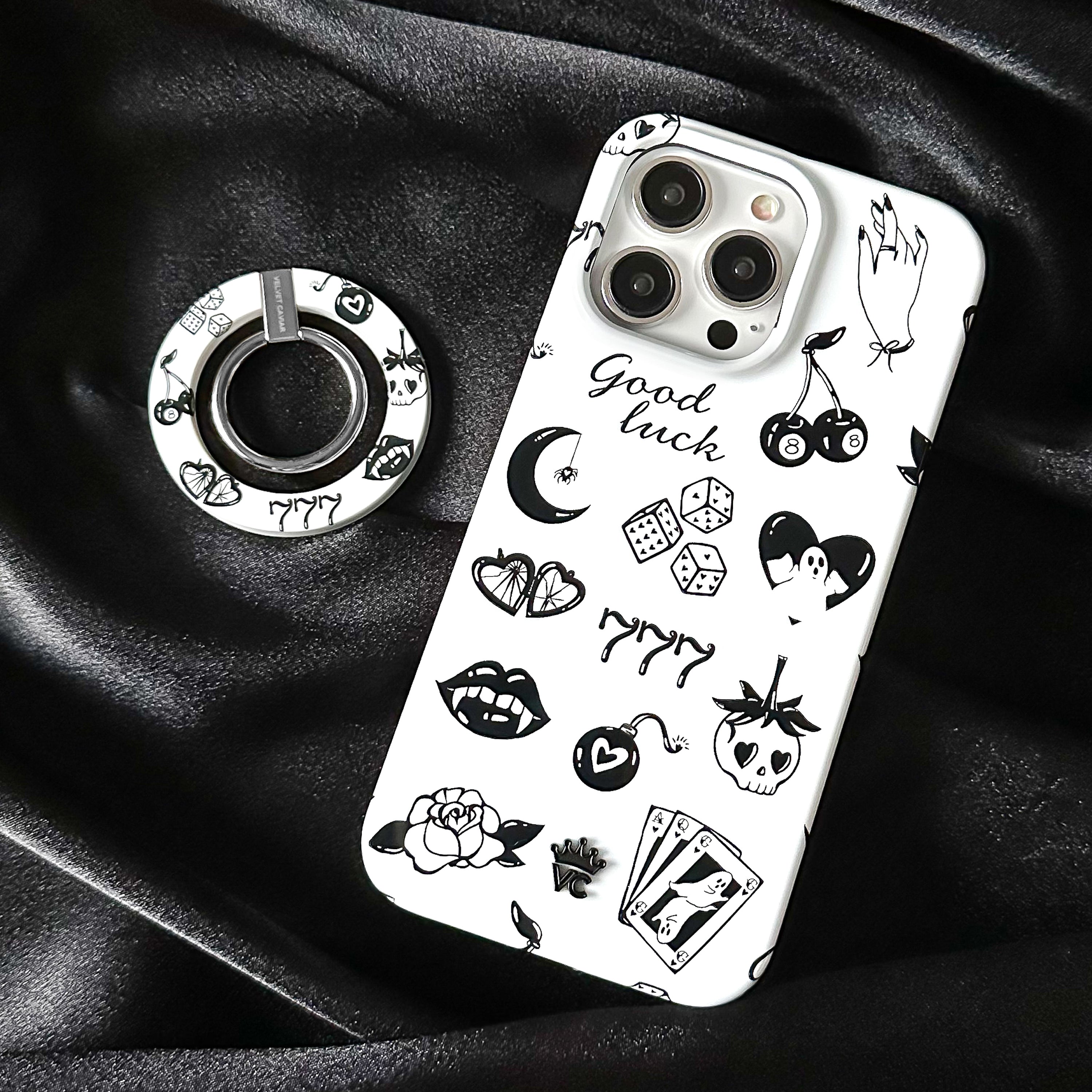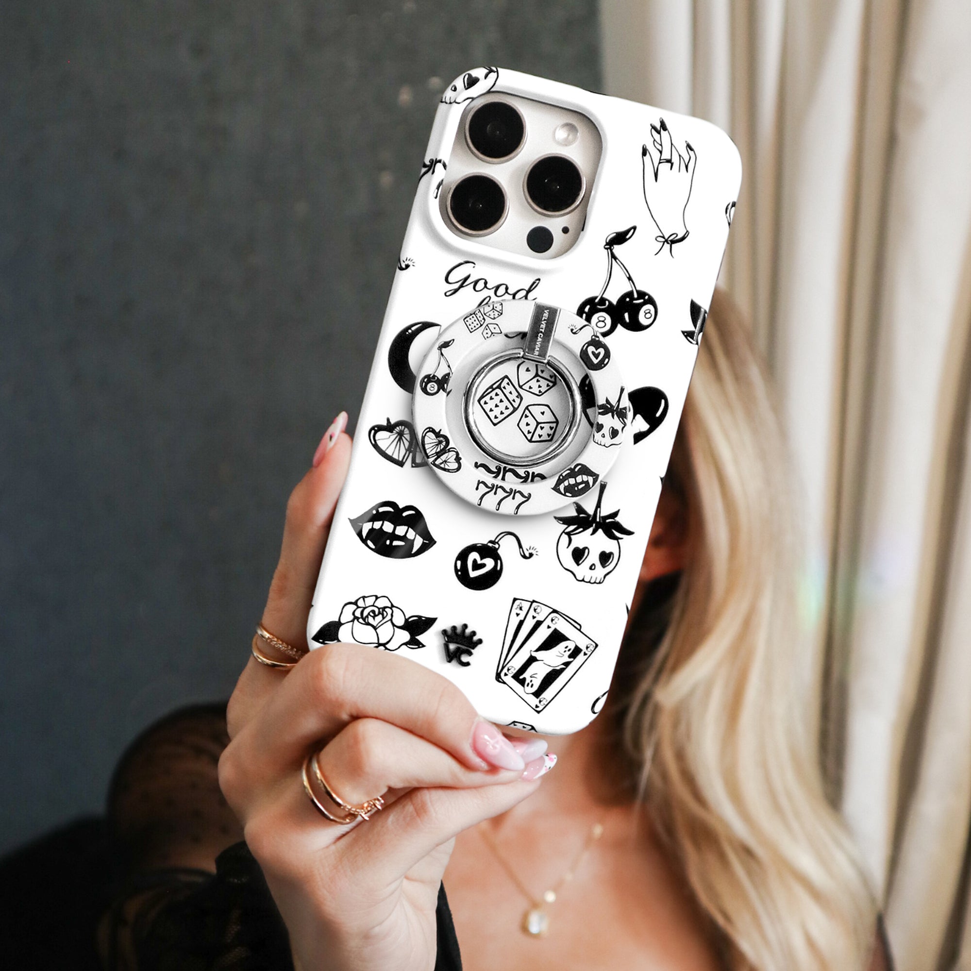 Happy Halloween! This Limited Edition MagSafe case features an array of black flash tatoo-inspired spooky art on a glossy white base with a contrasting black bumper.