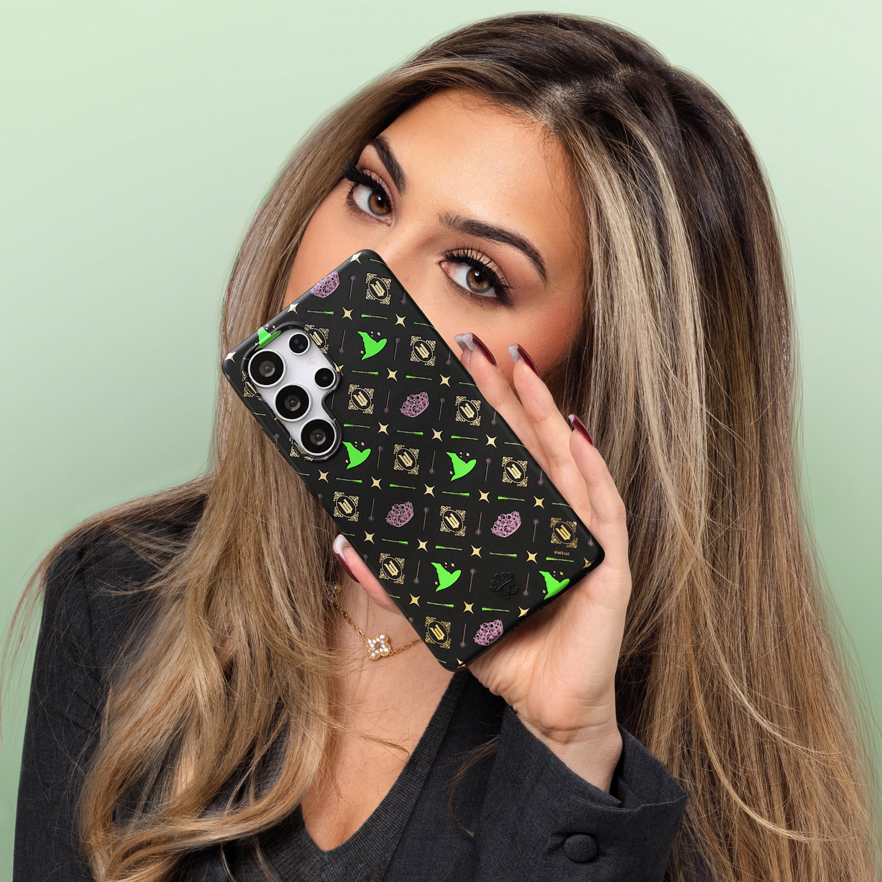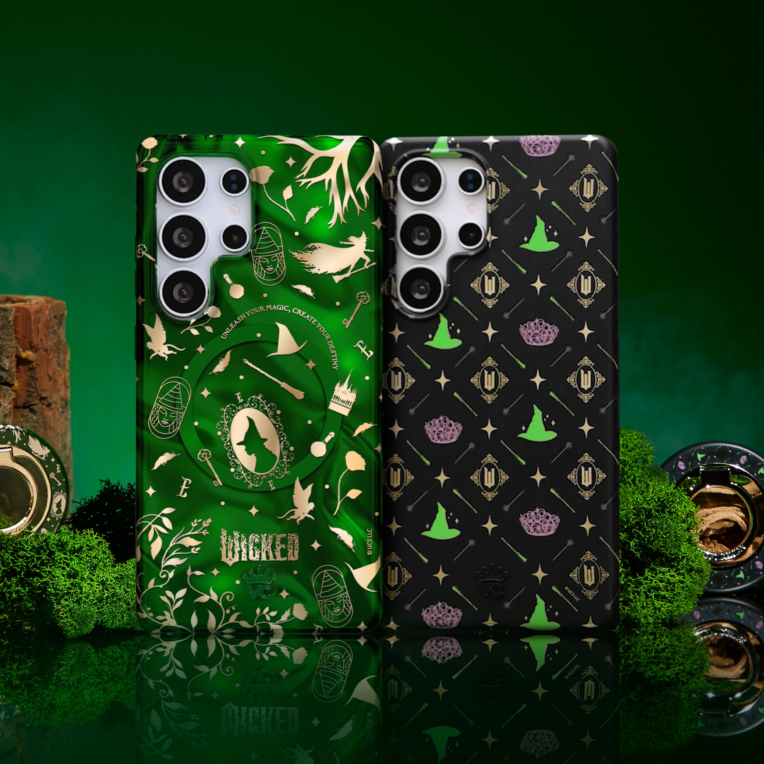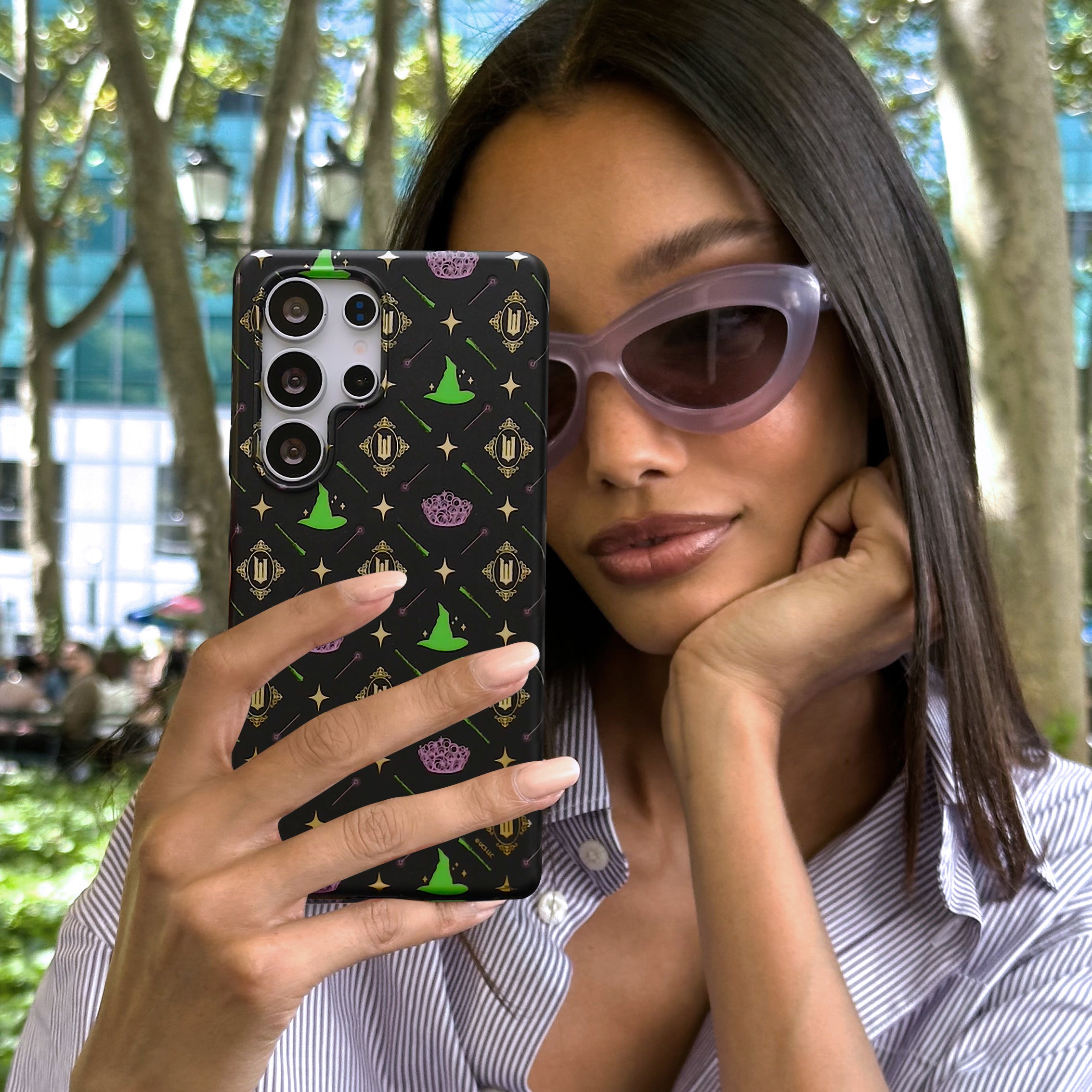 WICKED x Velvet Caviar! This matte black protective case features Glinda's wand and crown, Elphaba's broom and hat, and beatiful gold chrome accents throughout.