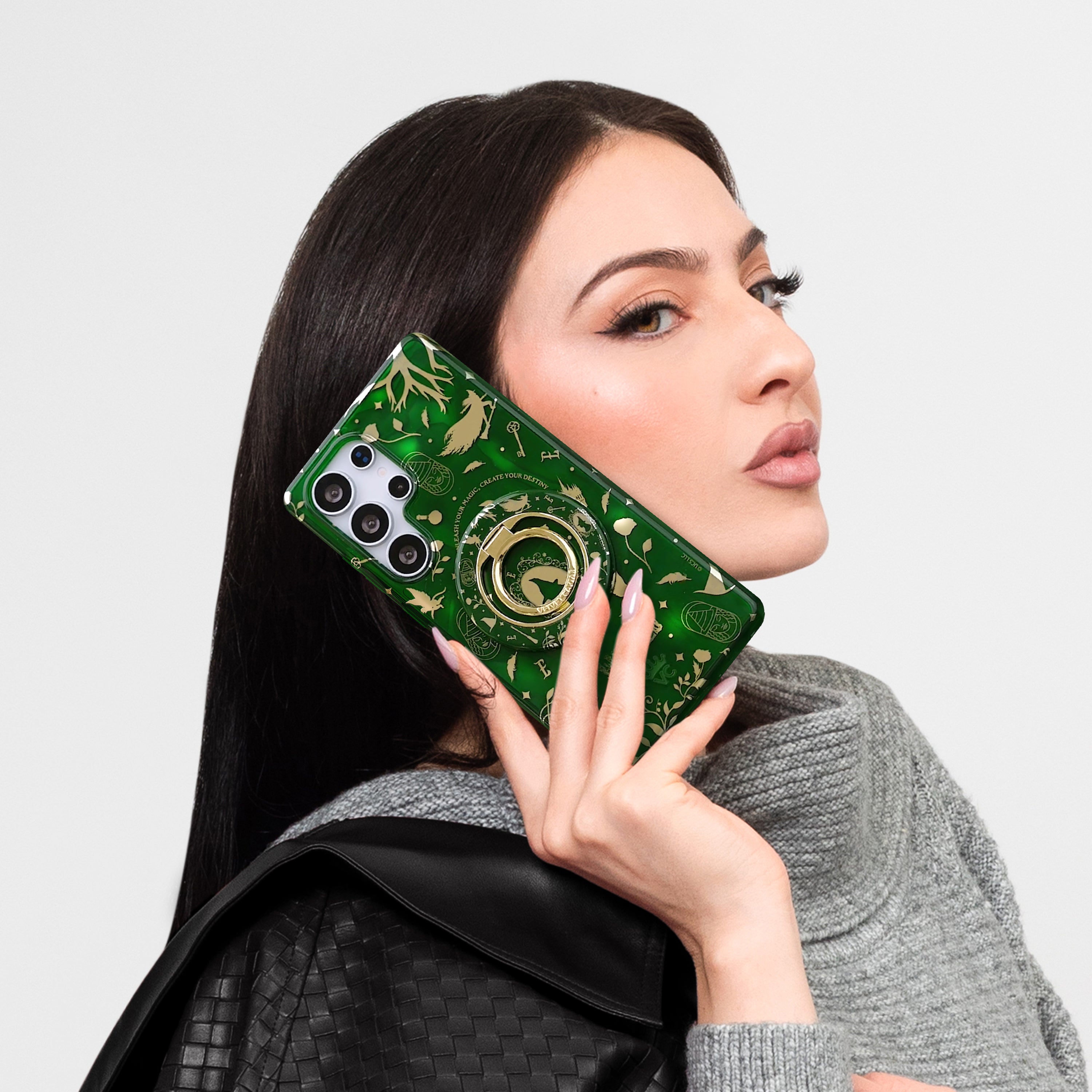 WICKED x Velvet Caviar! This holo protective case features Elphaba all over with gold chrome flying monkeys, brooms, and hats throughout all on a holographic green base.