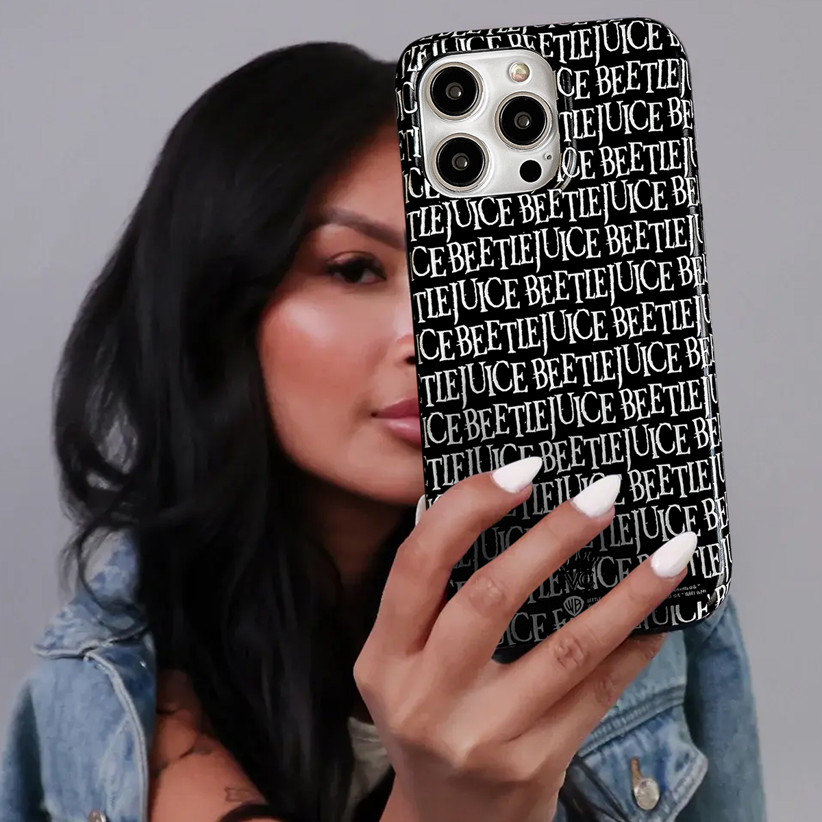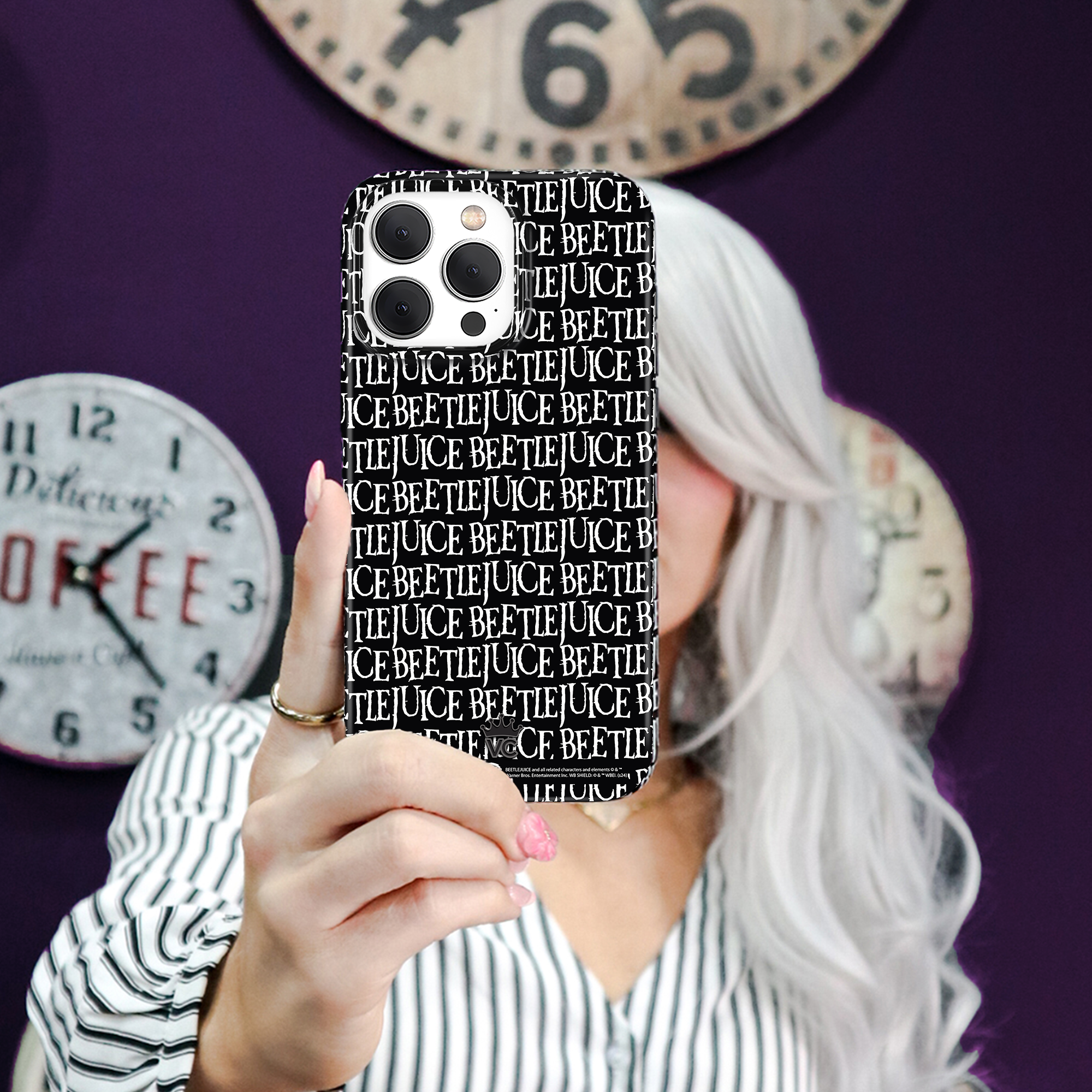 Beetlejuice Beetlejuice Beetlejuice! This MagSafe case glows in the dark! With a matte black base and white Beetlejuice text repeating throughout that glows green when the lights are out.
