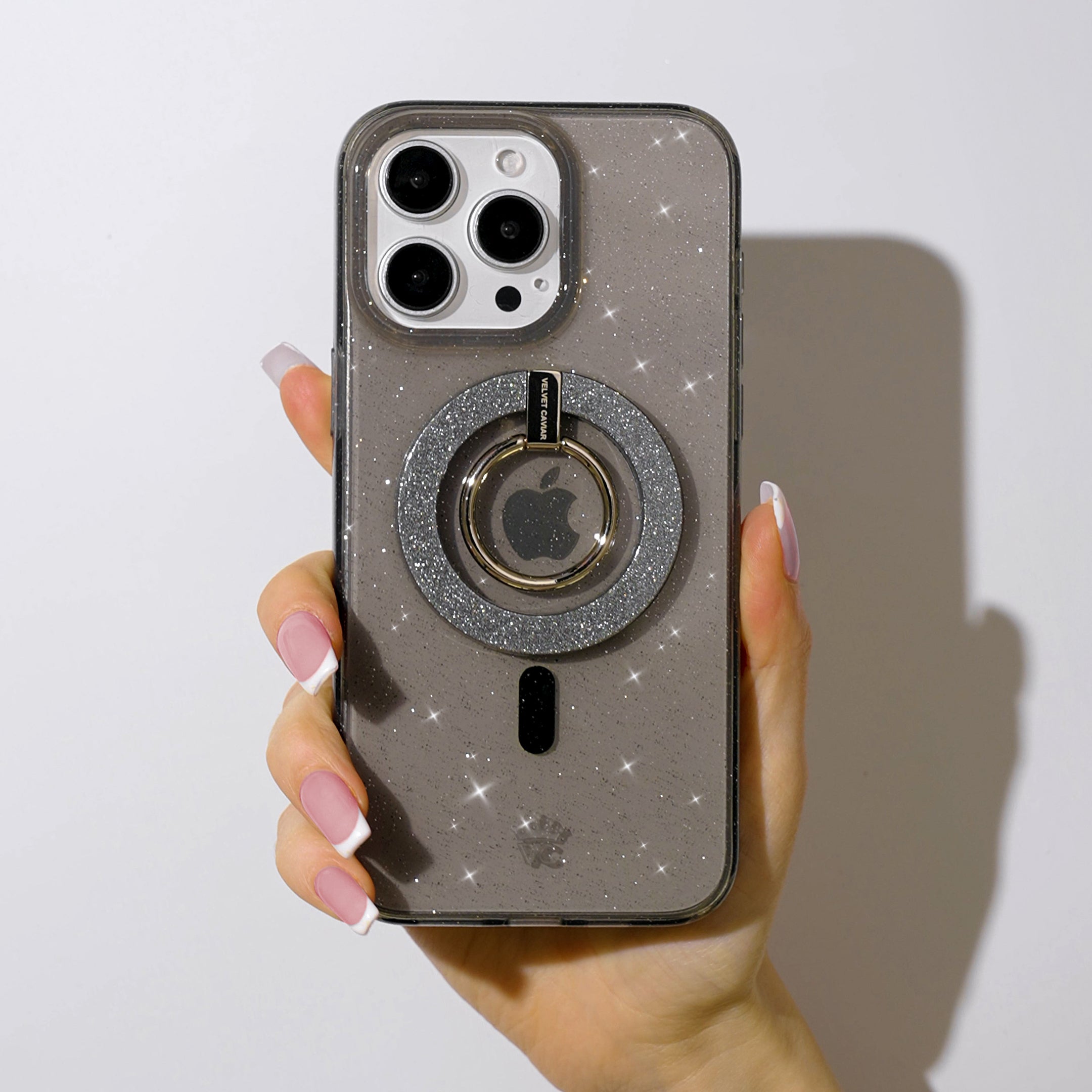 Baby you're a star! Featuring silver glitter sprinkled in a light grey clear case with a gloss finish.
