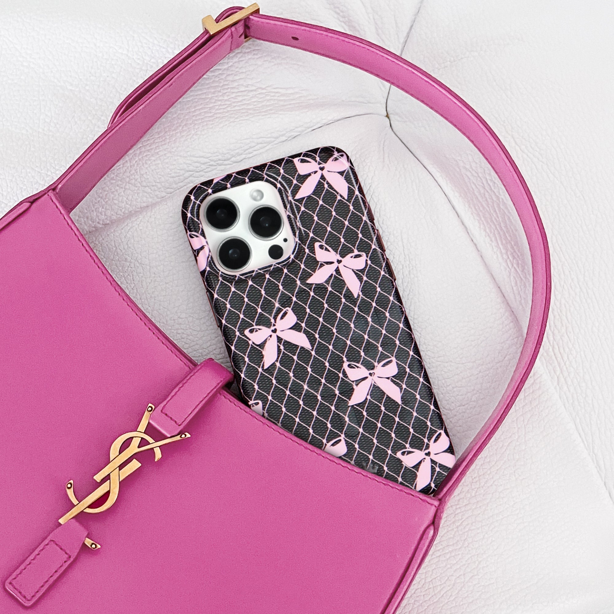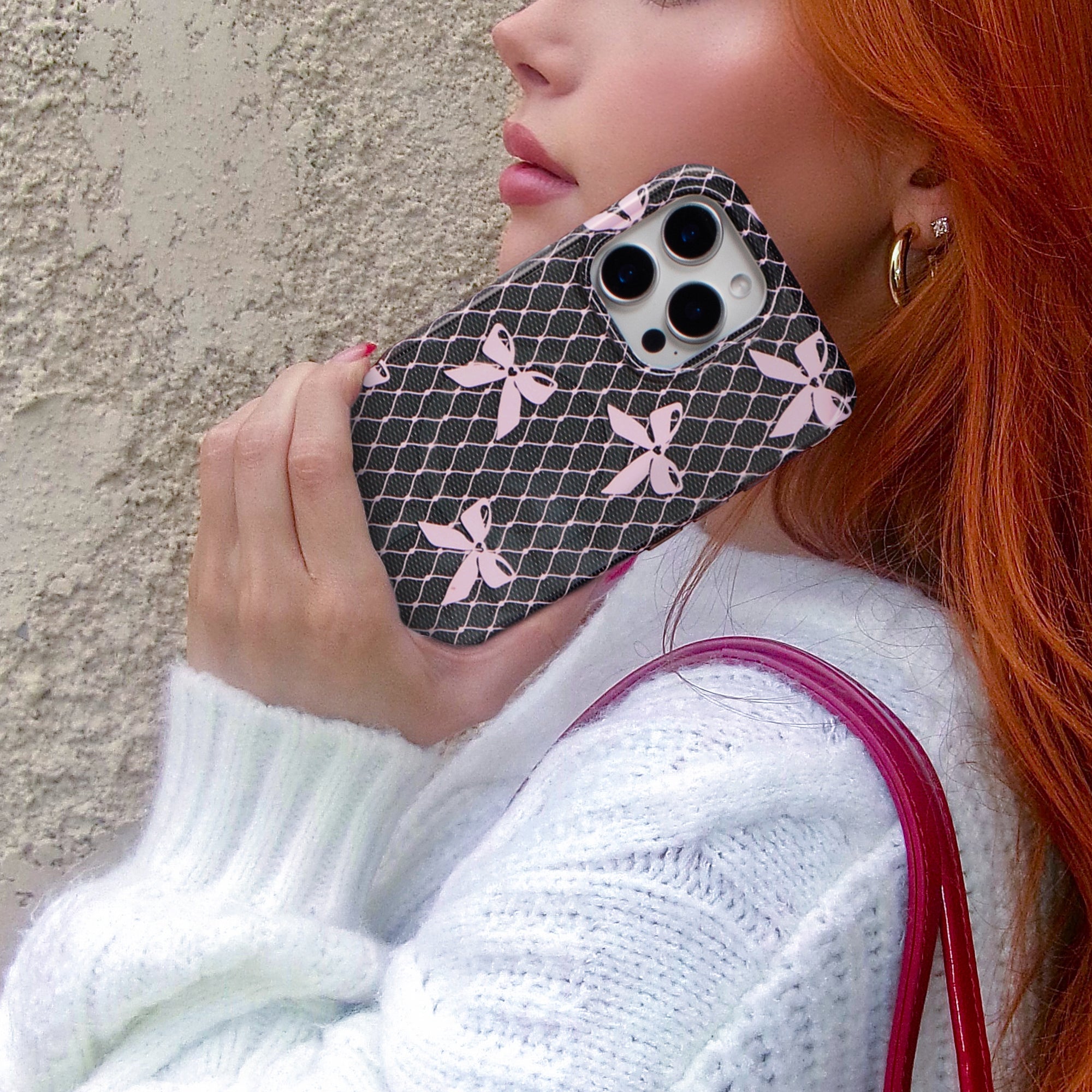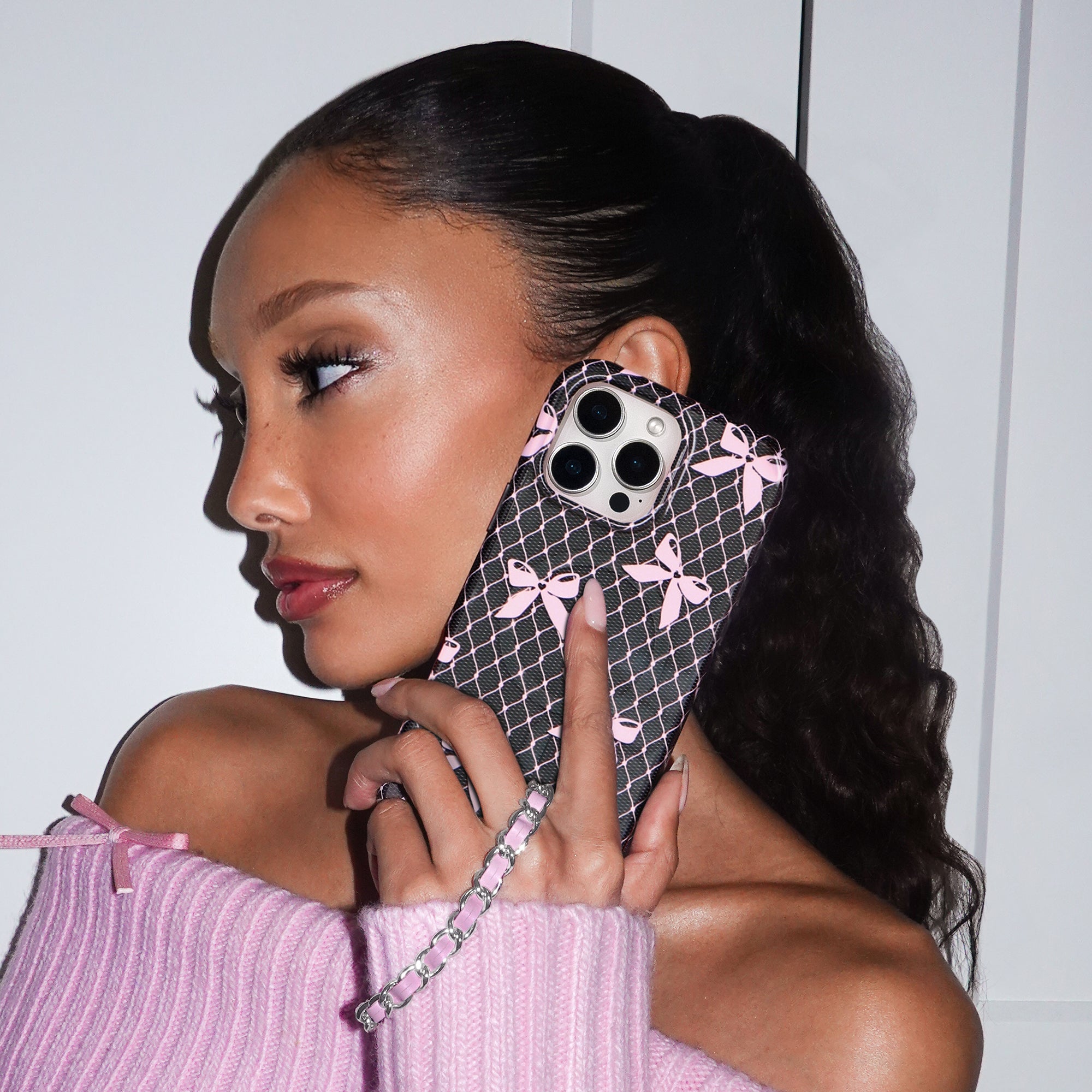 Coquette Core! This Limited Edition MagSafe case features a transparent dark grey base and glossy baby pink lace and bow details.