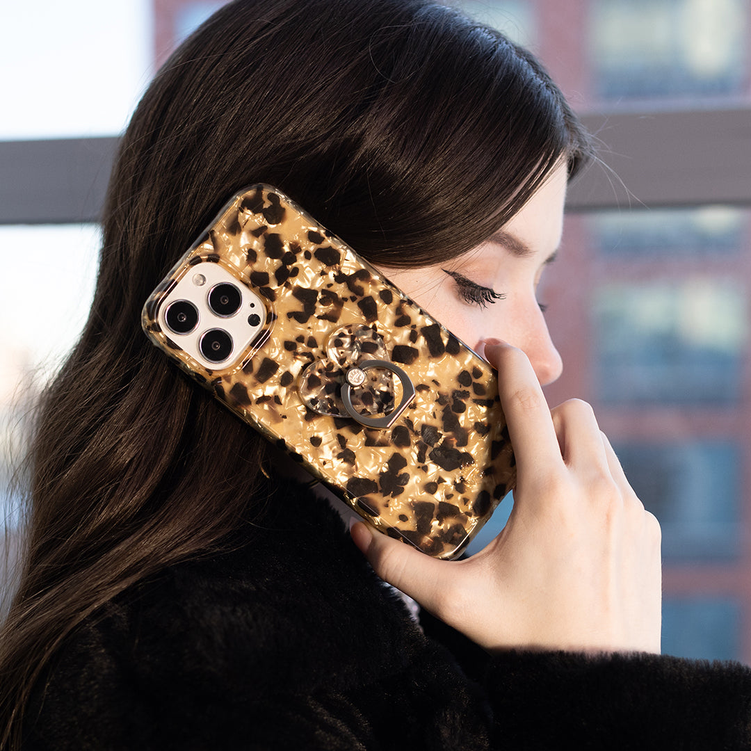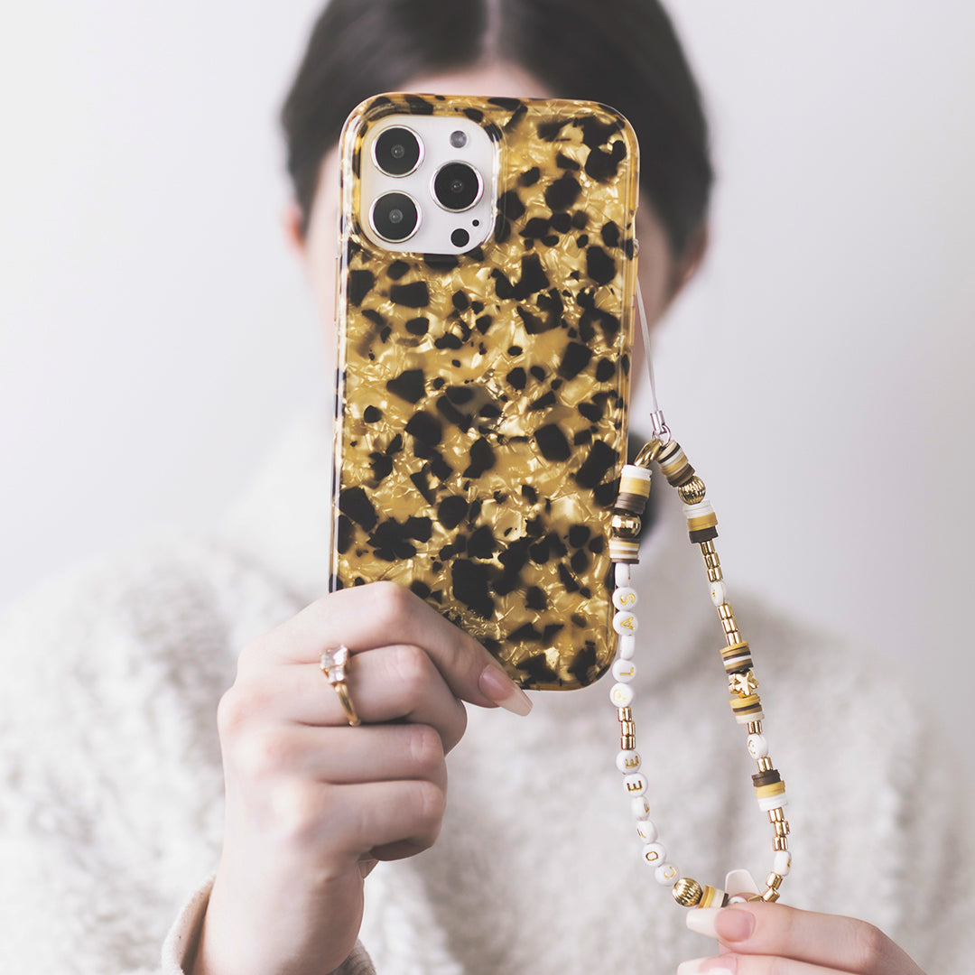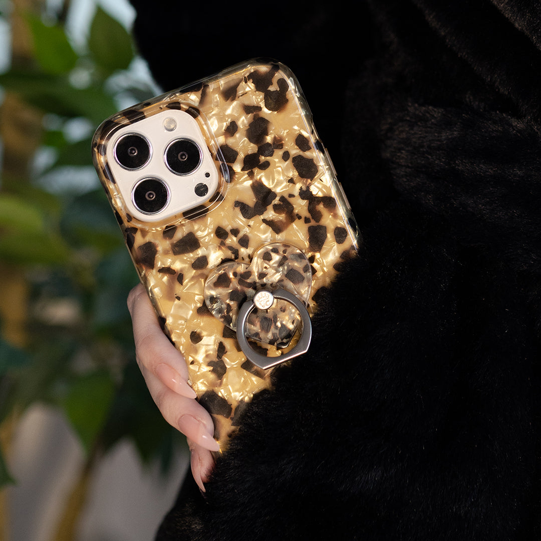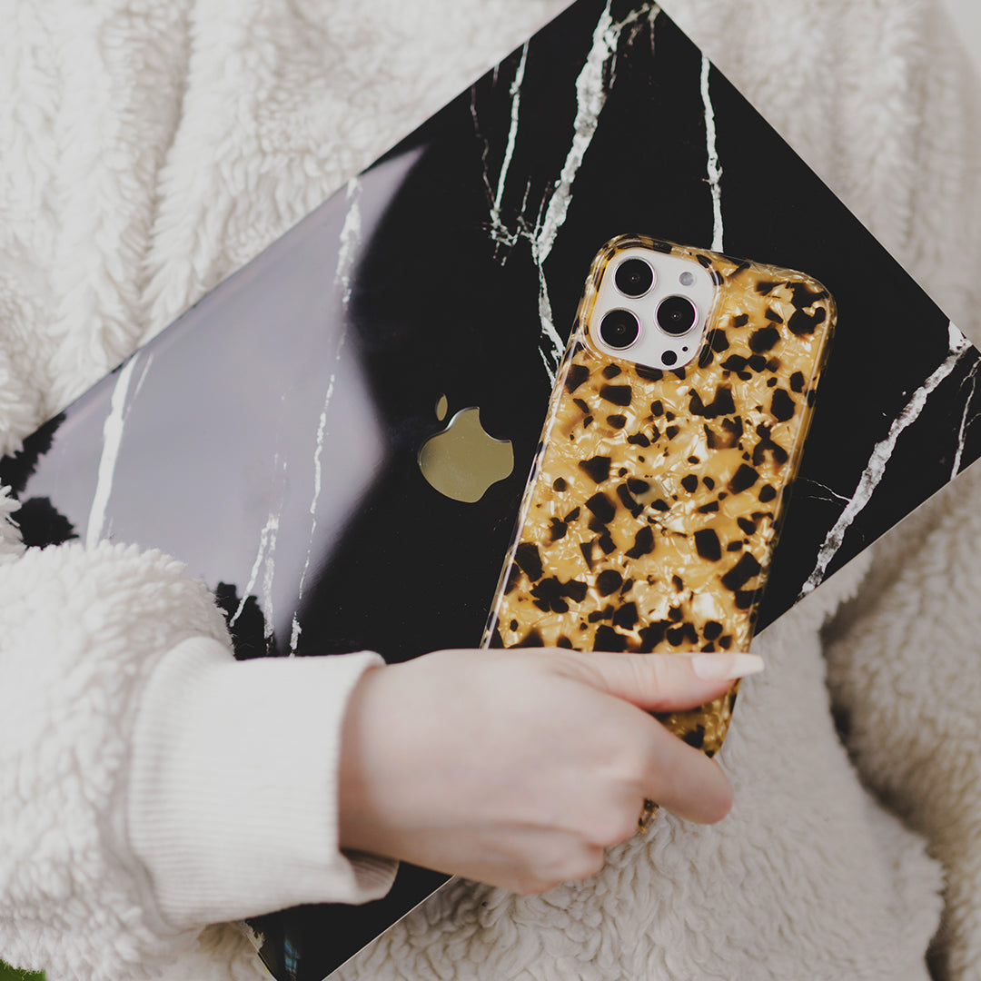 A classic that never goes out of style! This protective case features a stunning multi-faceted blonde tortoise base with chocolate brown spots.