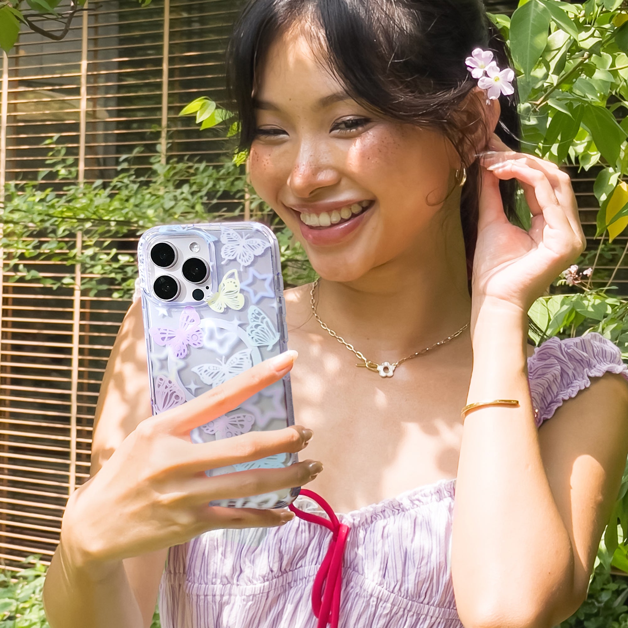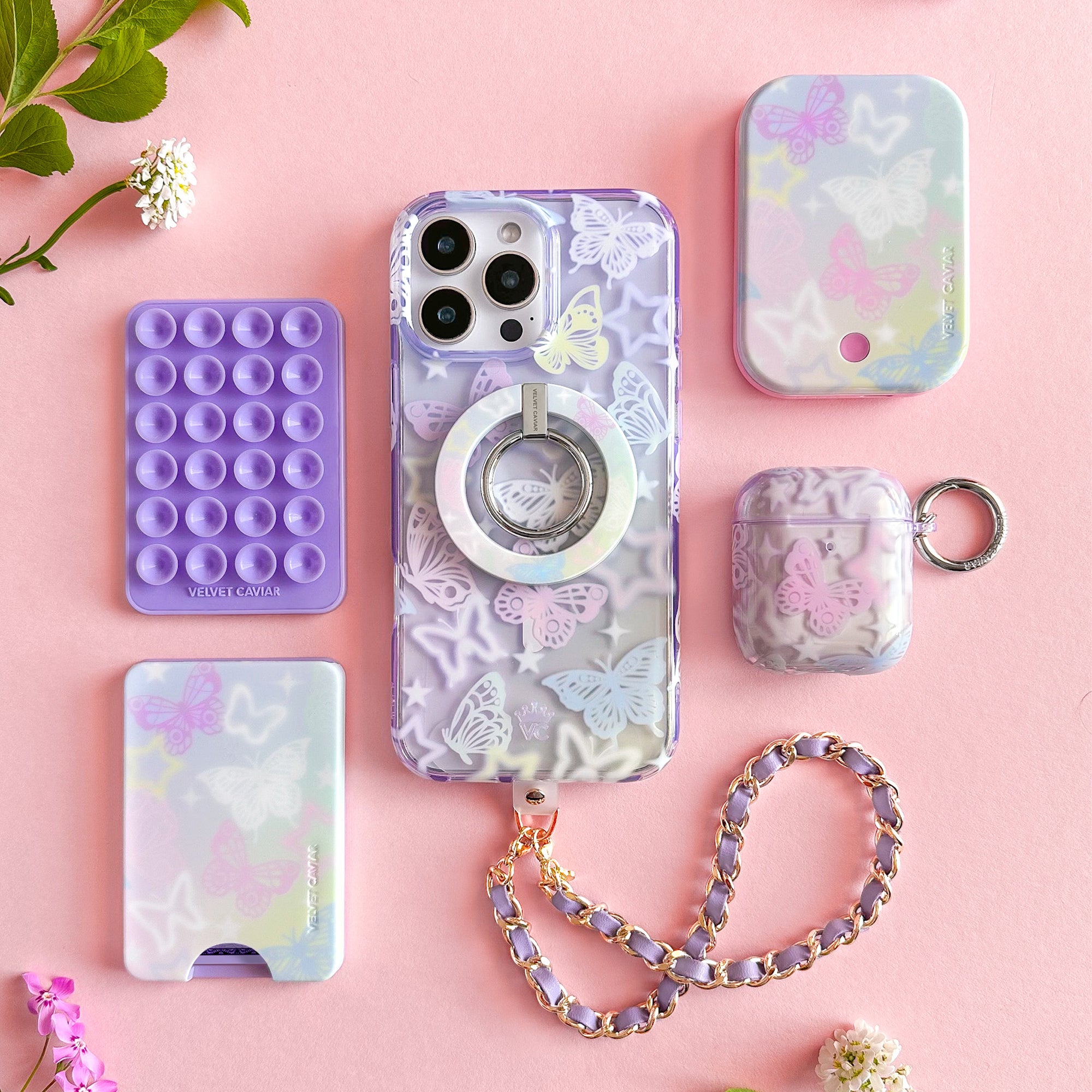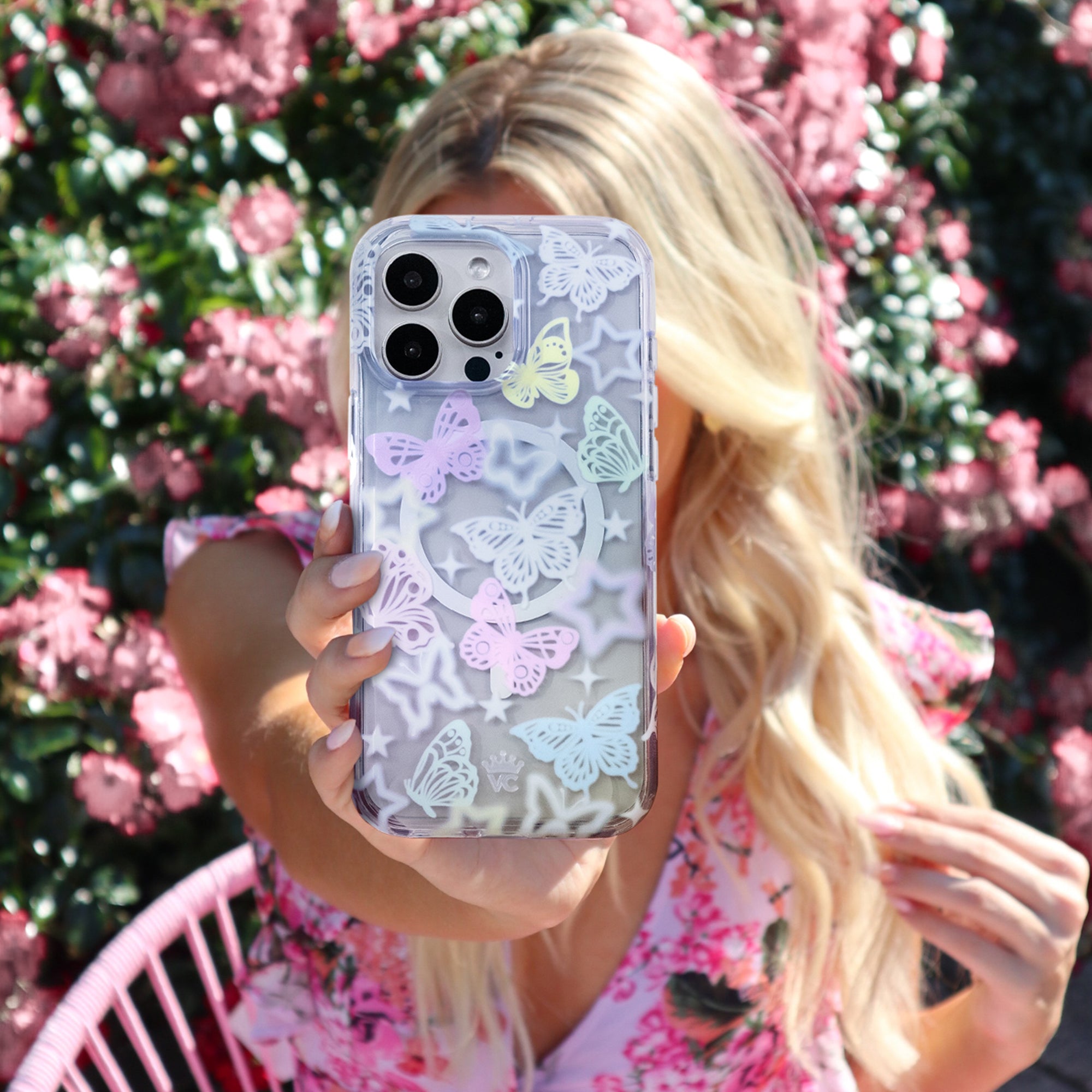 Give them butterflies! This dreamy MagSafe case features magical pink, lilac, butter yellow and baby blue butterflies on an pastel ombre clear base.