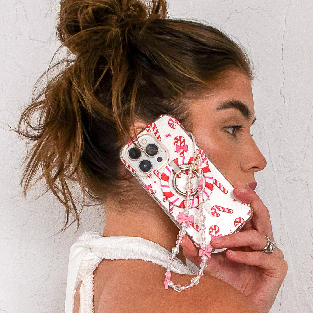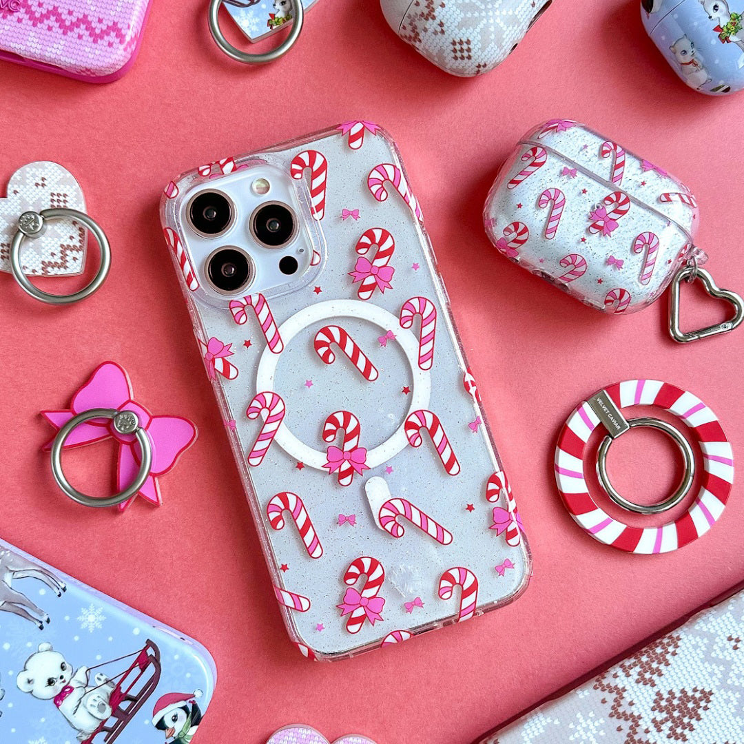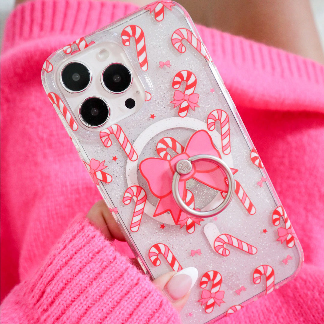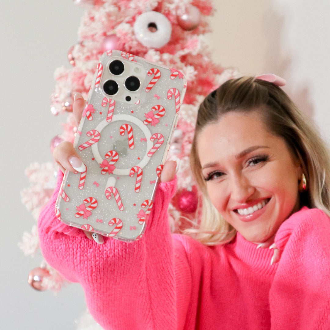 Take a walk down Candy Cane Lane! This protective clear case has silver glitter sprinkled into the base and bumper and is covered in adorable peppermint candy canes and pink bows.