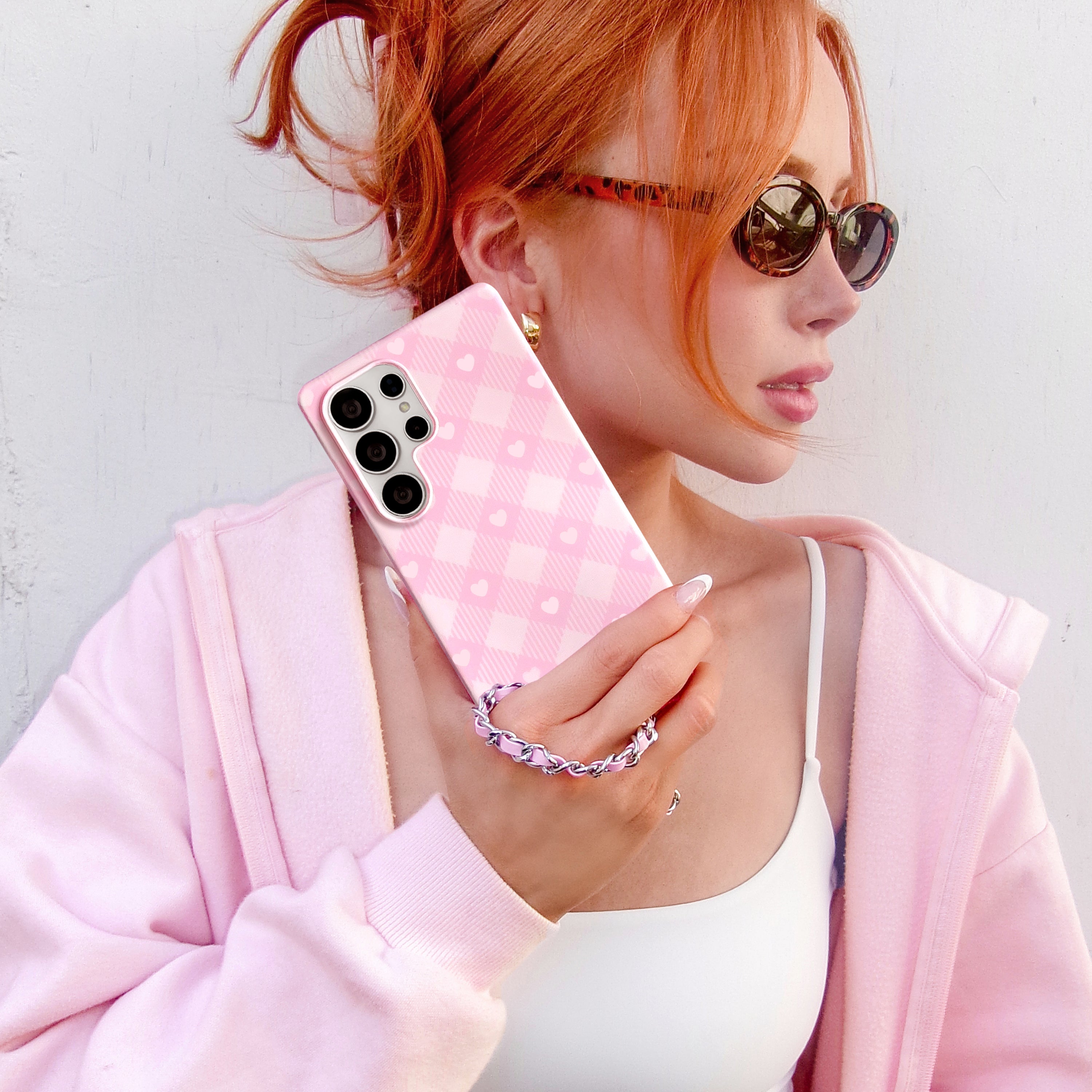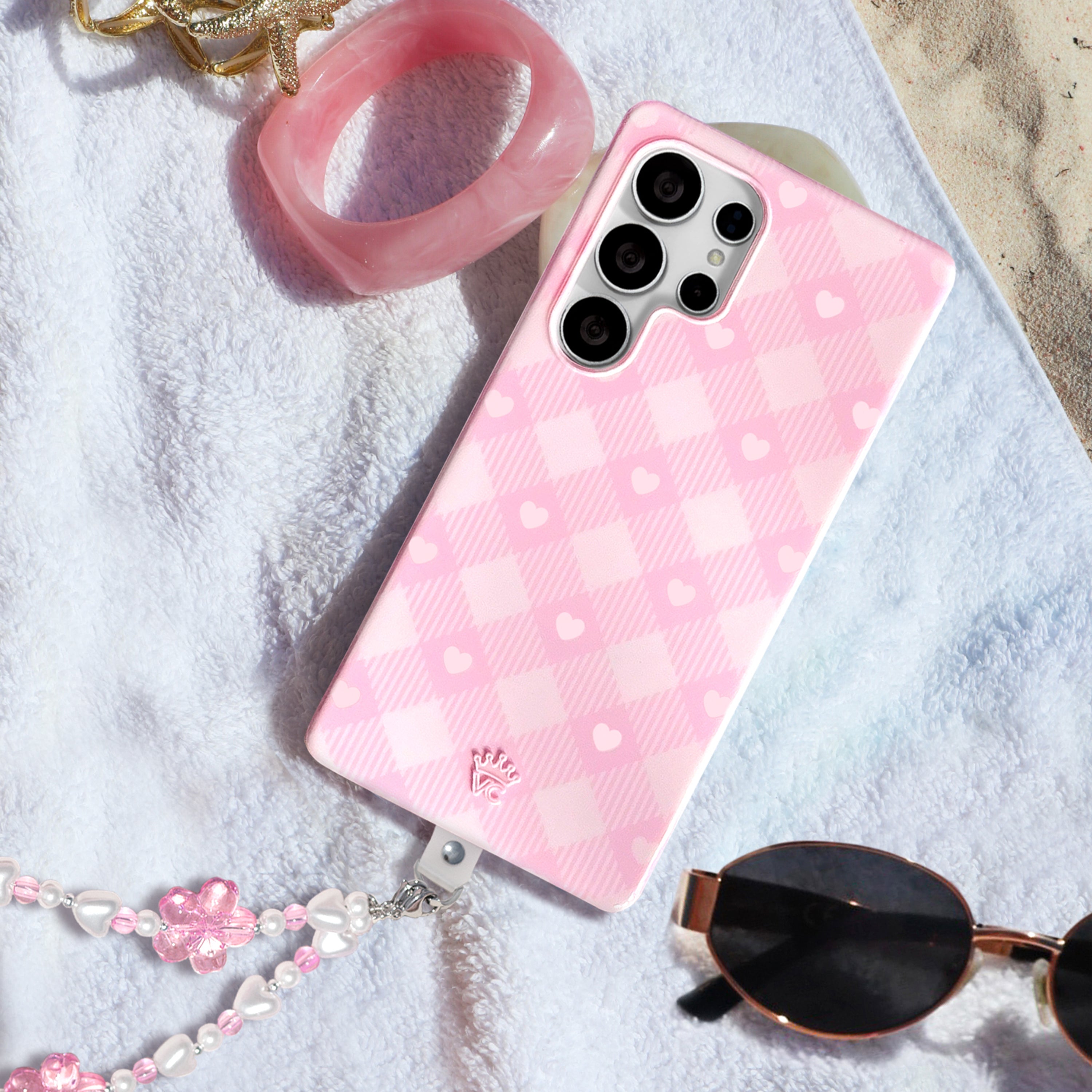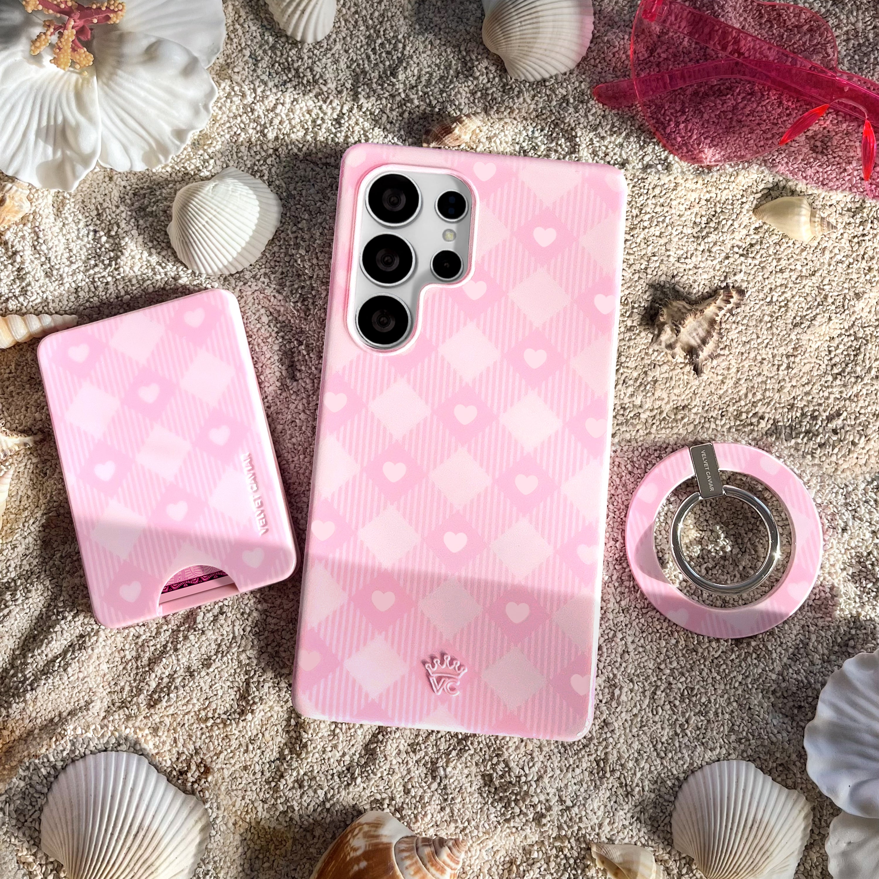 Picnic Pink! This cute protective phone case features a classic cool toned pink gingham print and baby pink hearts with a matching base and bumper.
