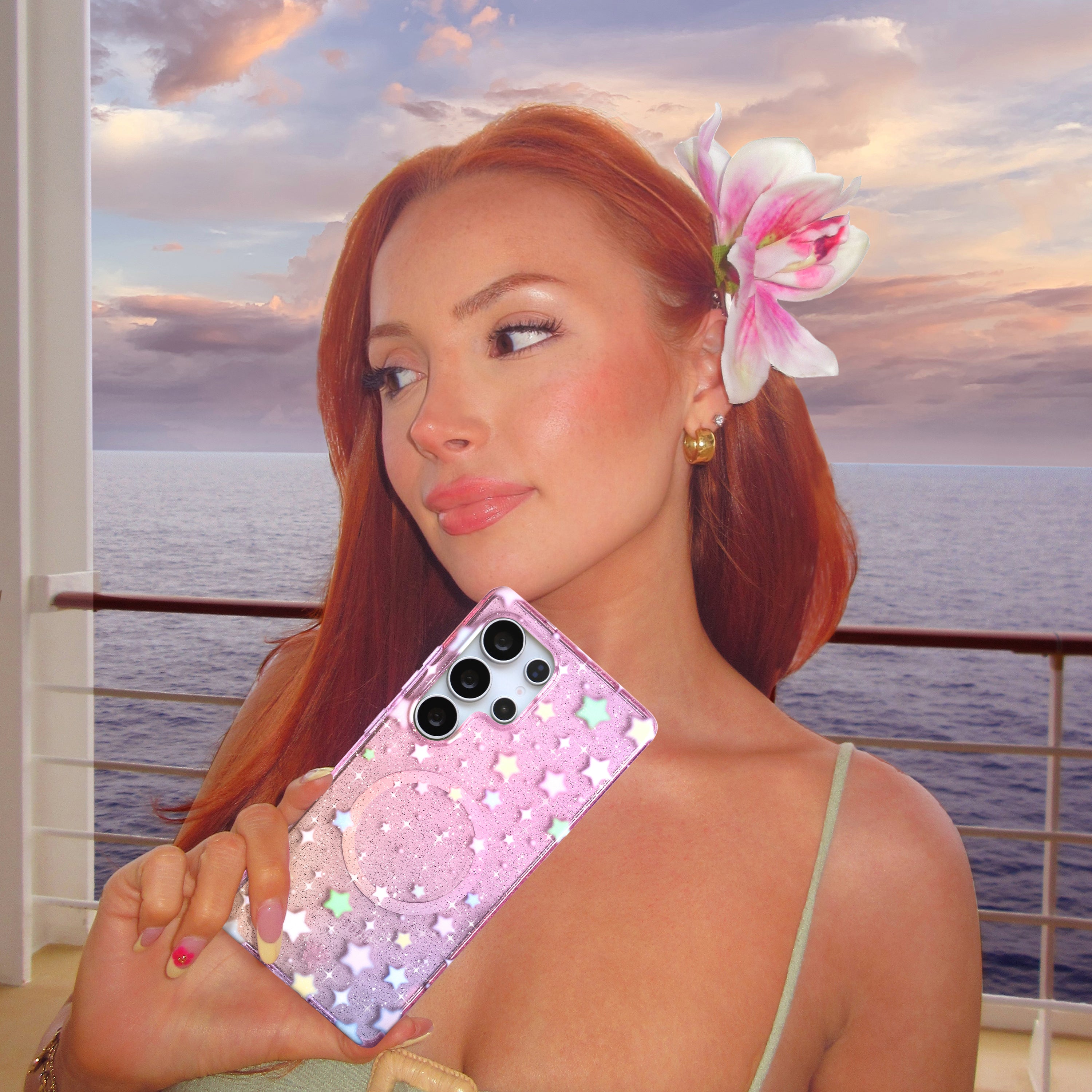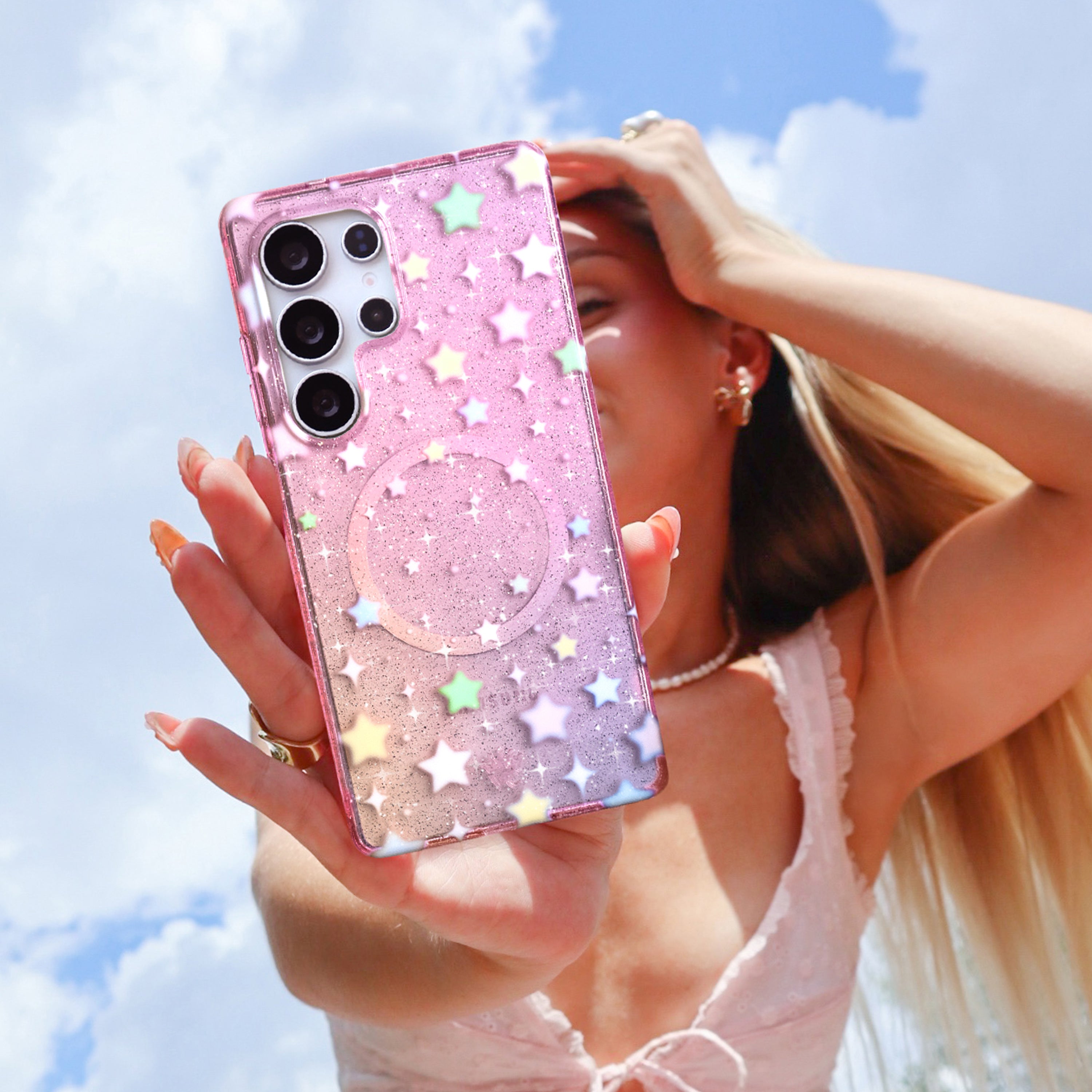 You're a star! This protective case features stunning pastel stars scattered on a clear ombre sunset base with silver stardust glitter sprinkled throughout the base and bumper.