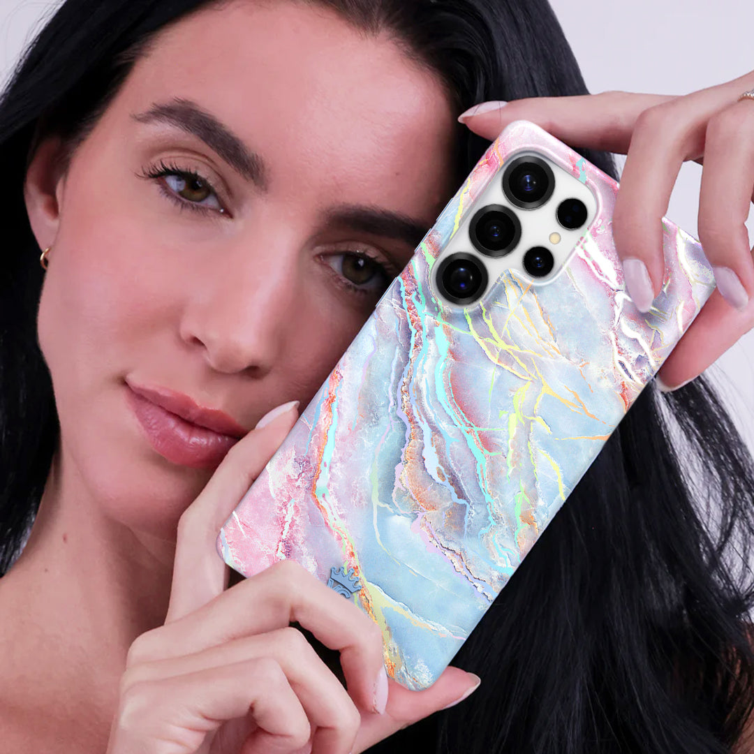 Iconic and original! This case features gorgeous pastel blue and pink colors topped with shiny holographic chrome!