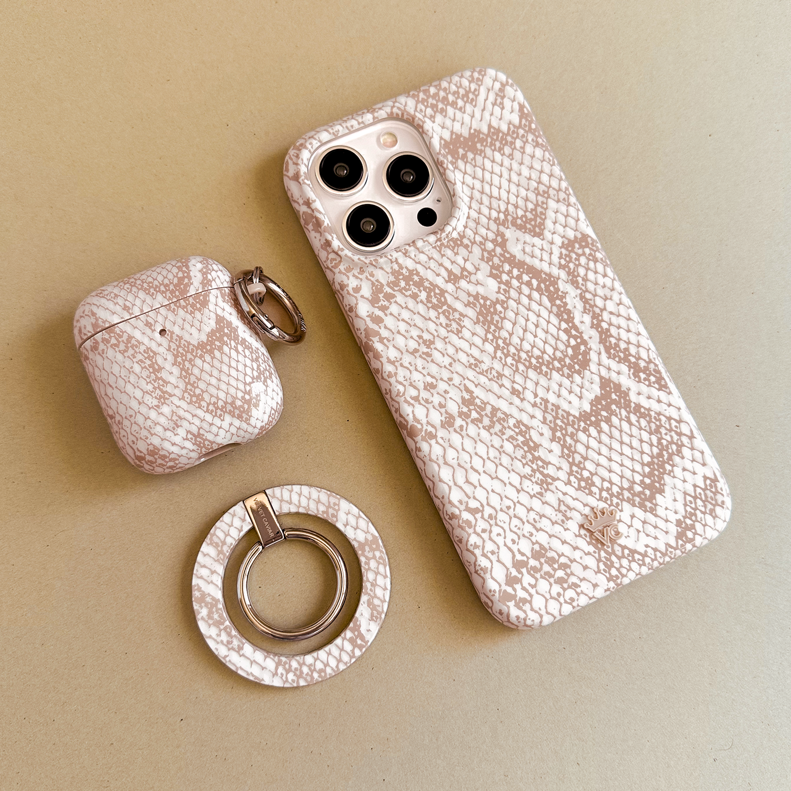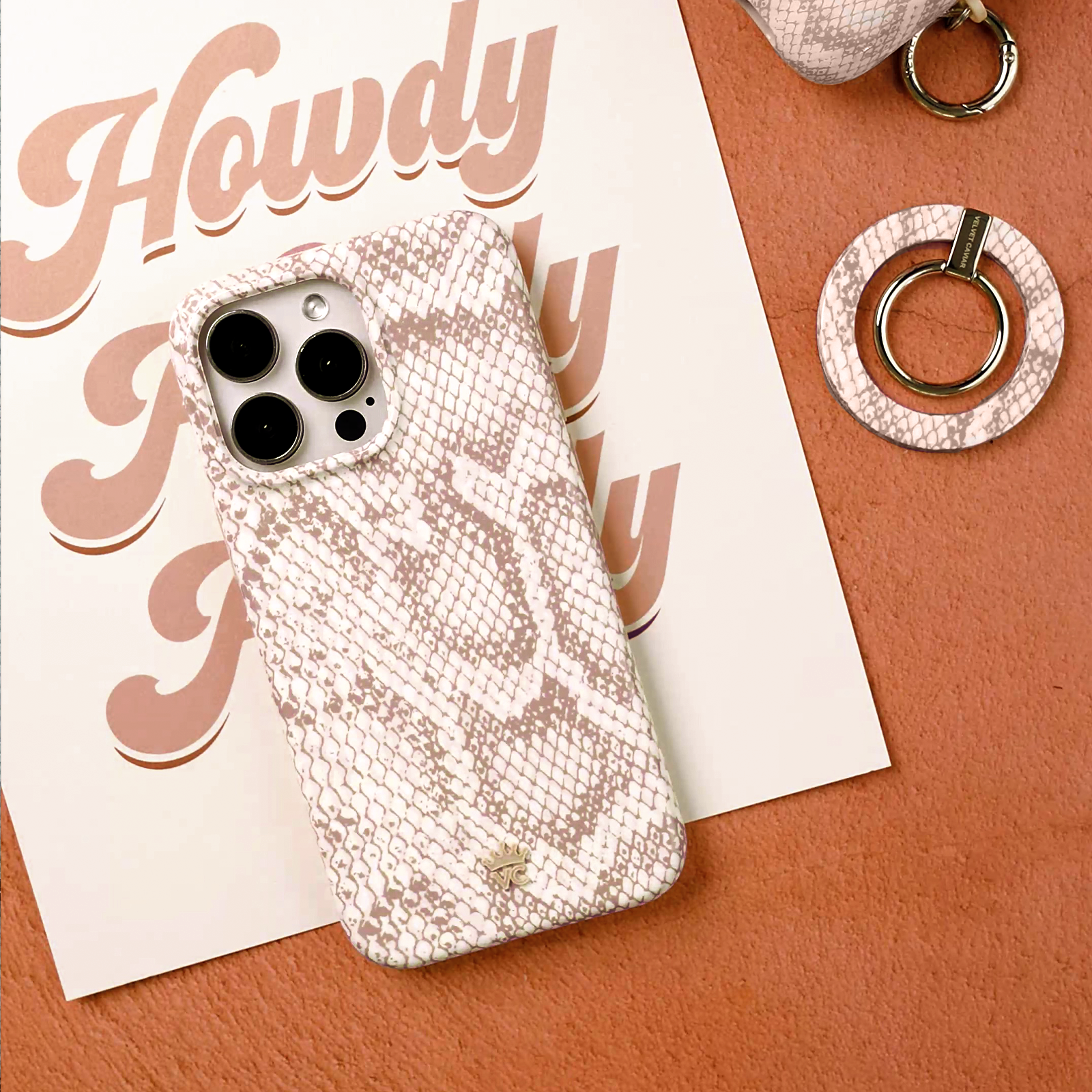An ode to our exes! This western rodeo MagSafe case features a neutral python pattern with a matte cream base and glossy nude reflect.