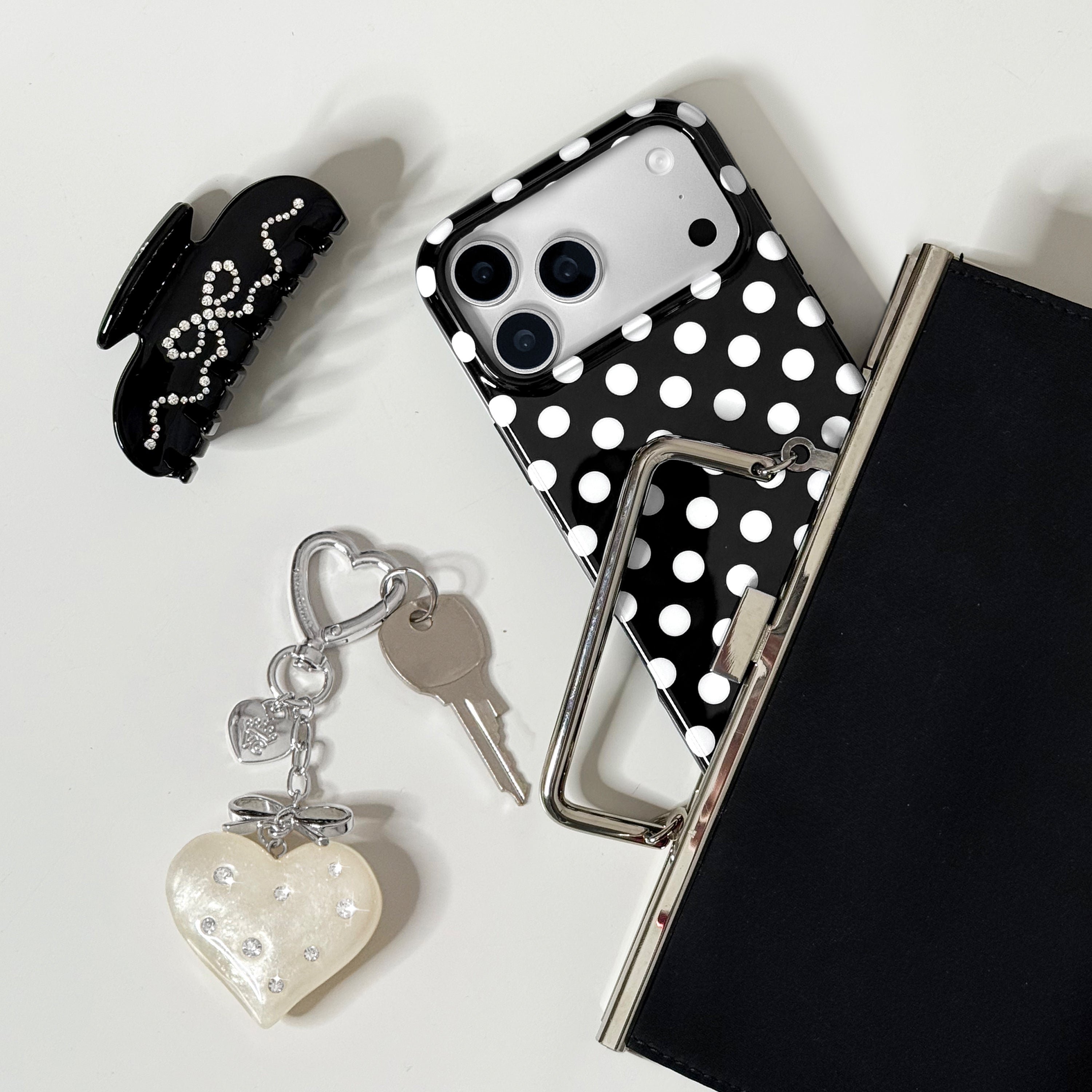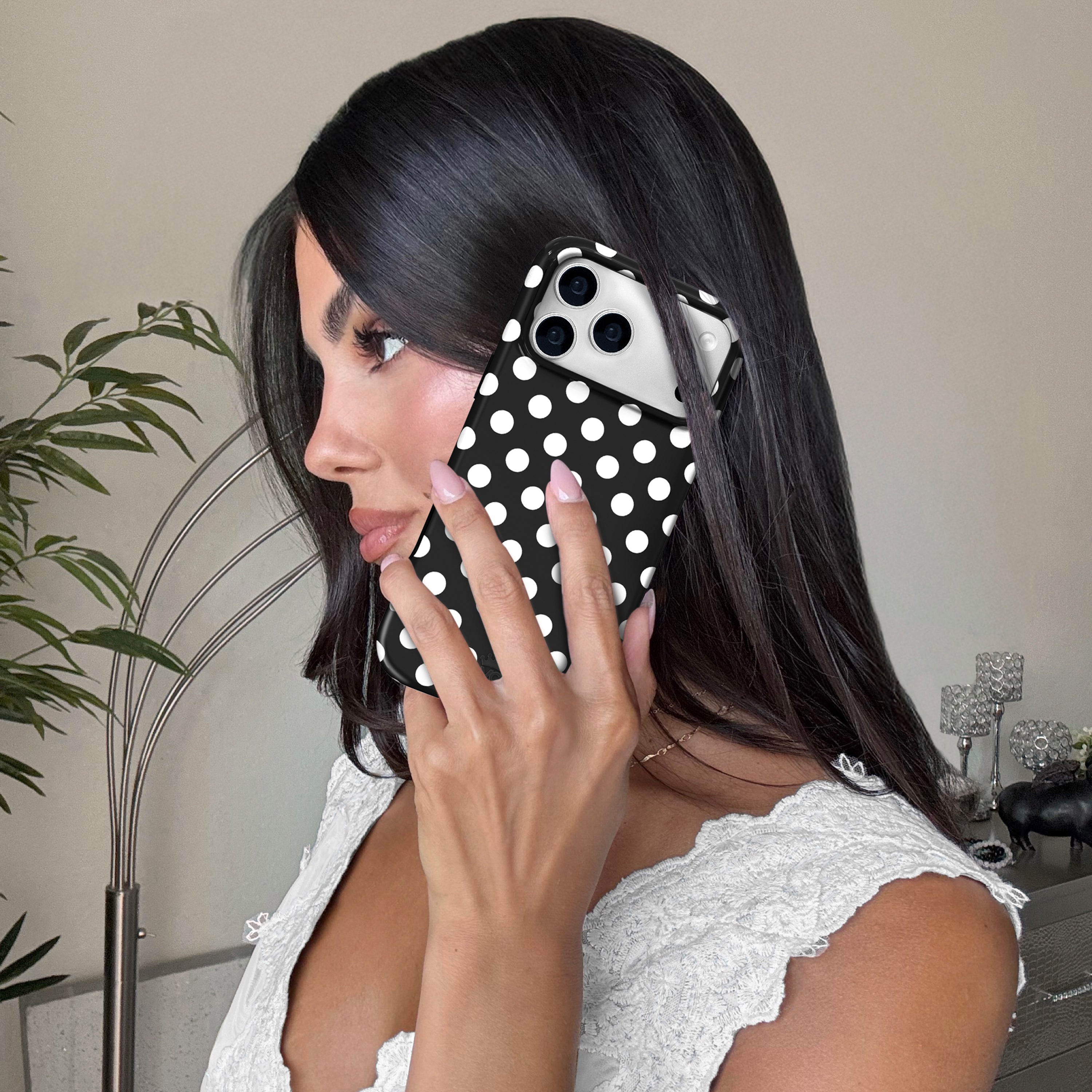 Playful and posh! This simple MagSafe case features trending white polka dots on a glossy black base.