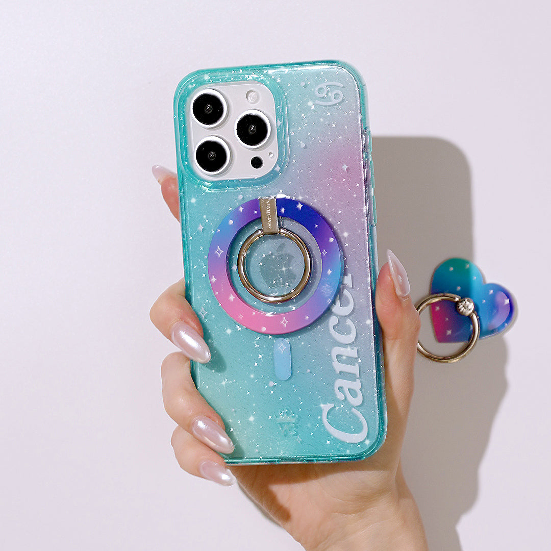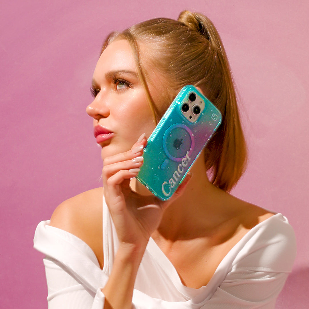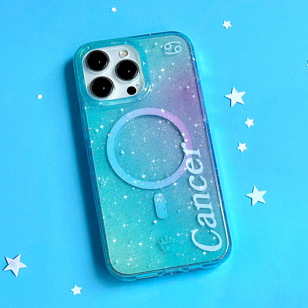 Cancer's are Loyal, Sentimental, and Kind! This MagSafe case comes in a gorgeous blue colorway inspired by the unique elements of Cancer with silver glitter sprinkled into the base and bumper. This case is part of our Zodiac Collection in collaboration with Sanctuary™