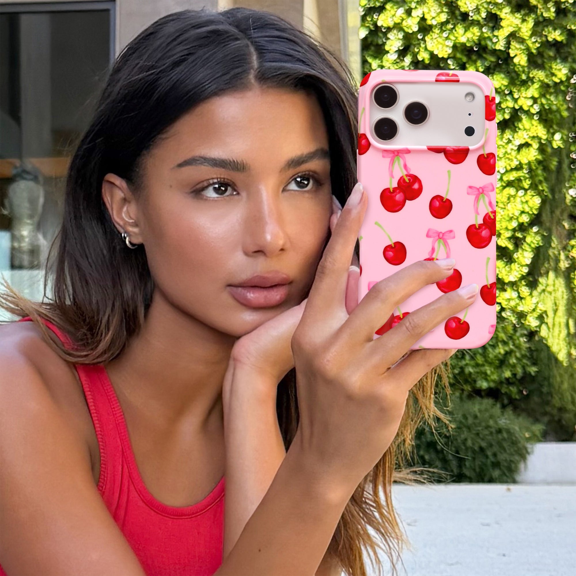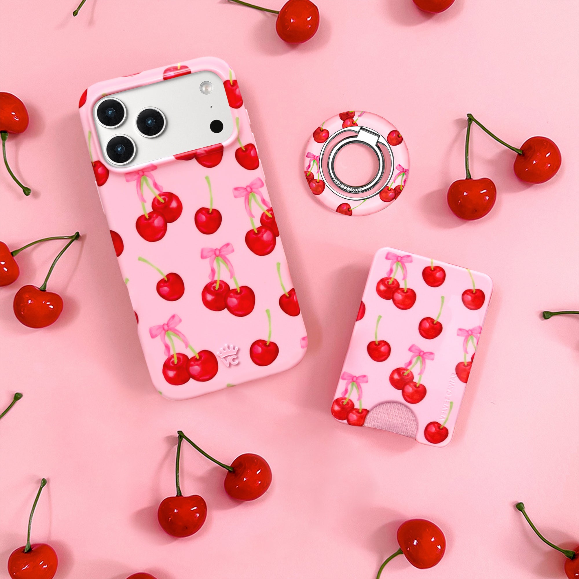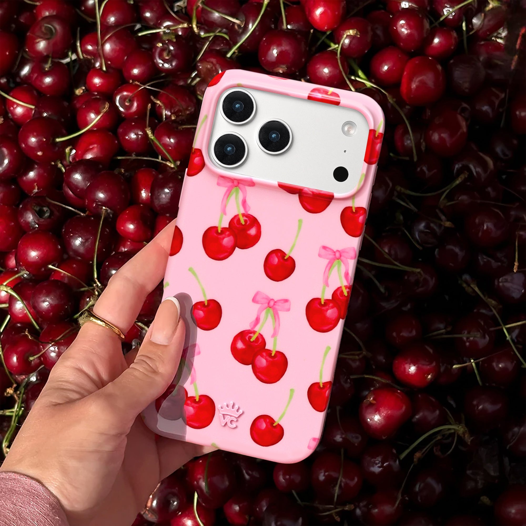 Oh so sweet!This Limited Edition MagSafe case features red watercolor cherries and pink bows on a glossy bubblegum pink base.