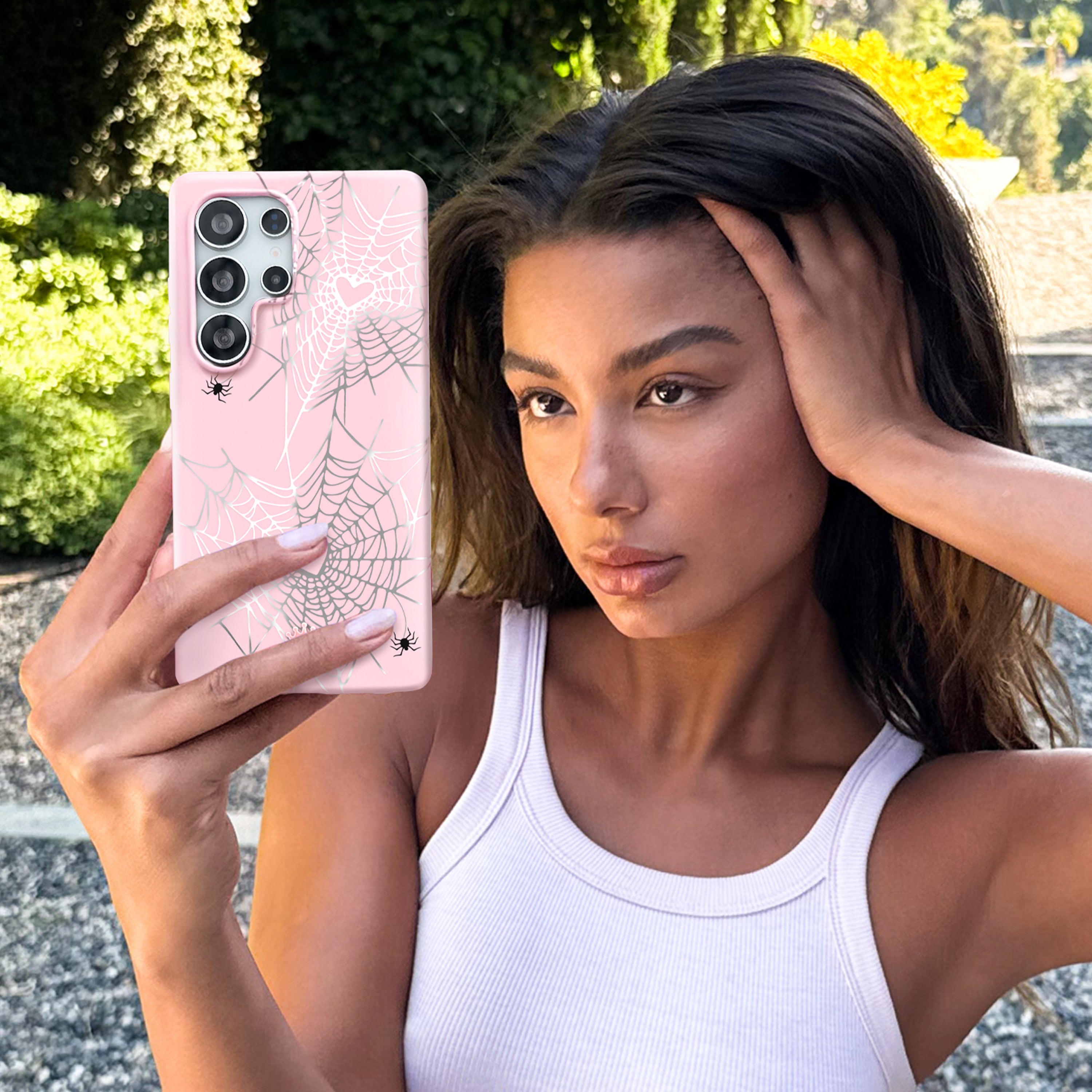 Happy Halloween! This protective case features silver chrome spider webs and small black spiders on an peachy pink base.