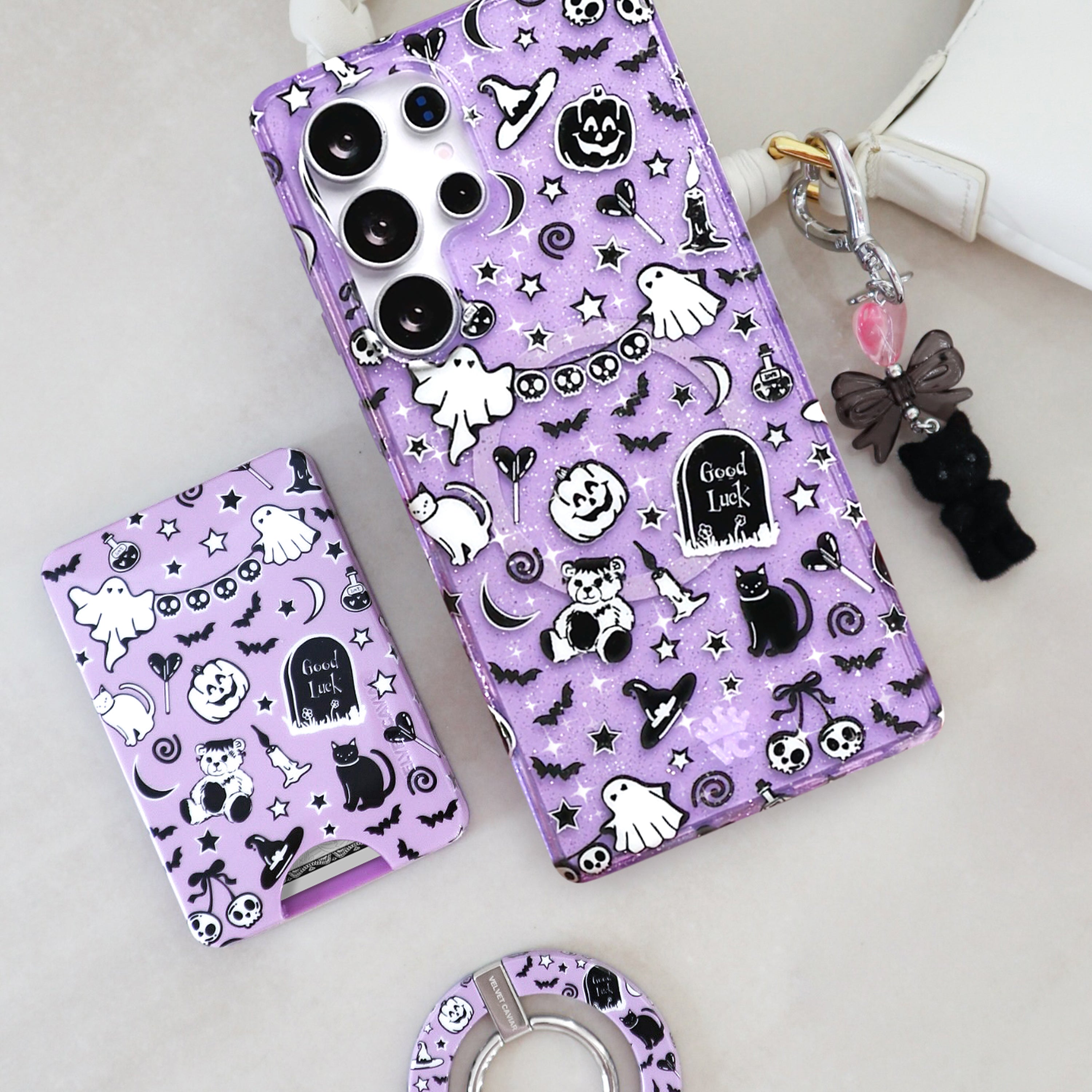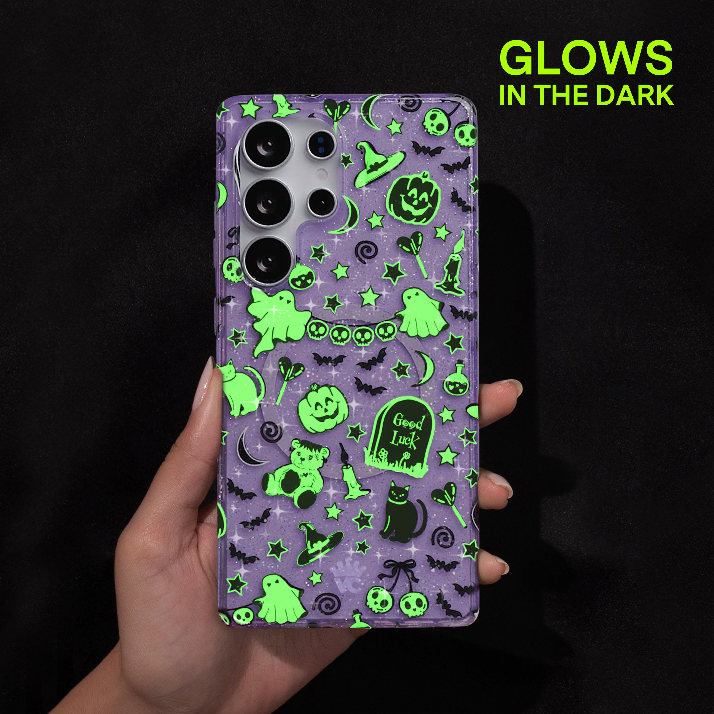 Happy Halloween! This glow in the dark protective case features ghosts, pumpkins, bats, cats, and witches hats all on a transparent purple case with silver glitter sprinkled into the base and bumper.