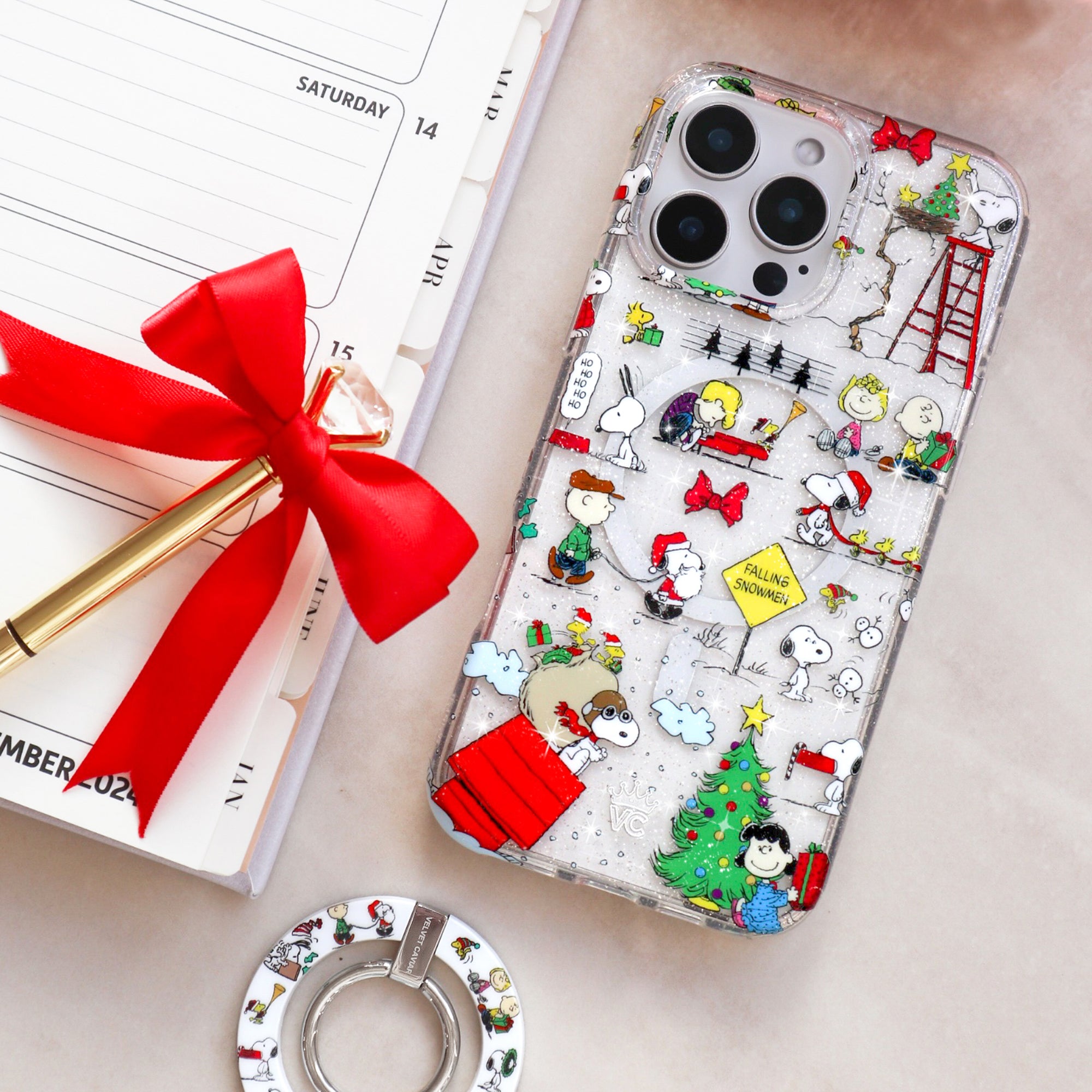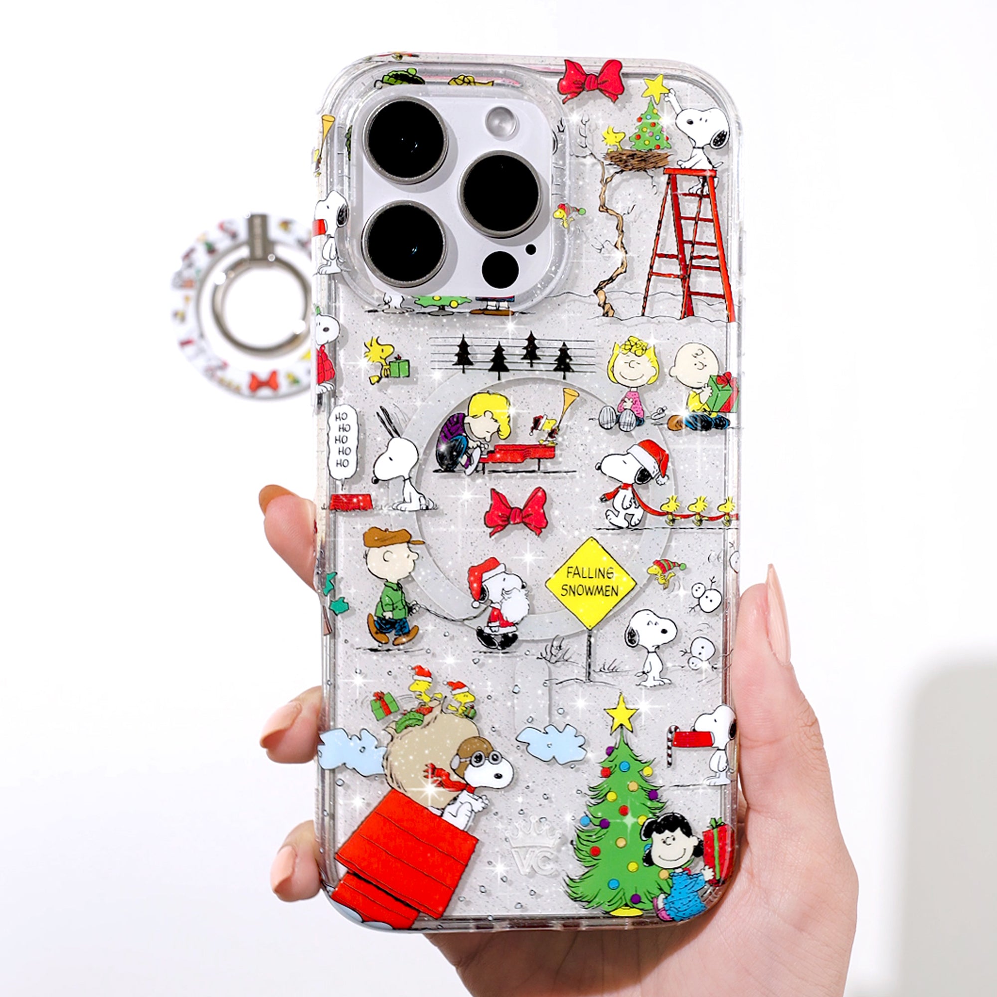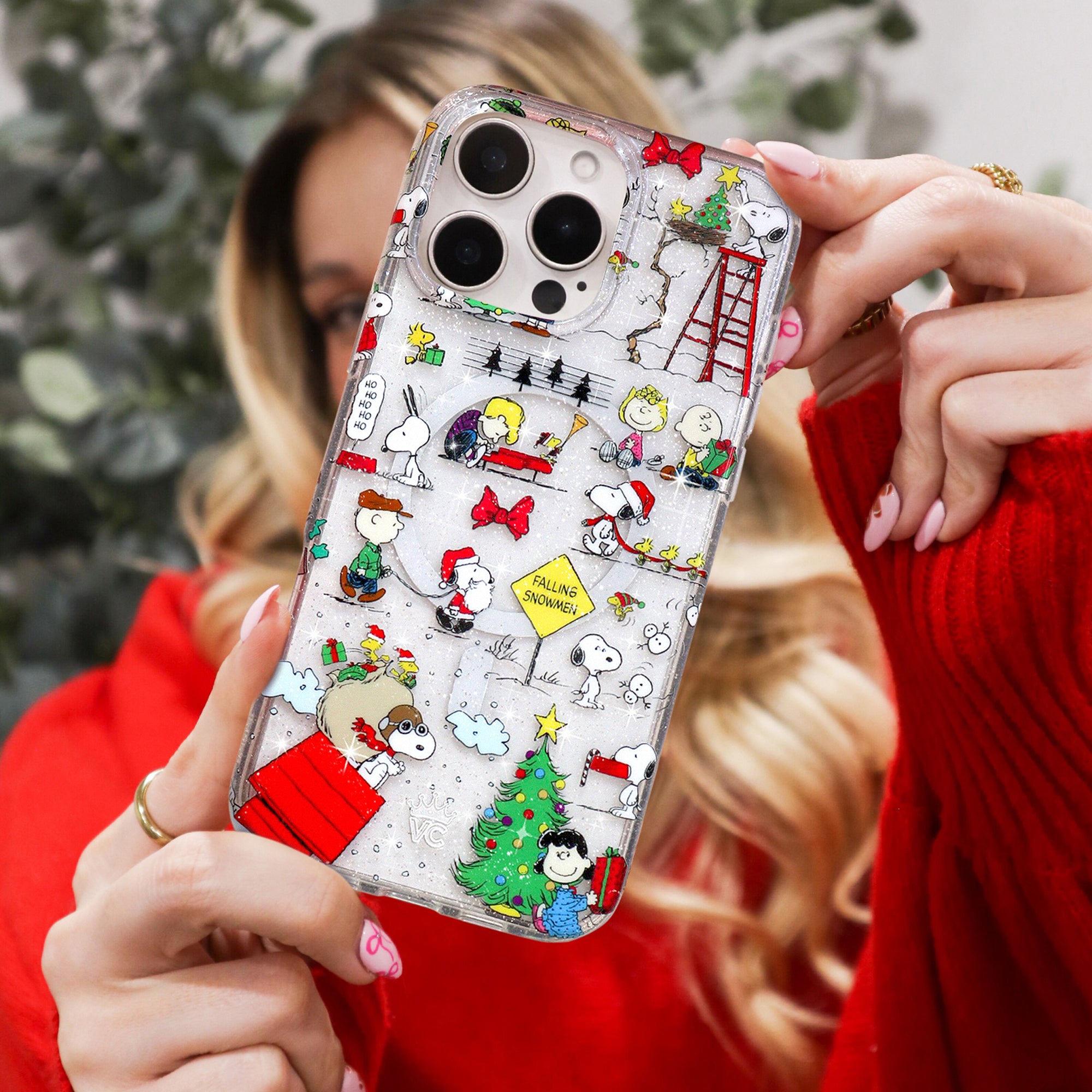 Merry Christmas, Charlie Brown! Happy Holidays from the entire Peanuts gang, all featured on this MagSafe clear case with silver glitter sprinkled into the base and bumper.