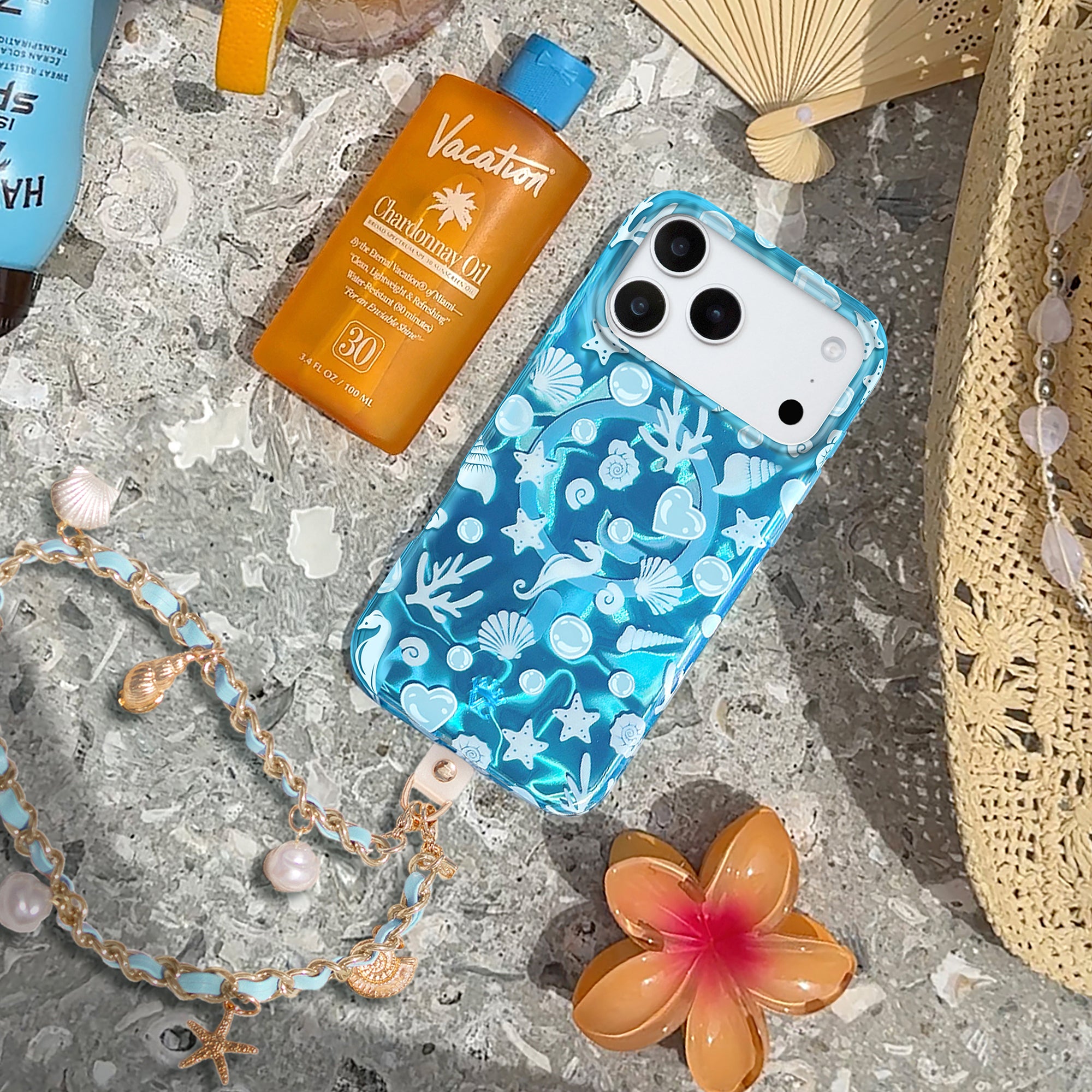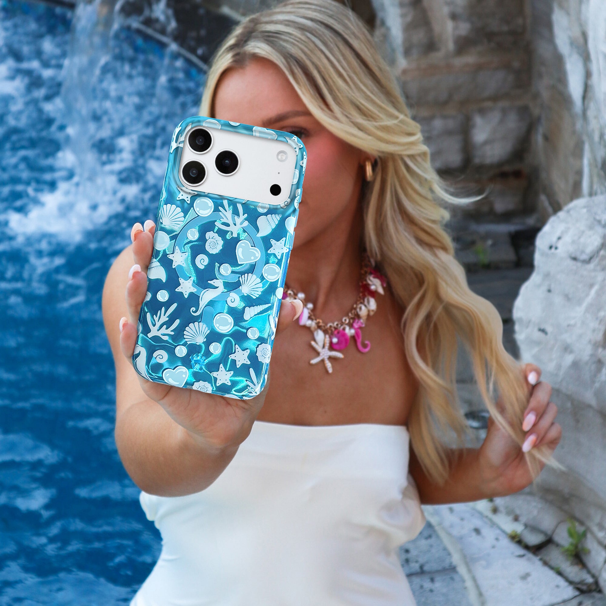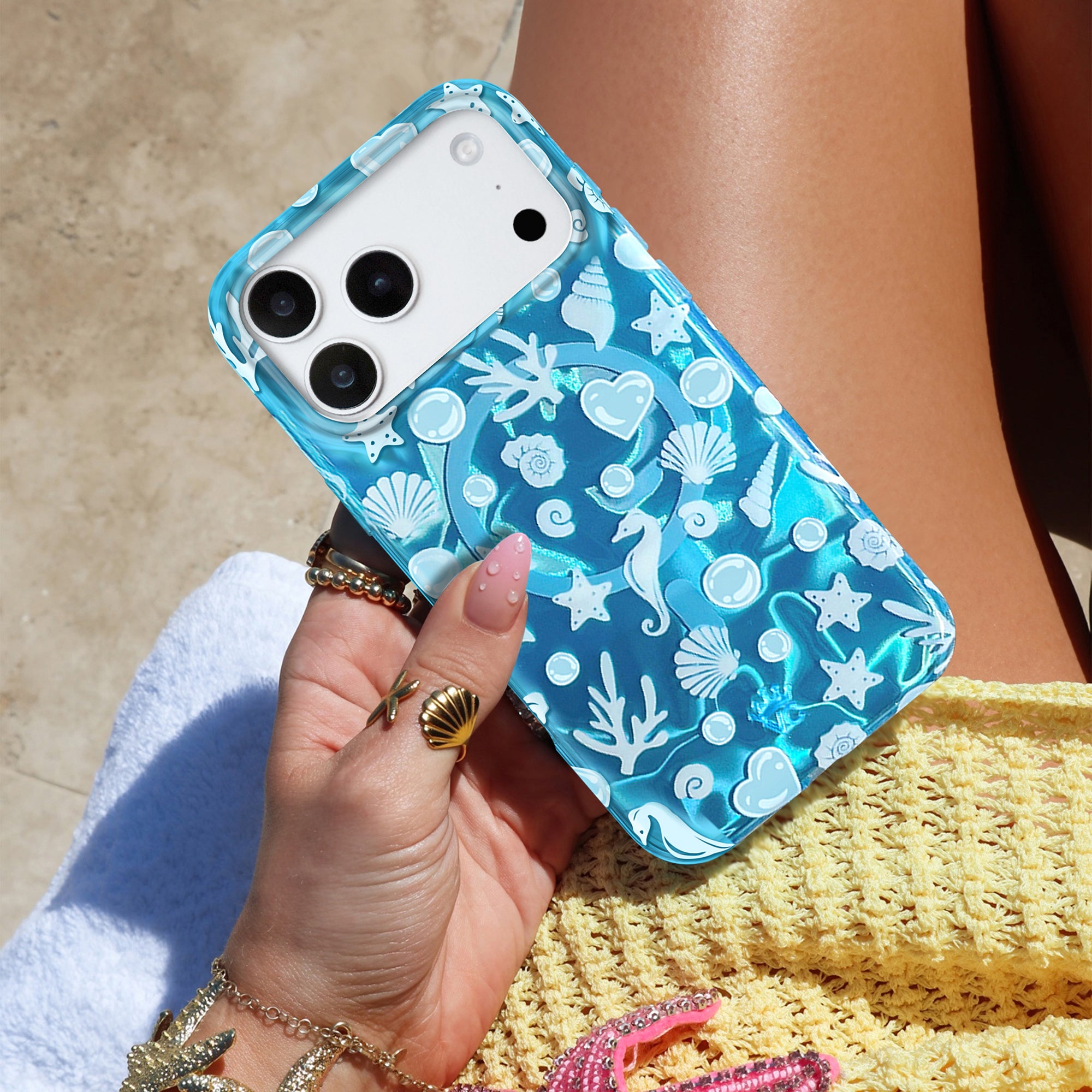 Make a splash! This stunning MagSafe phone case features white seashells, starfish, and seahorses on an aqua blue base with a holographic wave effect throughout.