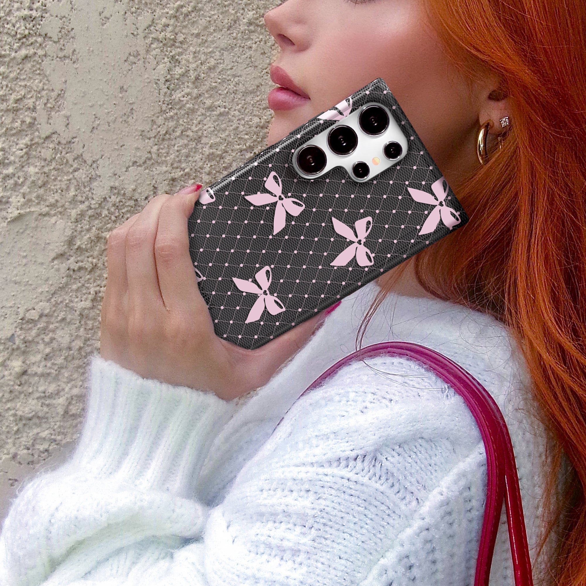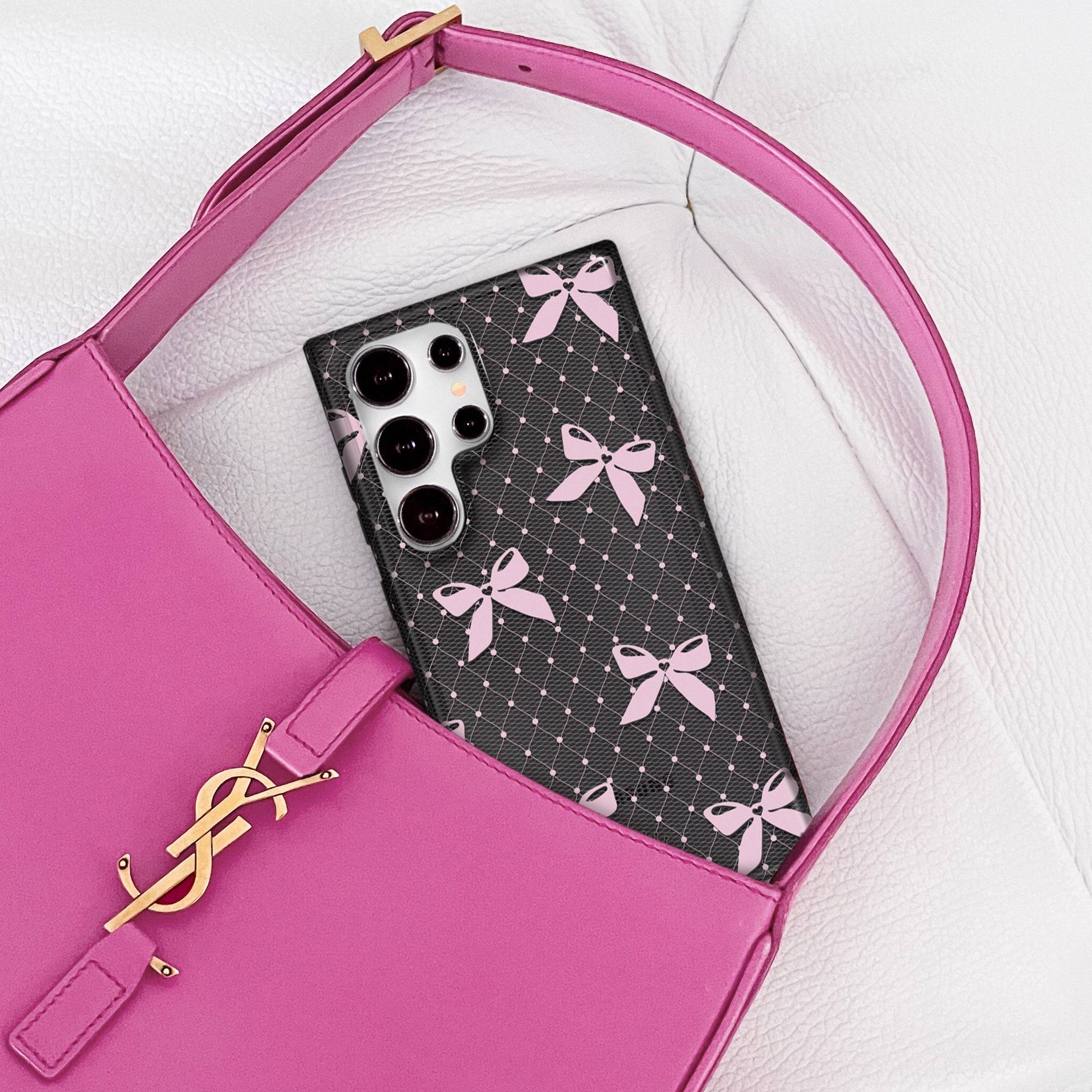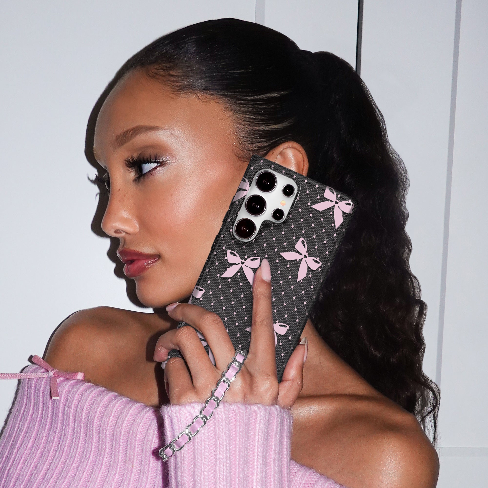 Coquette Core! This Limited Edition case features a transparent dark grey base and glossy baby pink lace and bow details.