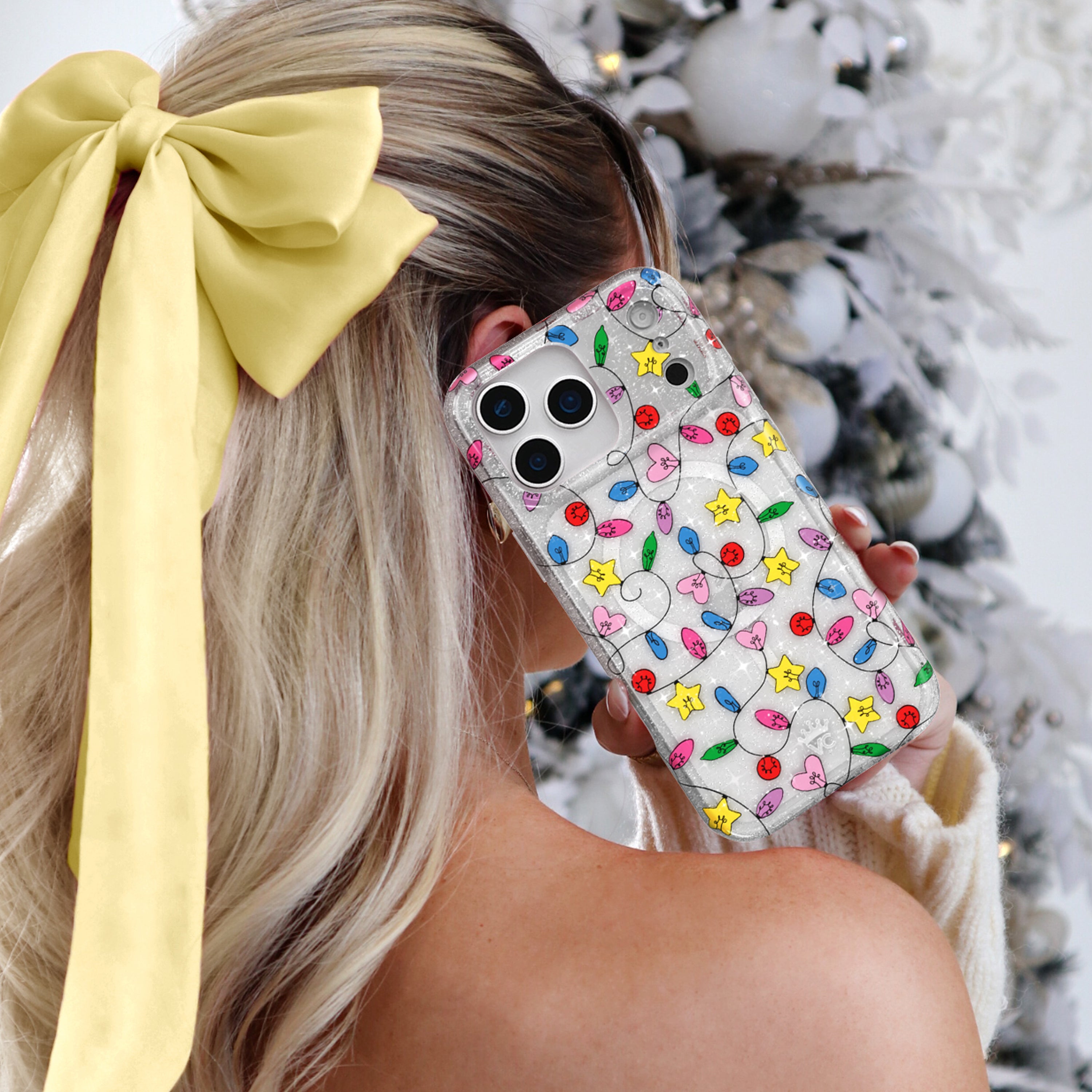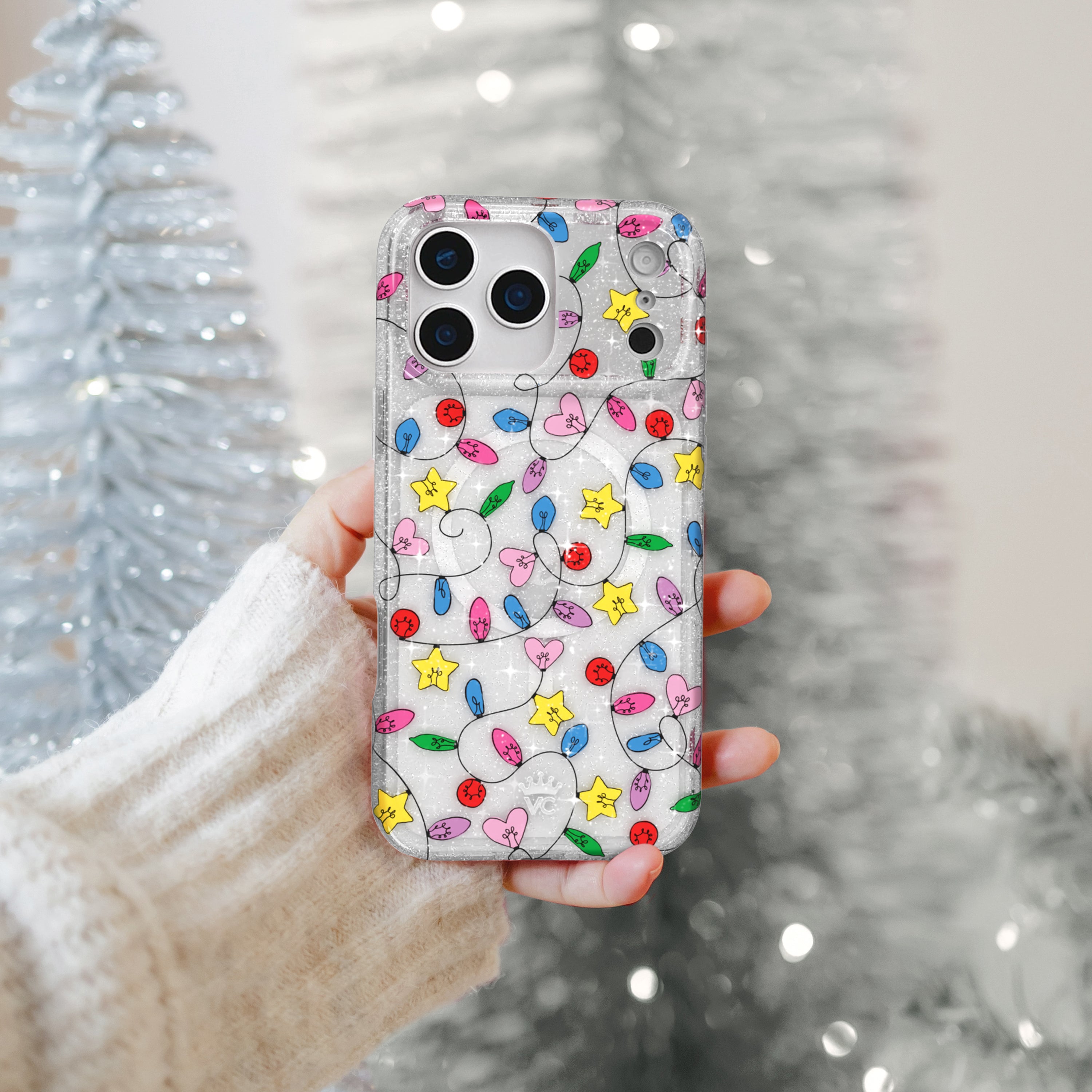 Happy Holidays! This MagSafe case features vintage holiday string lights on a clear case with silver glitter sprinkled throughout the base and bumper. This case is part of our Limited Edition Holiday Dreams collection celebrating Christmas and Hanukkah.