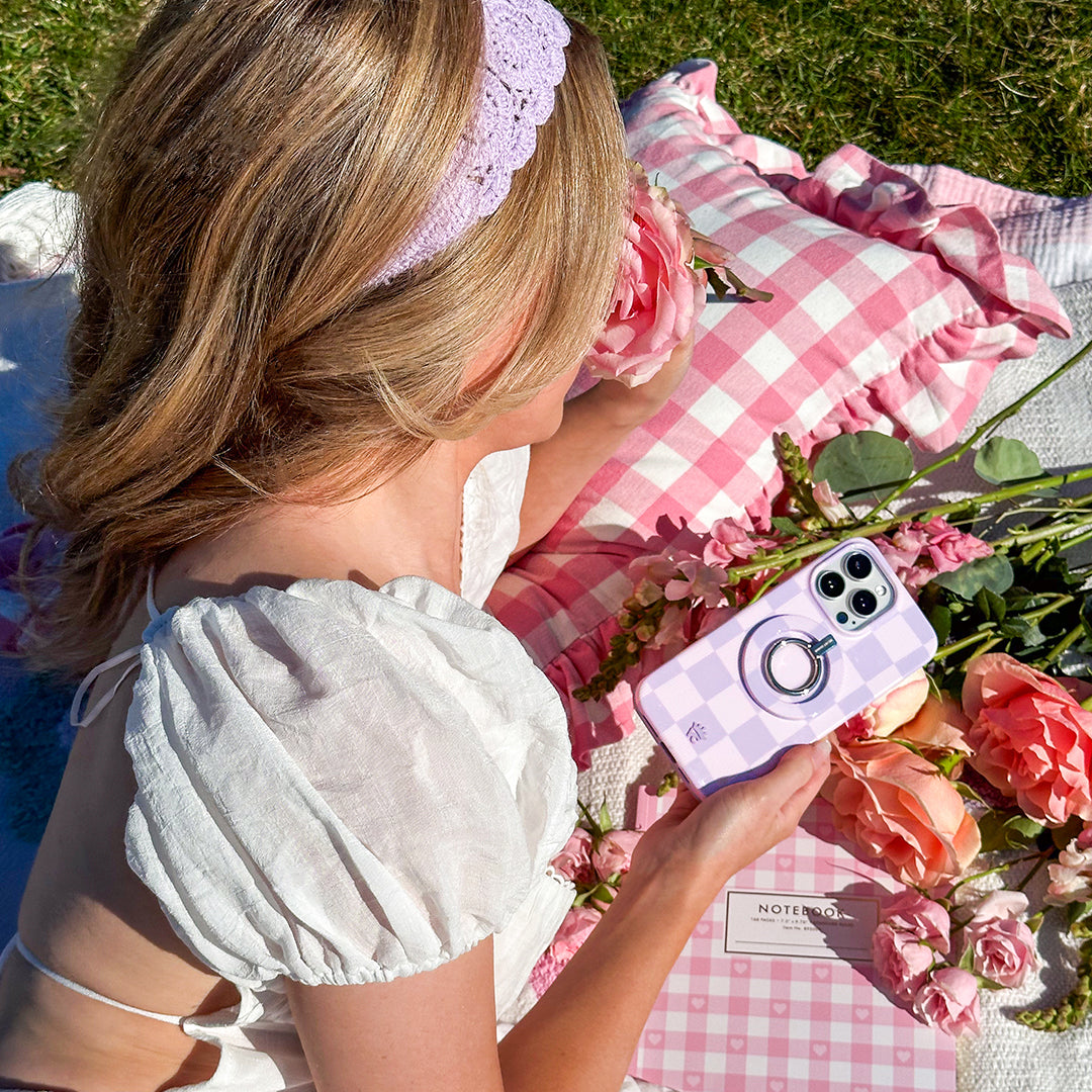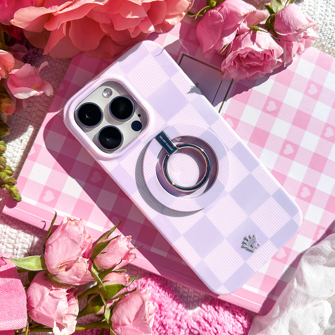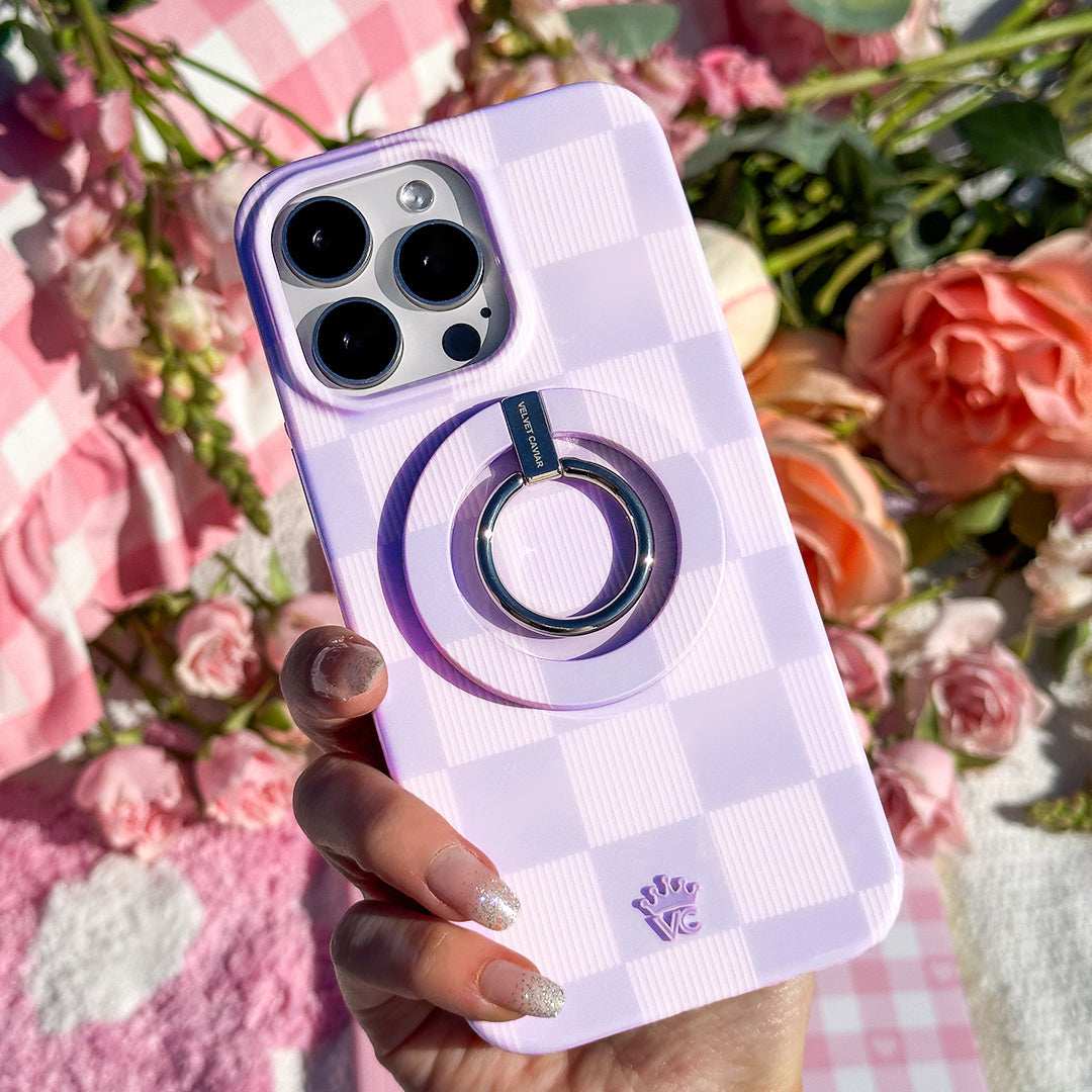 Check Please! This Limited Edition lilac purple MagSafe case is a total vibe with vintage inspired lines throughout the lighter checks.