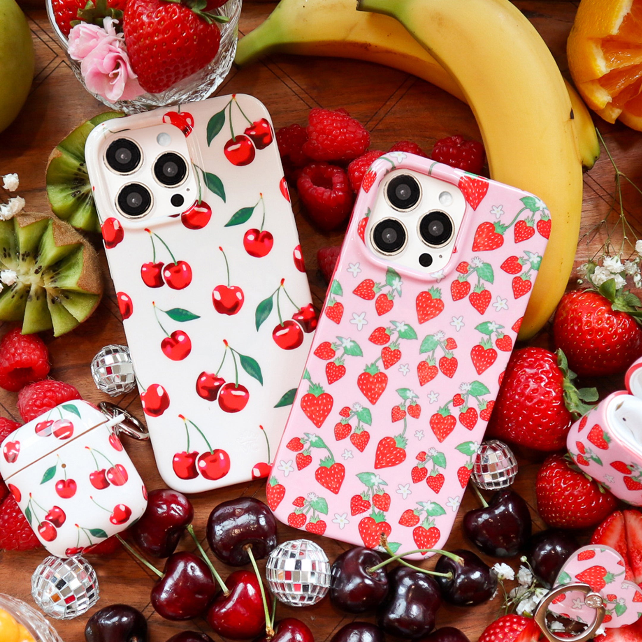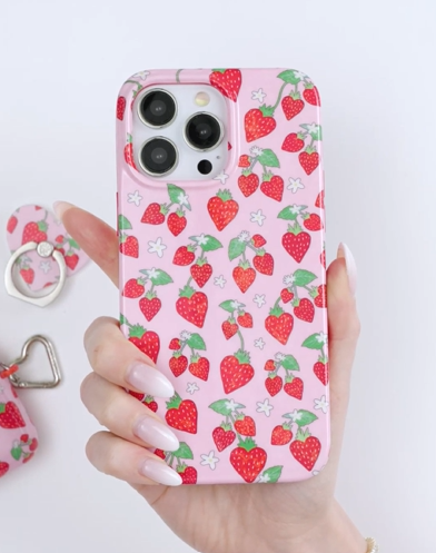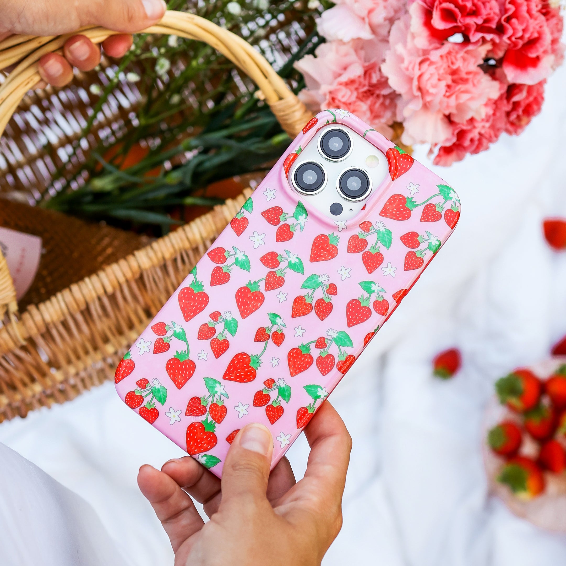 So berry sweet! This protective case features an array of heart shaped strawberries and blossoms on a glossy pink base.