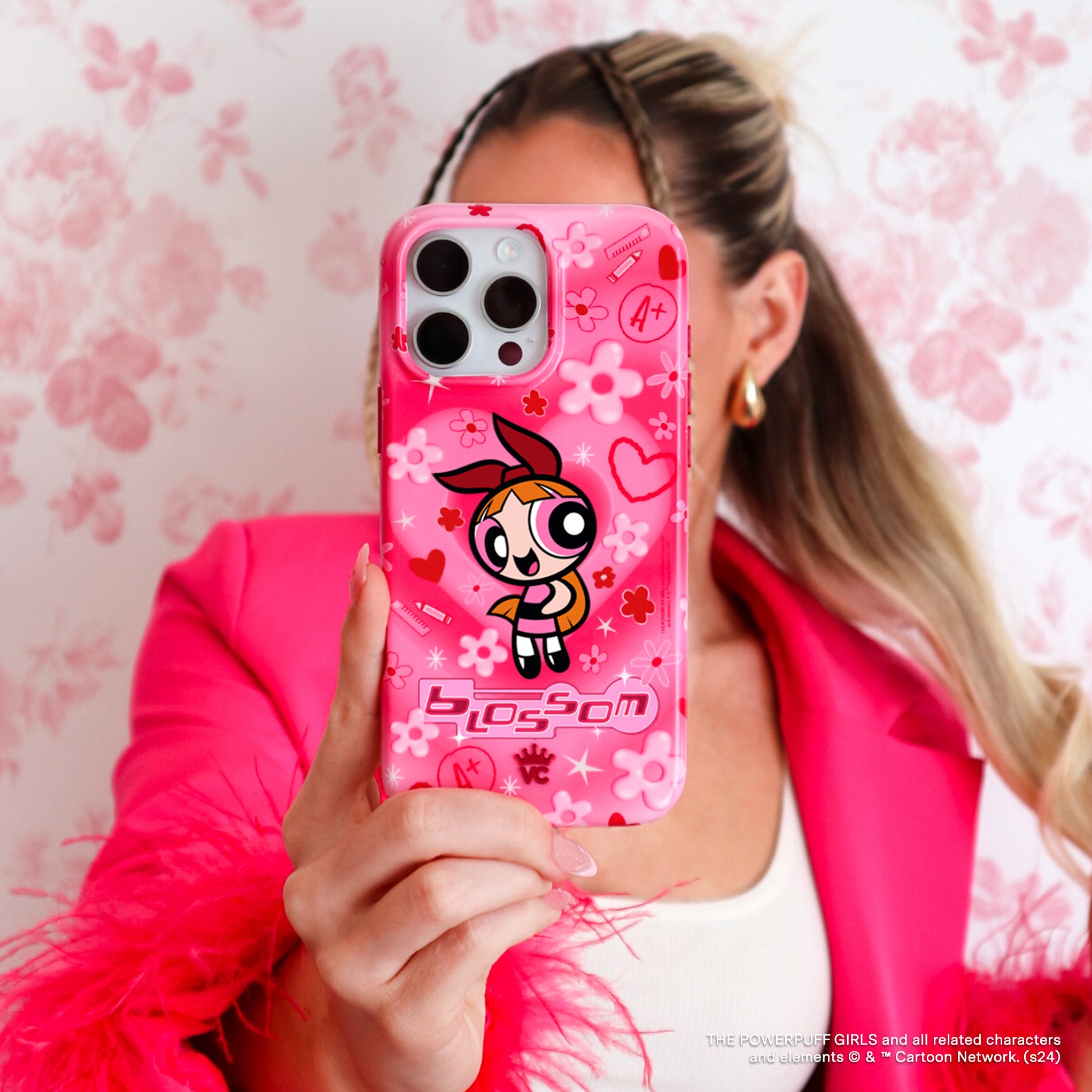 It's Blossom! This glossy MagSafe case features Blossom front and center with flowers and hearts sprinkled throughout all on a radiating pink and red heart background.