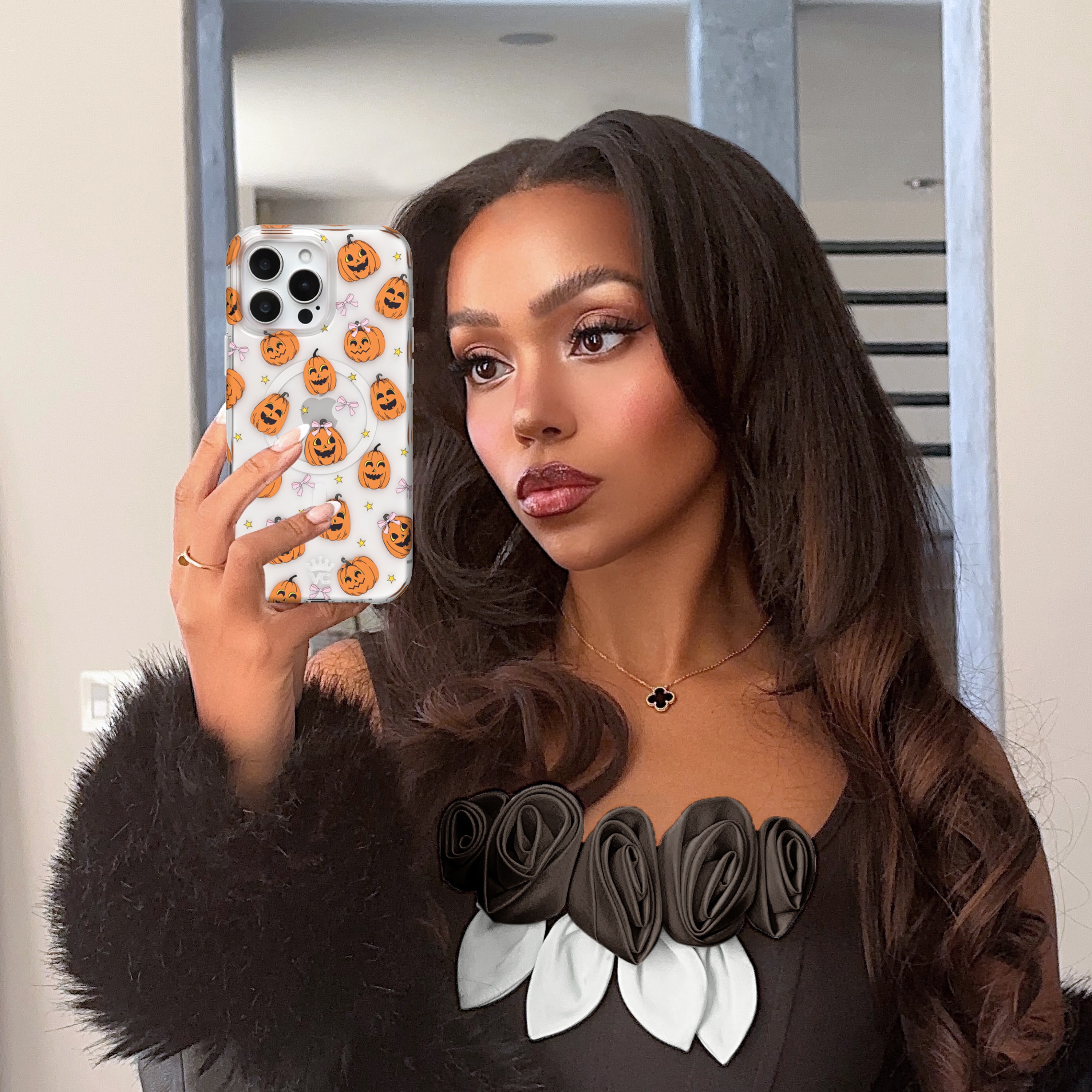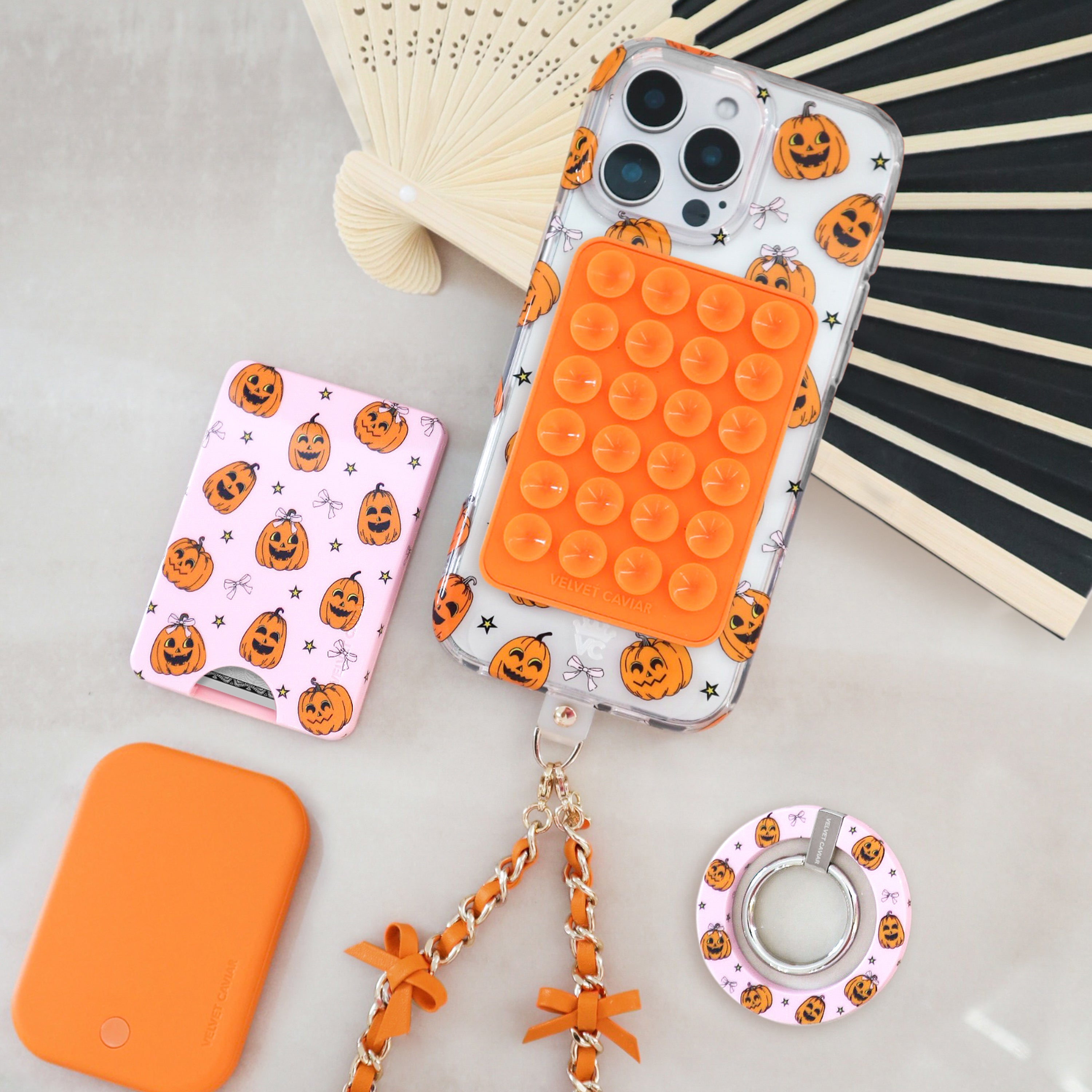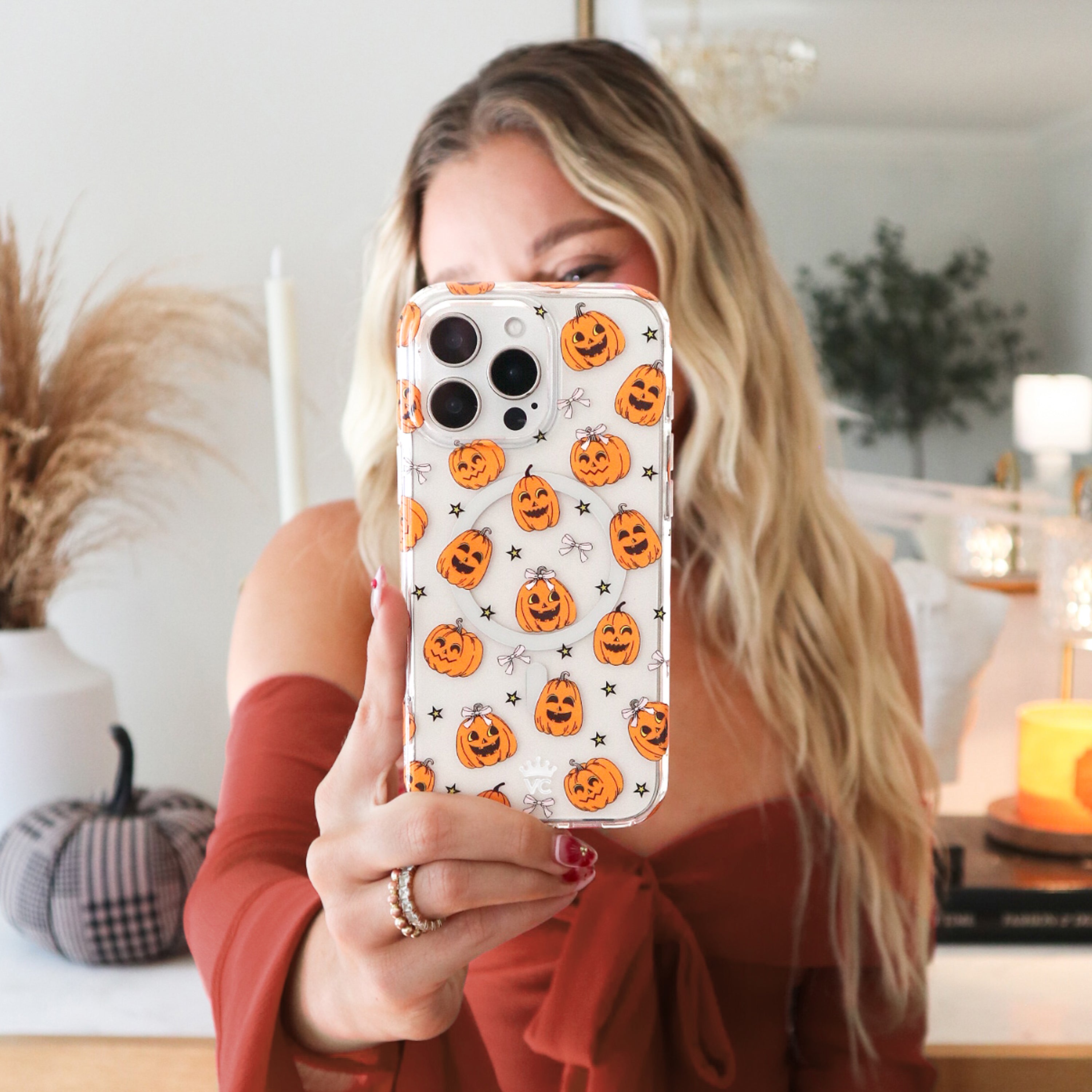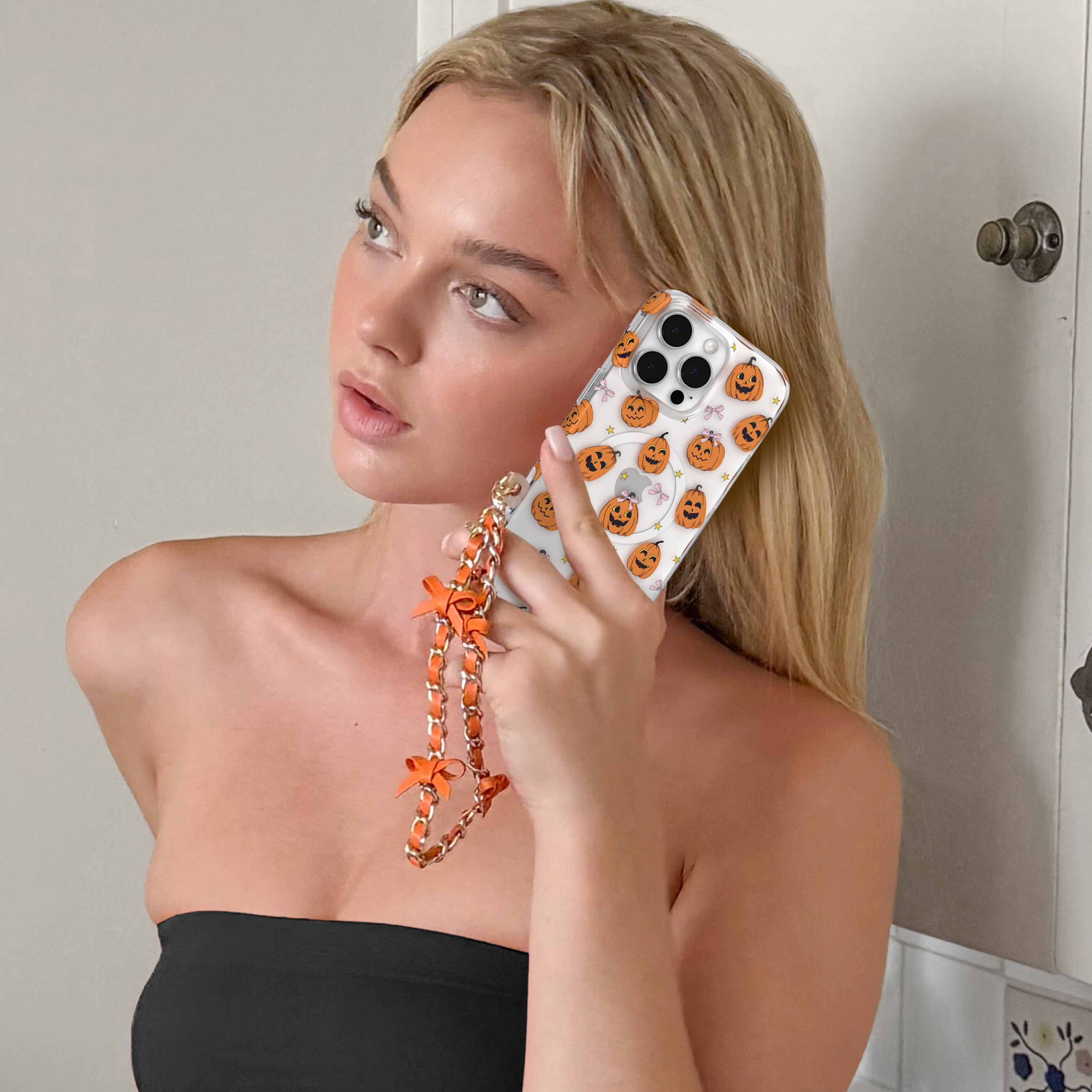 Happy Halloween! This MagSafe clear case features smiling jack-o-lantern pumpkins, small yellow stars, and soft pink bows throughout.