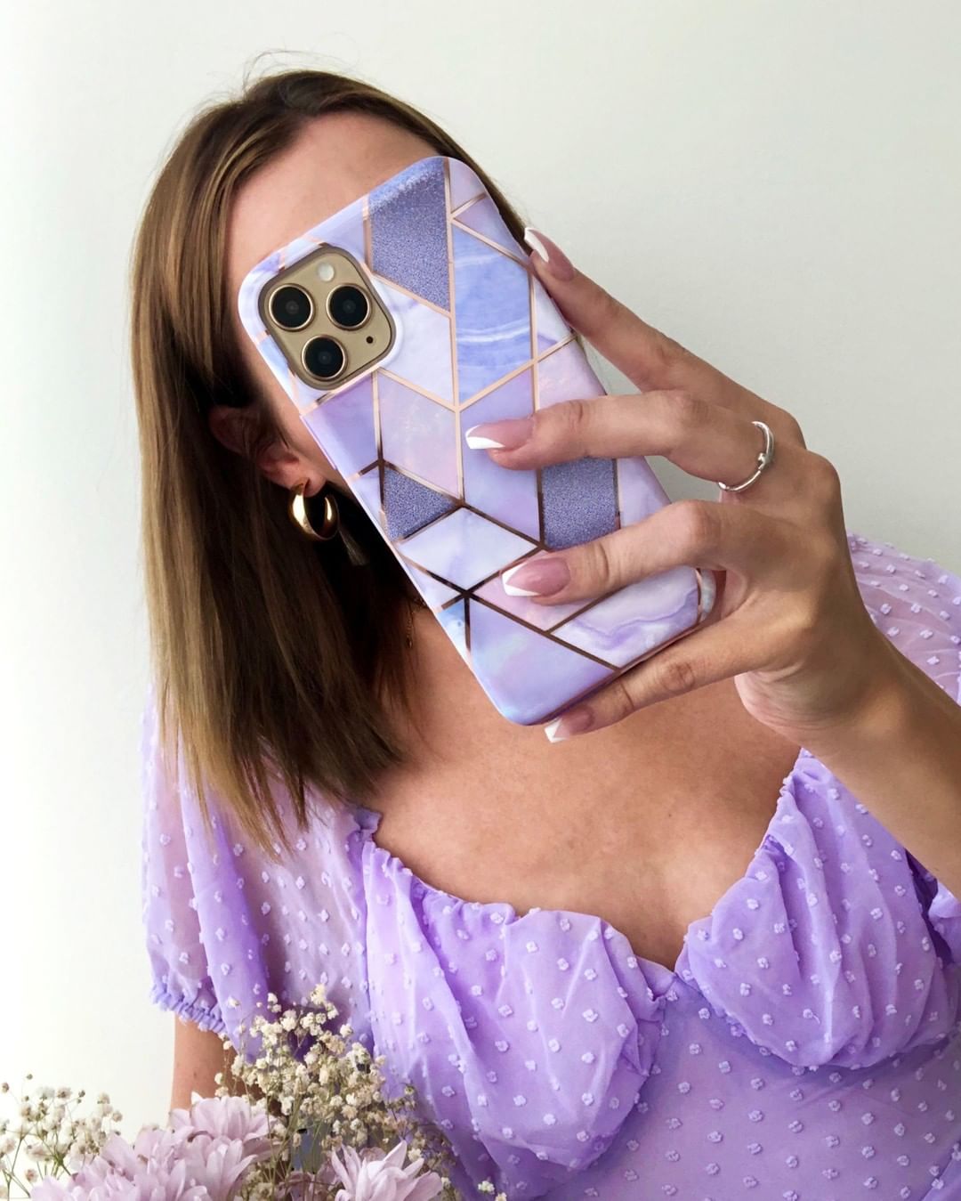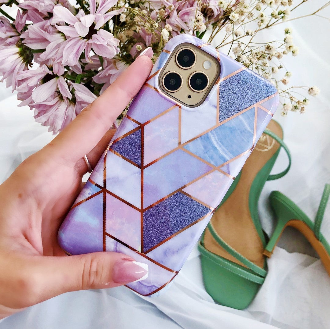 A purple beauty! Featuring a geometric pastel purple marble pattern, outlined in rose gold chrome.