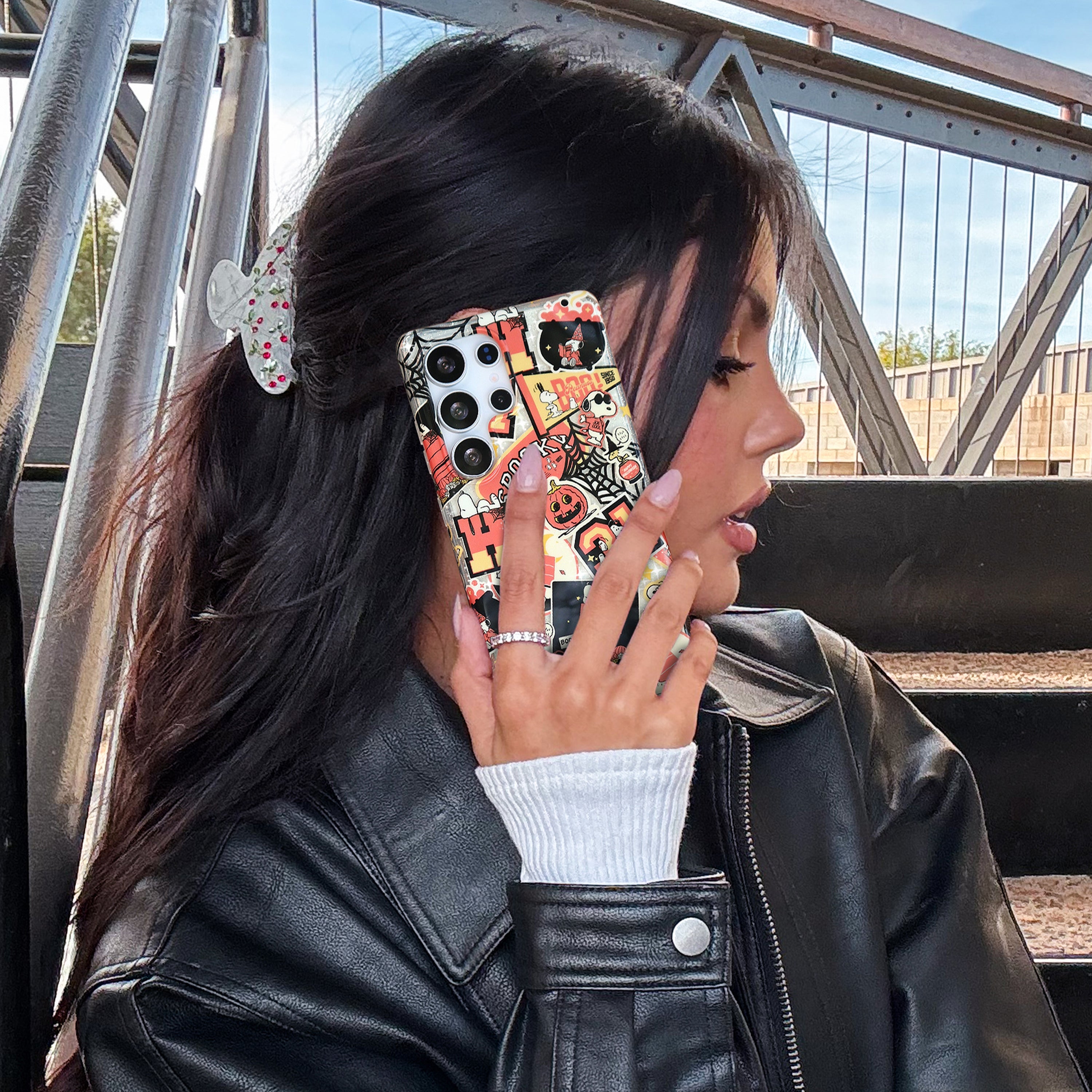VC loves Snoopy! This protective case features Snoopy all over in a varsity inspired Halloween patchwork design on a clear case with silver glitter sprinkled into the base and bumper.
