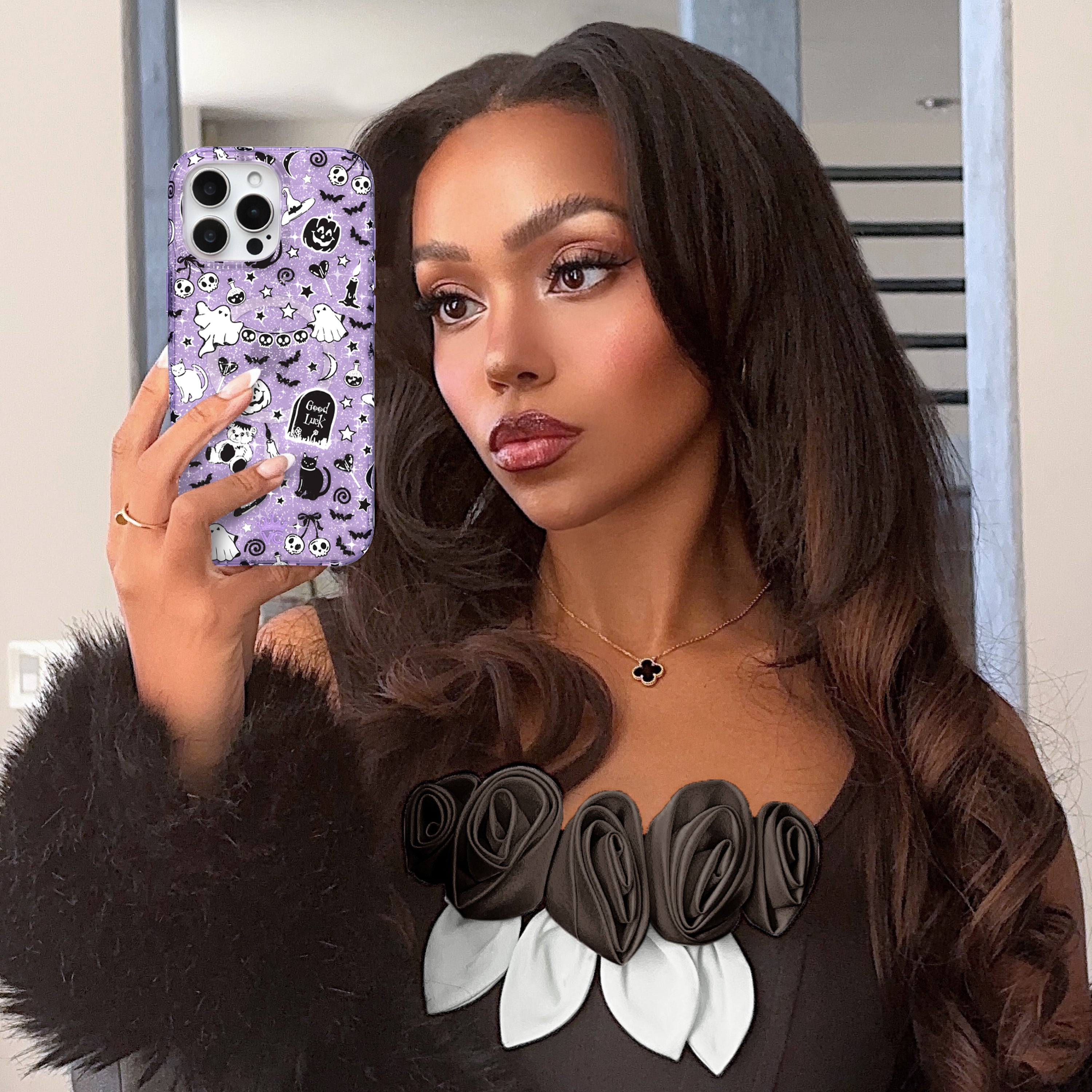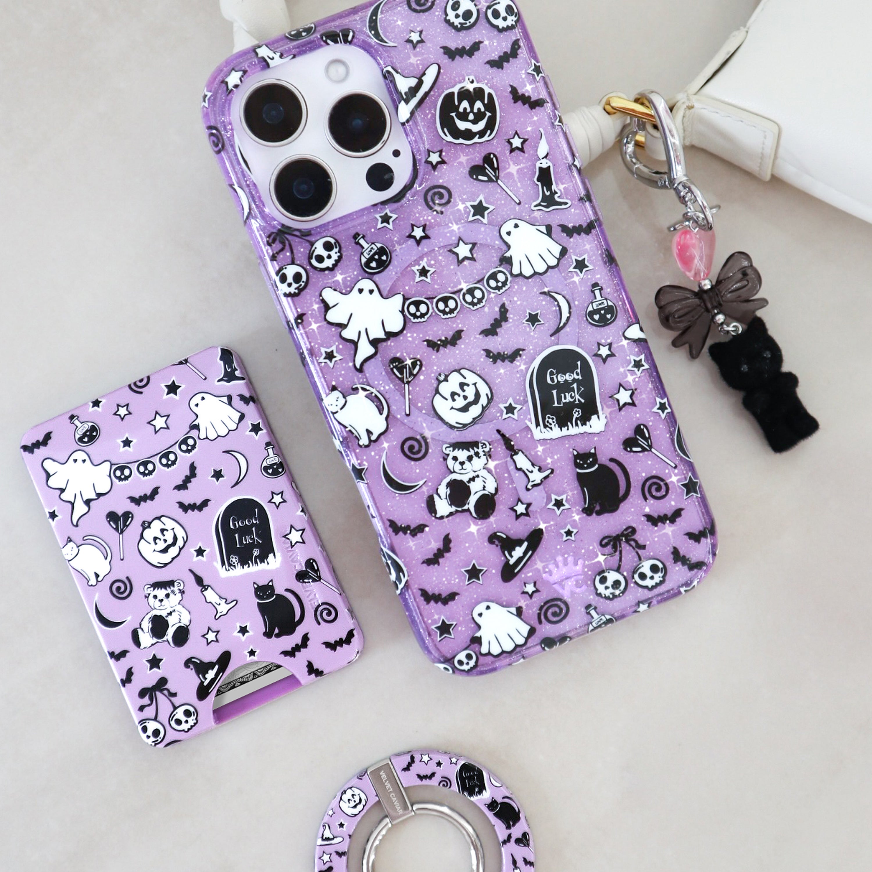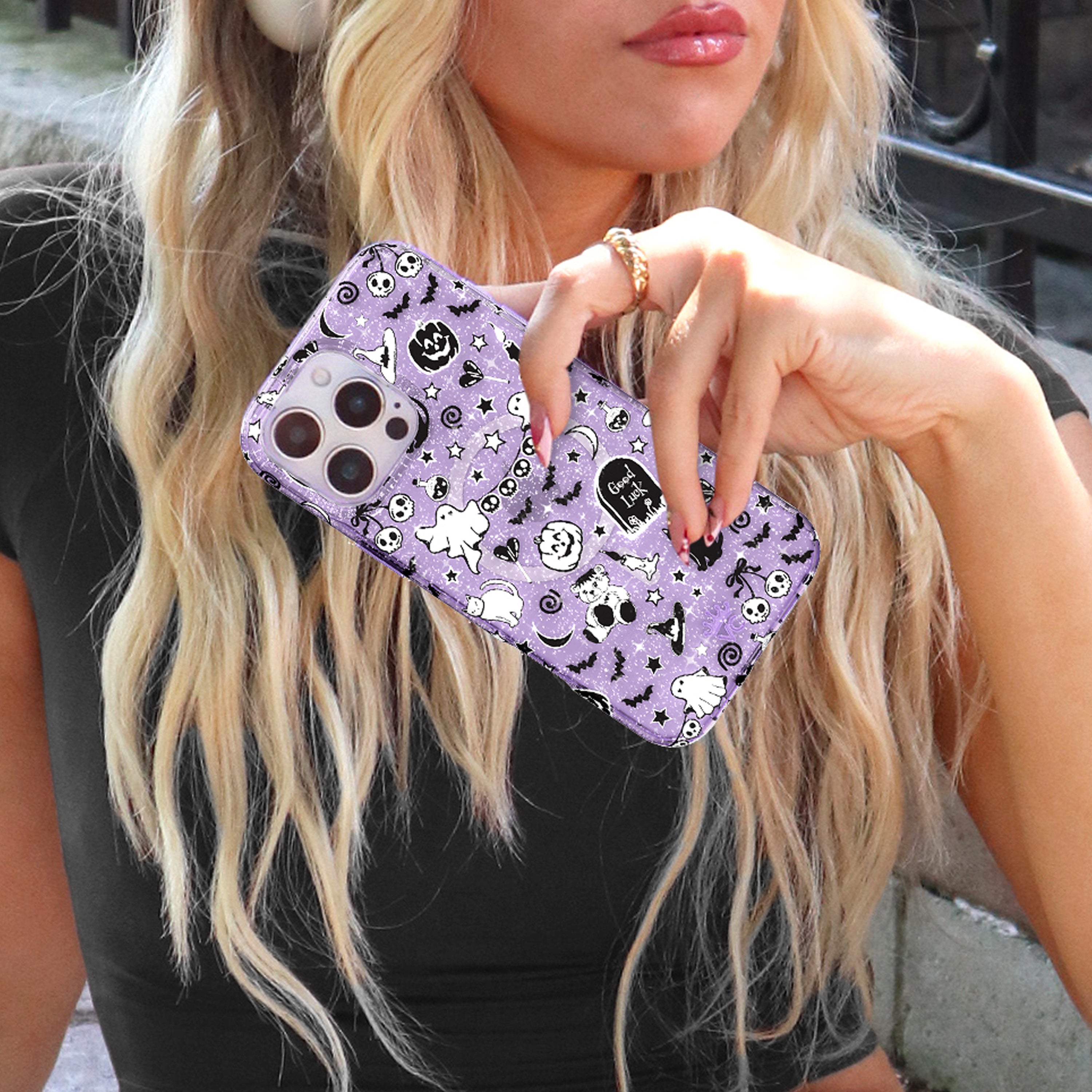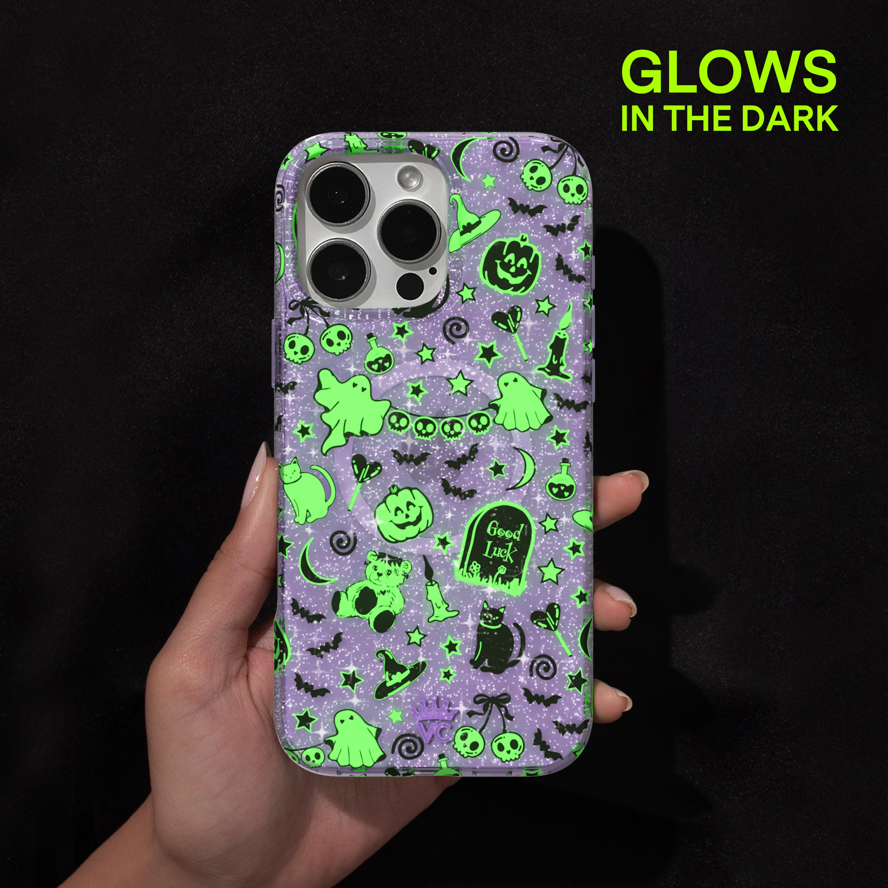 Happy Halloween! This glow in the dark MagSafe case features ghosts, pumpkins, bats, cats, and witches hats all on a transparent purple case with silver glitter sprinkled into the base and bumper.