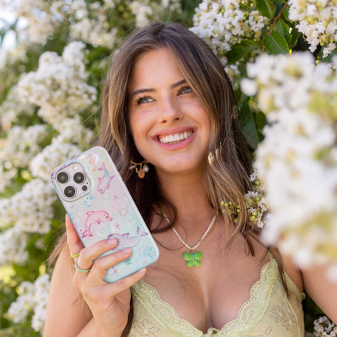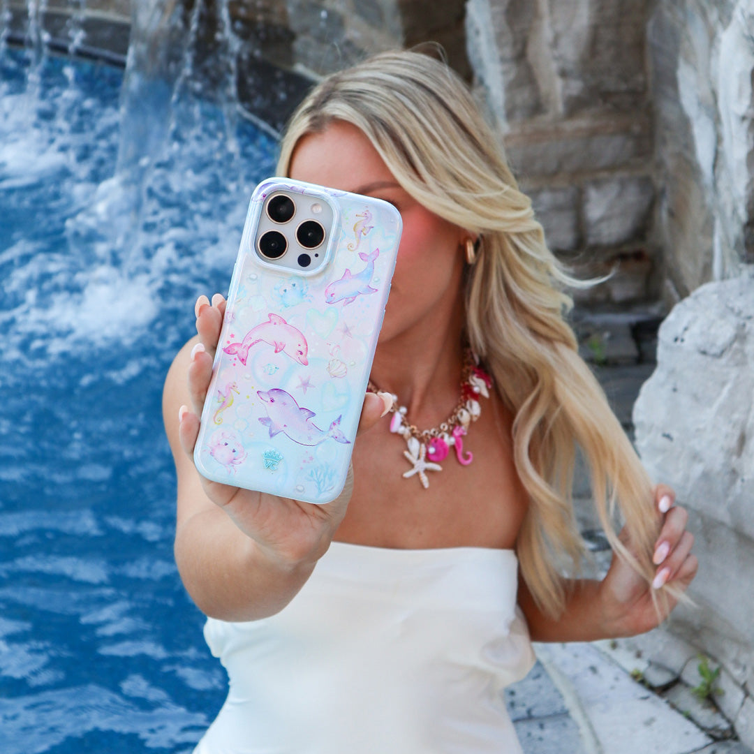 Make a splash! This MagSafe phone case features adorable dolphinson an iridescent aqua base with seashells and bubbles throughout.