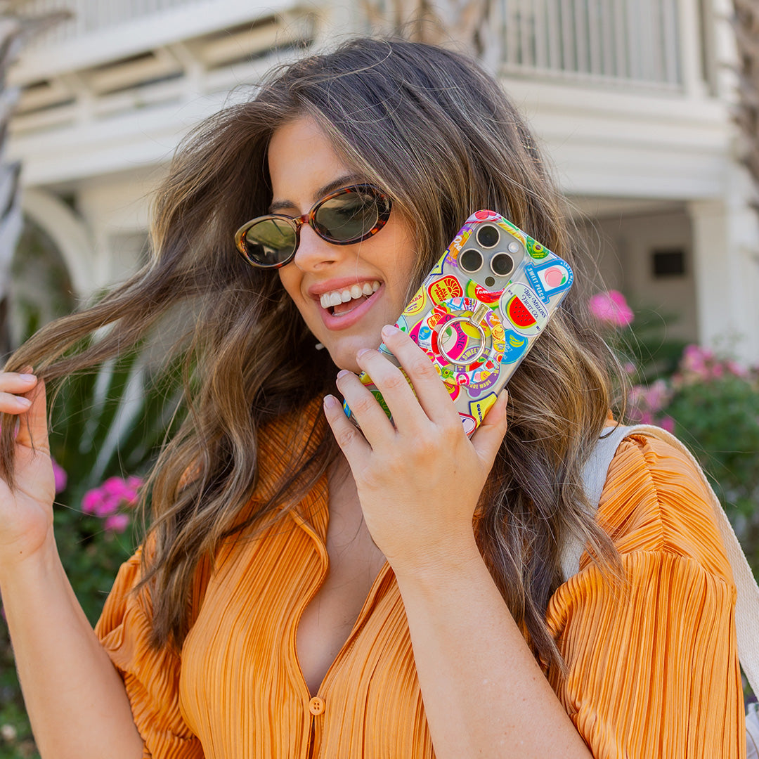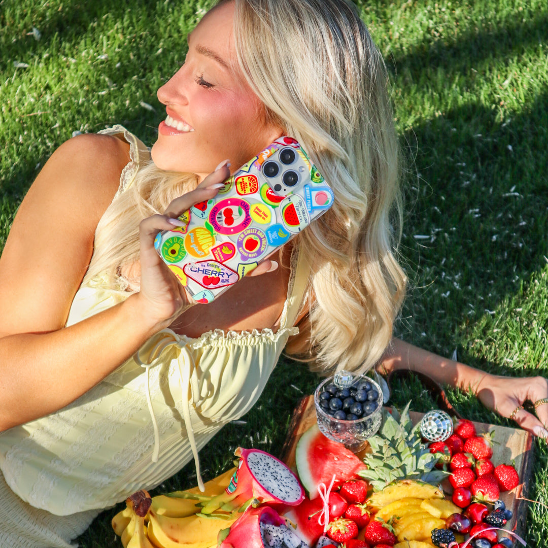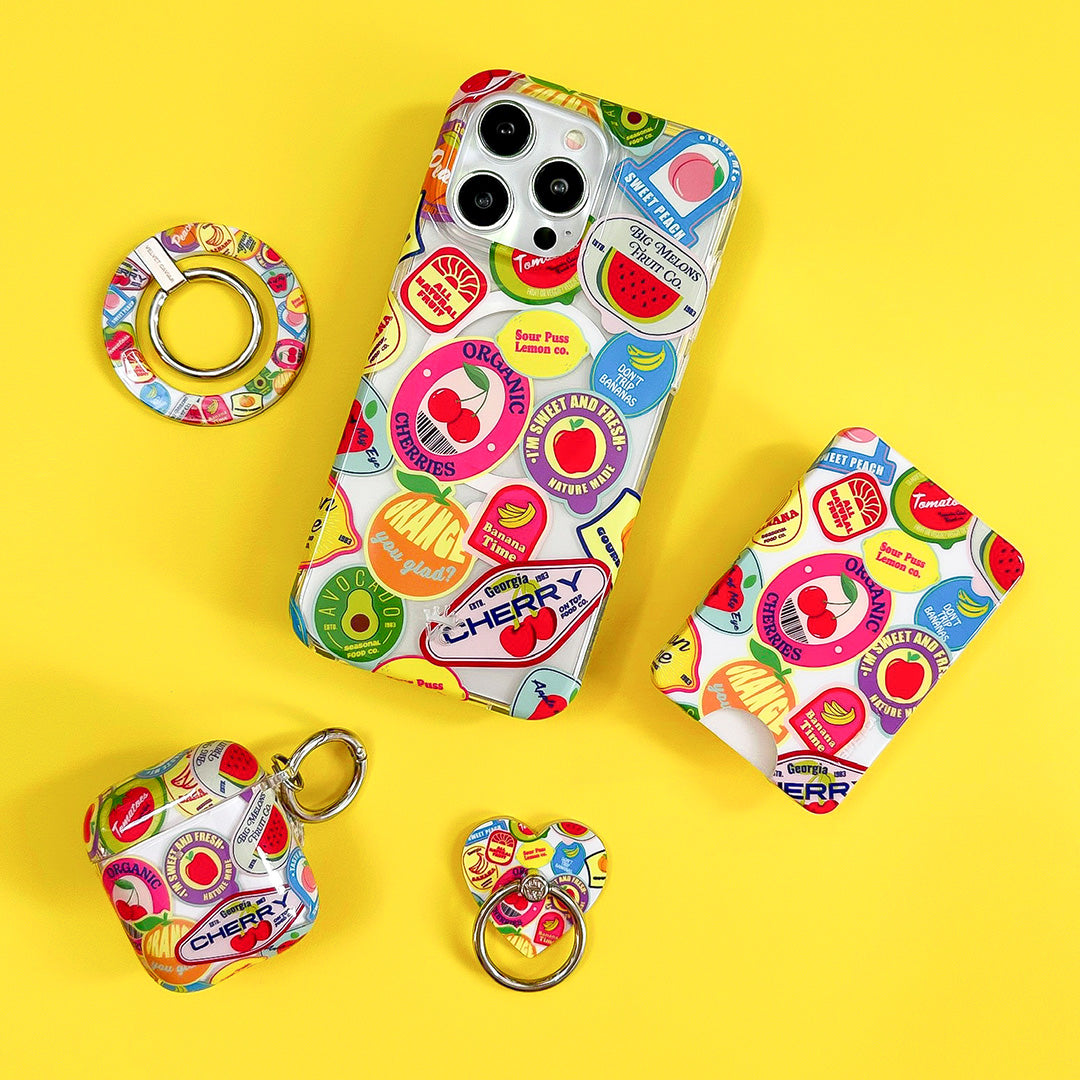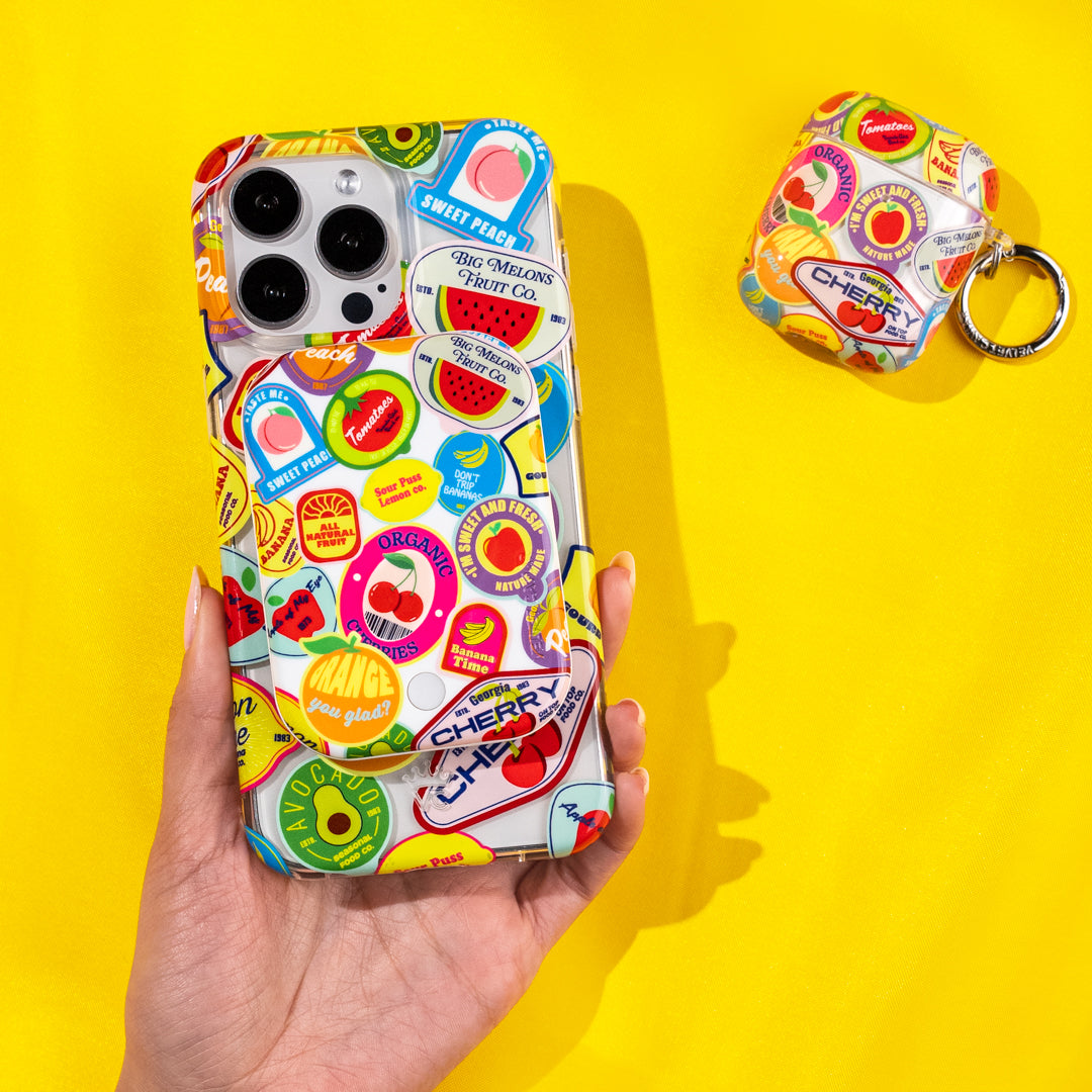 Juicy Fruits! This Limited Edition MagSafe case features an array of farmer's marketinspired fruit stickers on on a glossy clear base.
