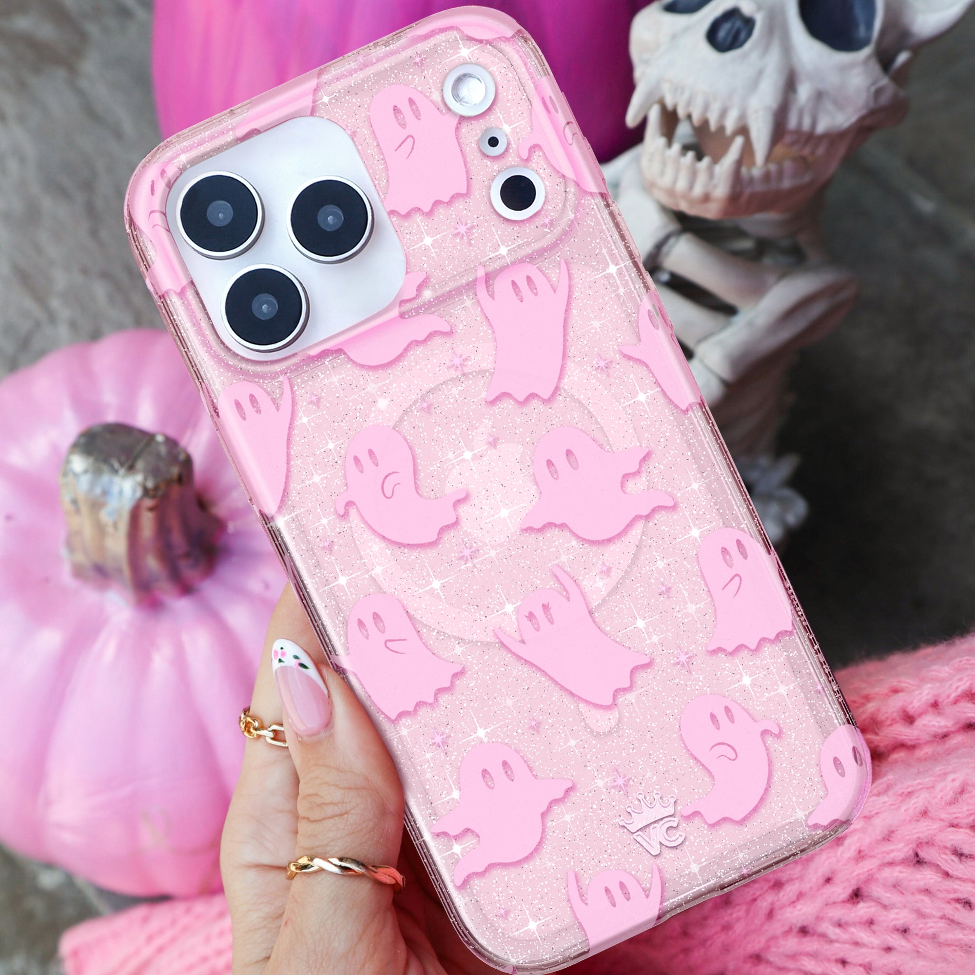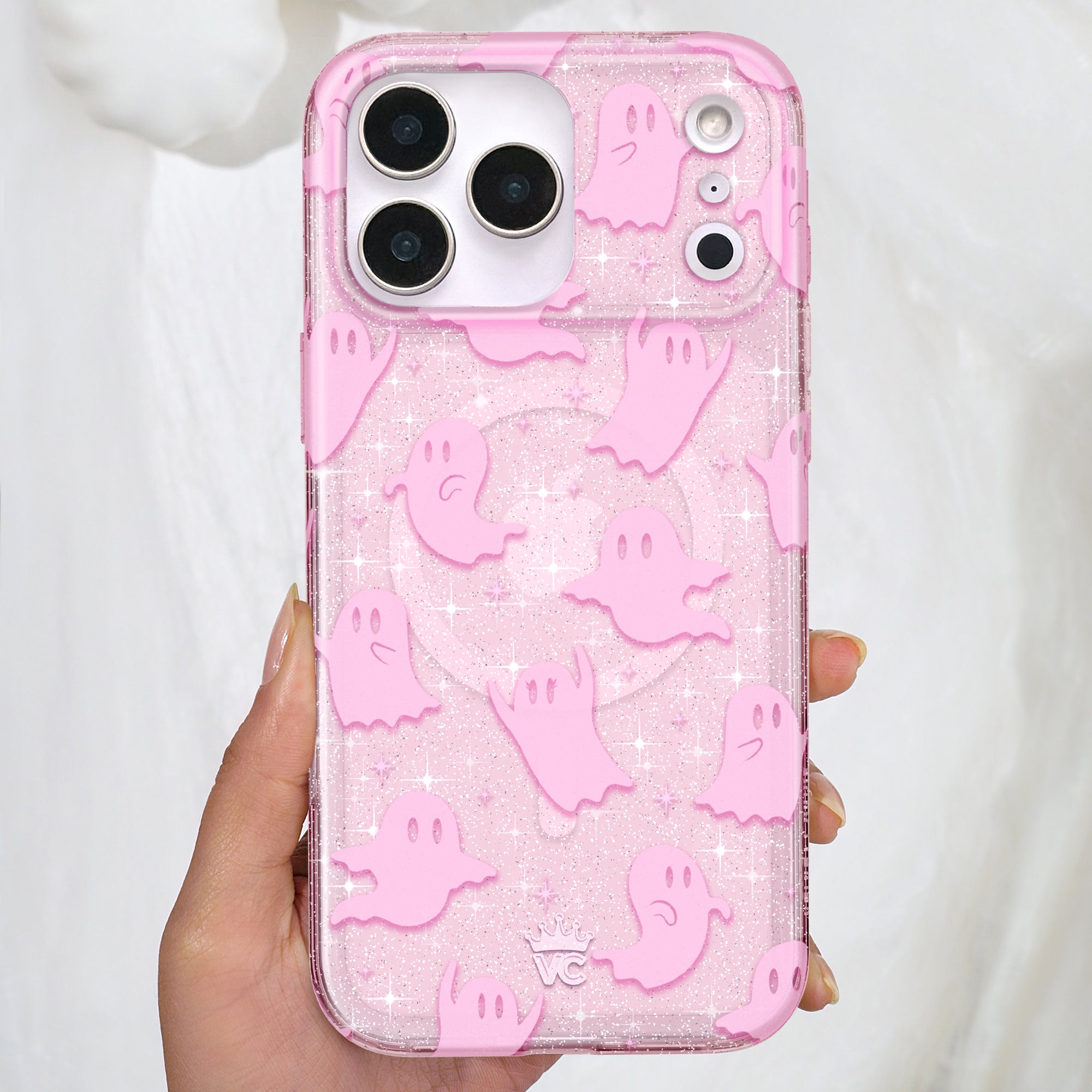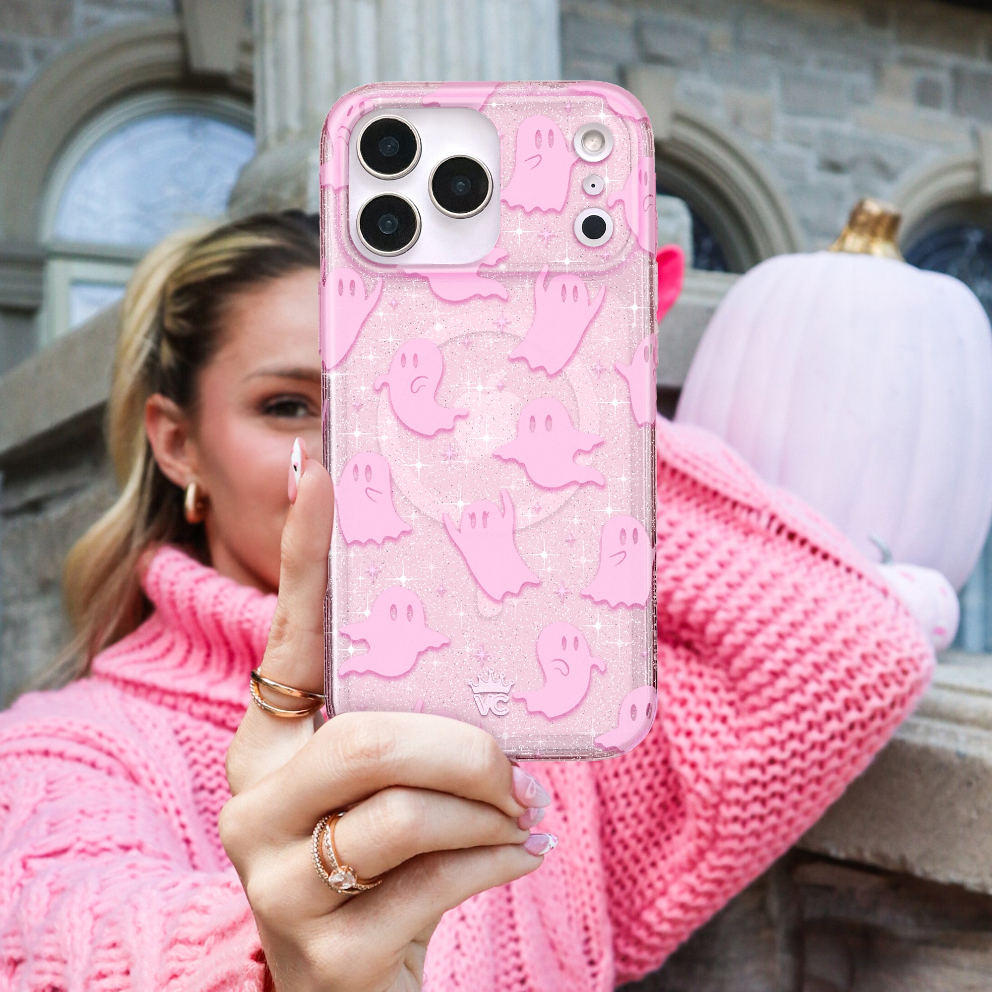 Happy Halloween! This Limited Edition MagSafe case features our iconic friendly ghosts in a new bubblegum pink shade on a clear pink case with silver glitter sprinkled into the base and bumper.