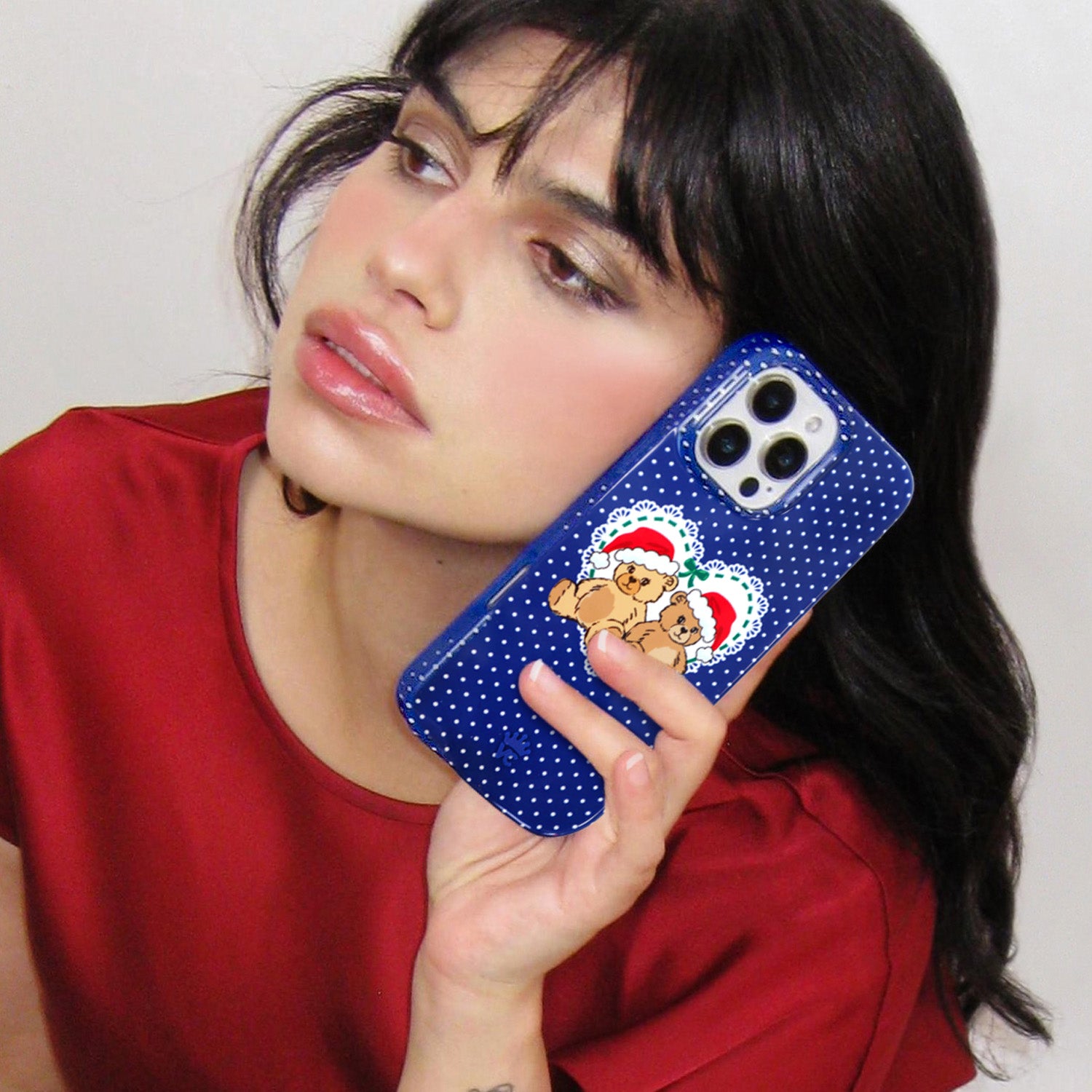 Happy Holidays! This MagSafe case features white polka dots on a navy base with two hand drawn teddy bears in Santa hats front and center. This case is part of our Limited Edition Christmasand Hanukkah Collection.